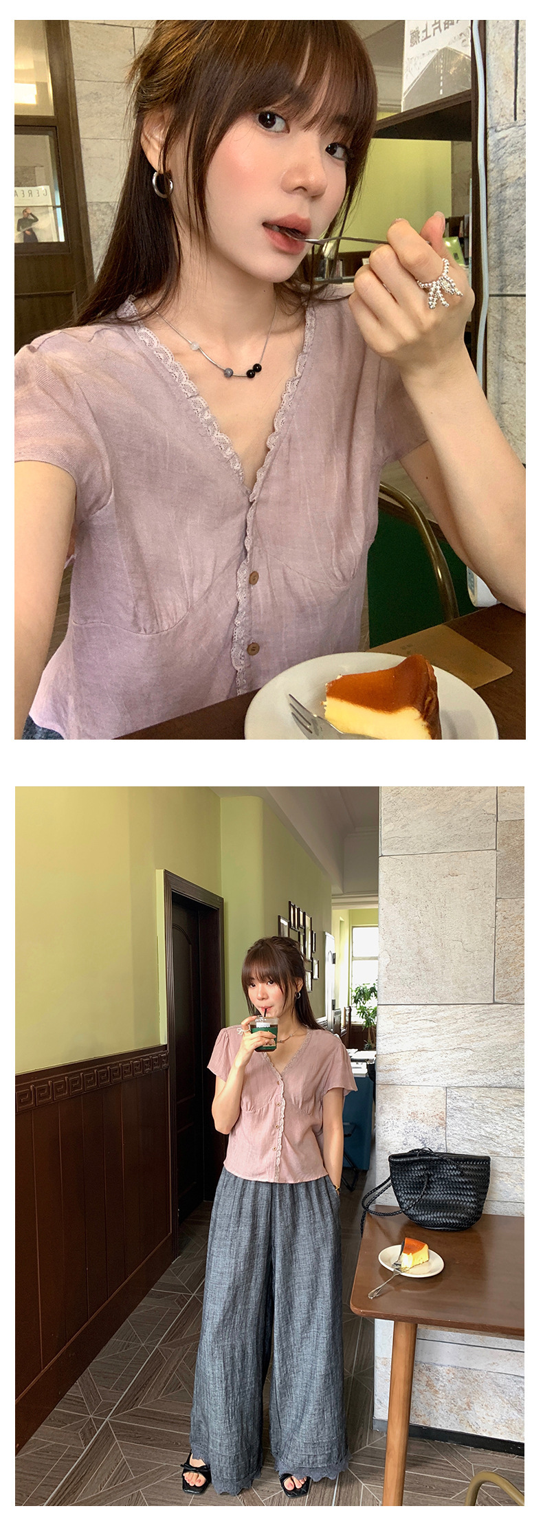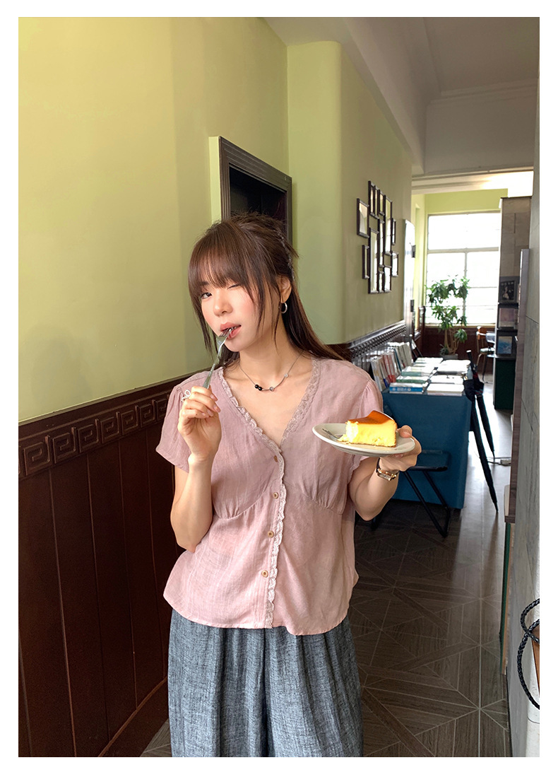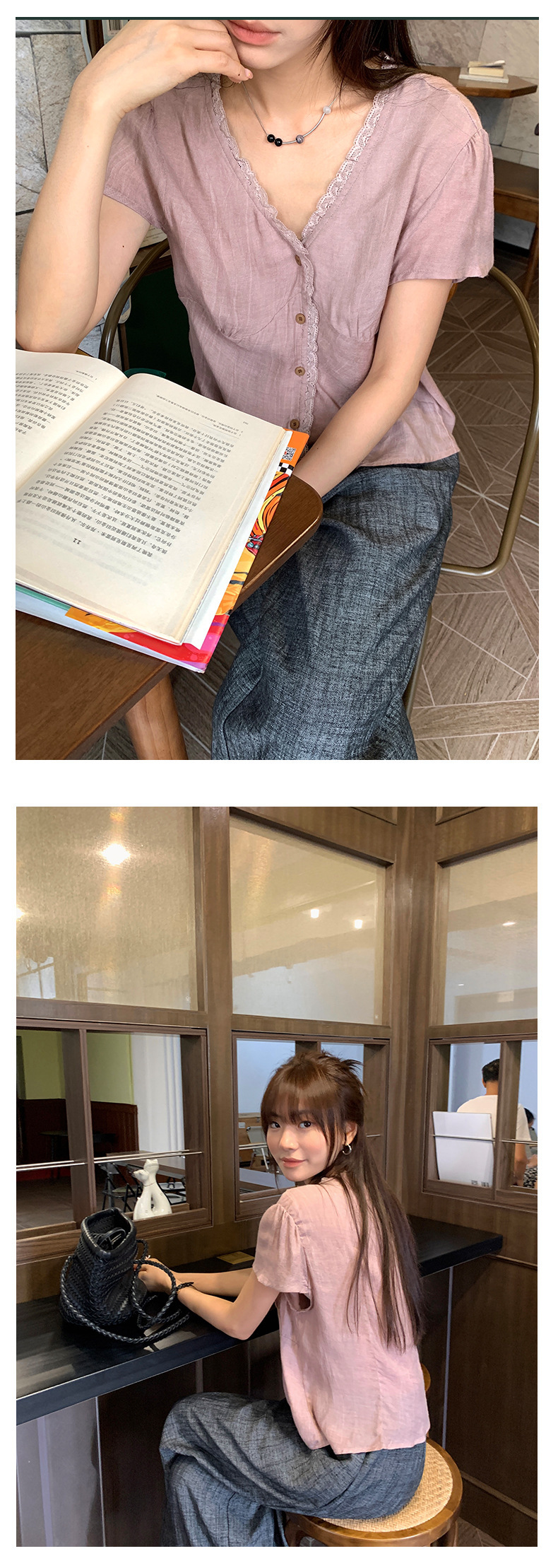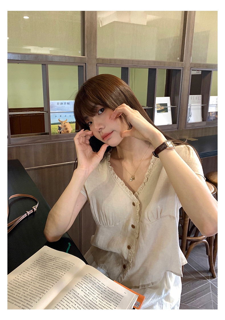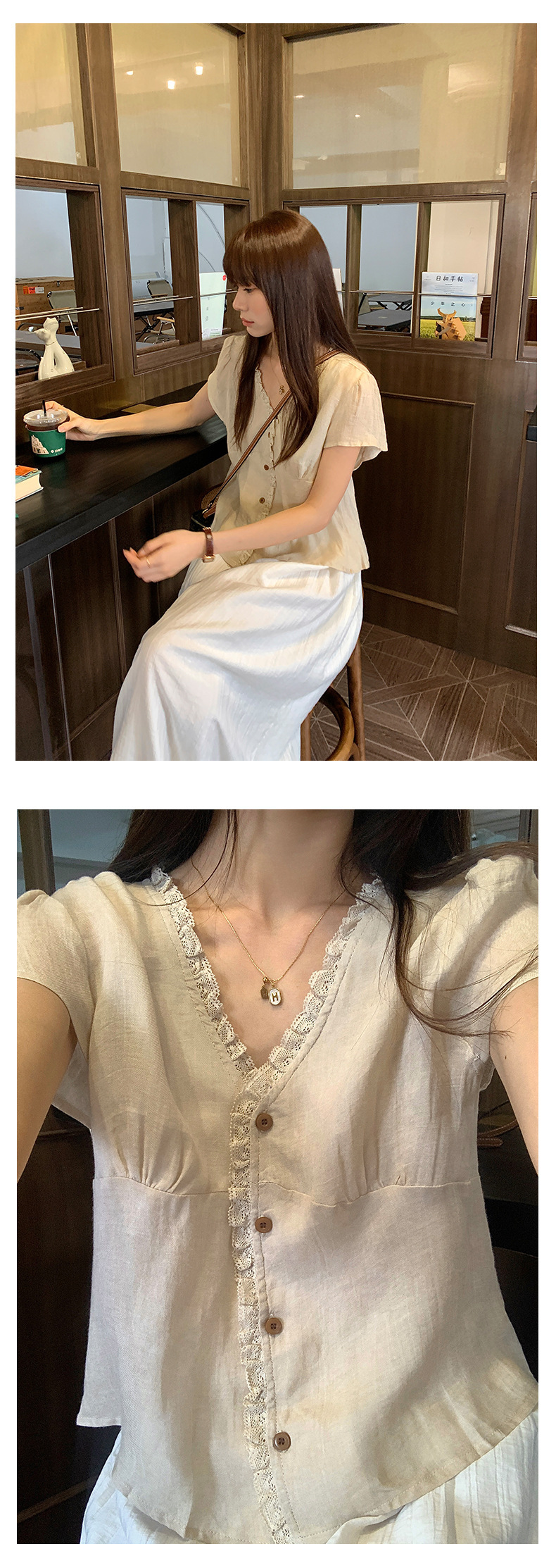 *o-ha-you*【FHZ142CH4046】甜美風V領花邊開襟襯衫2024夏寬鬆顯瘦襯衣小衫-2色