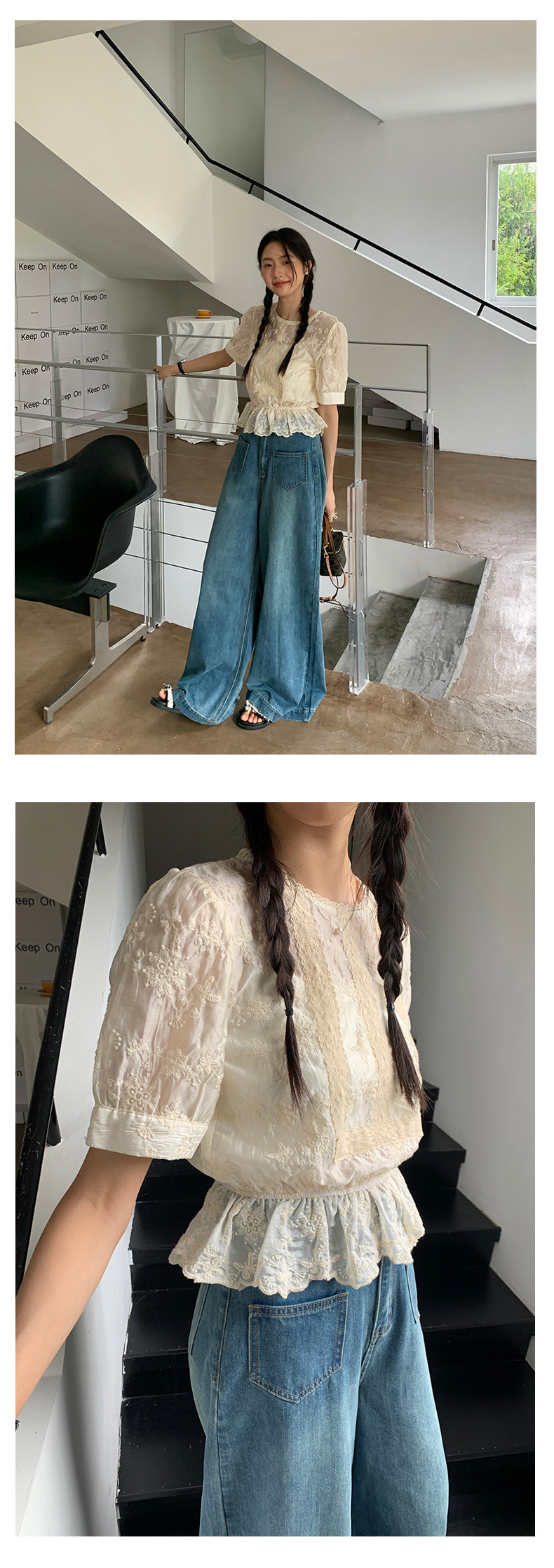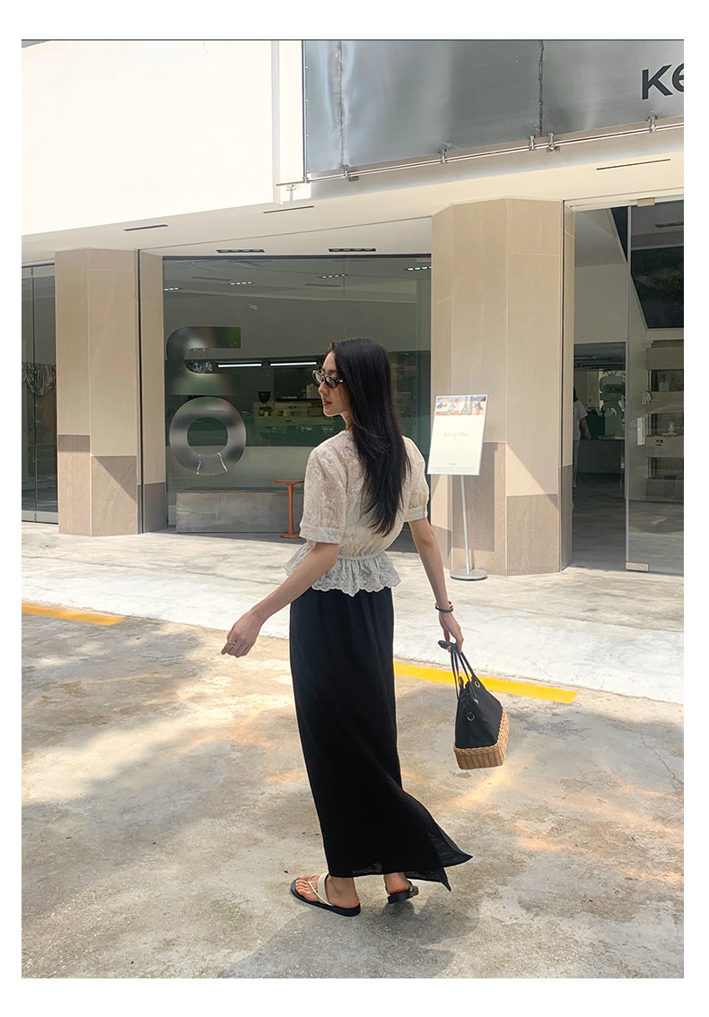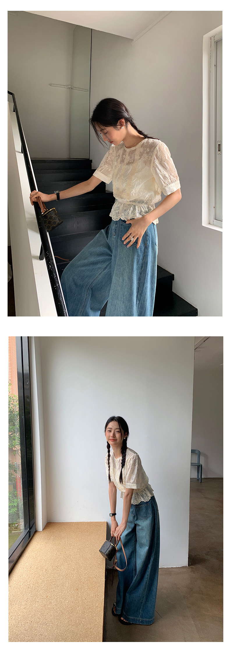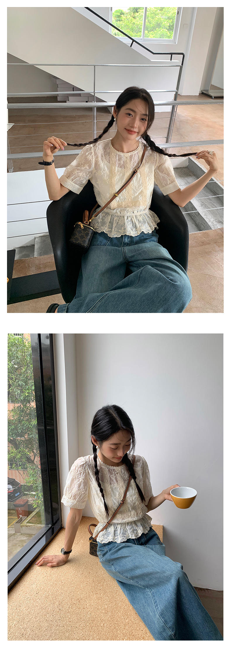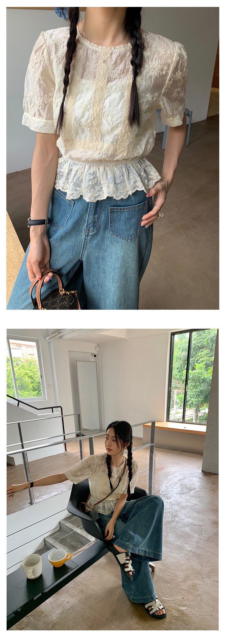 *o-ha-you*【FHZ142CH5056】法式圓領花朵刺繡短袖小衫2024夏修身顯瘦短款上衣
