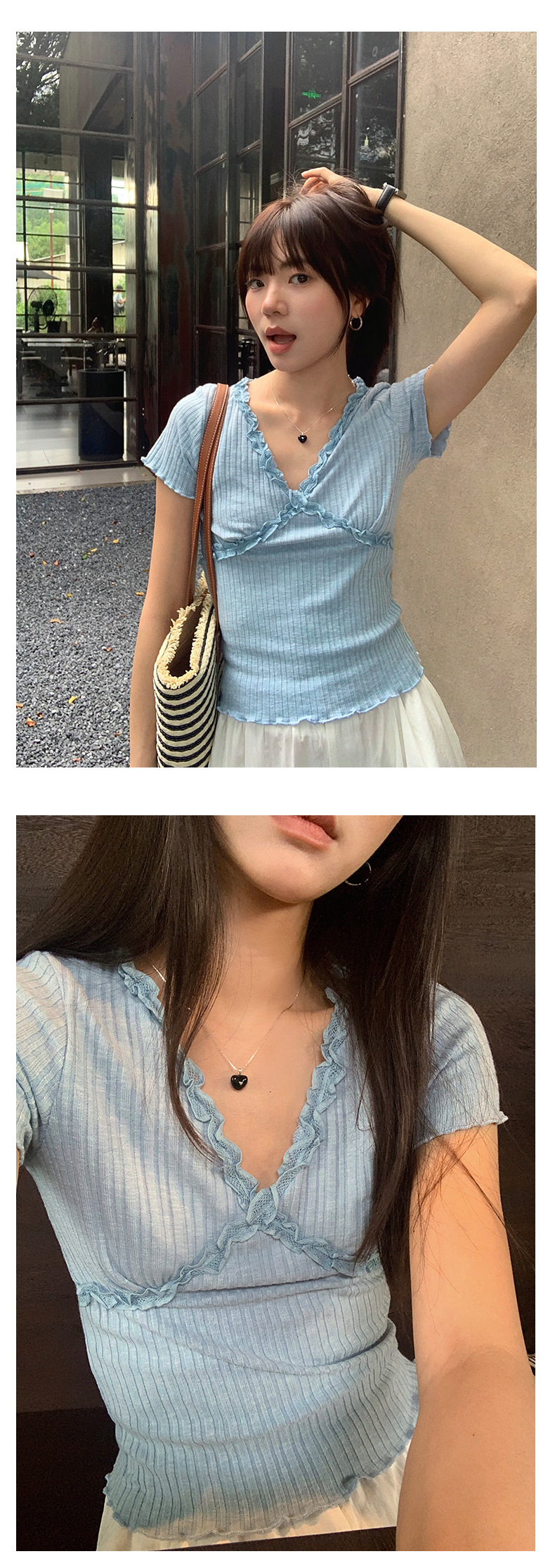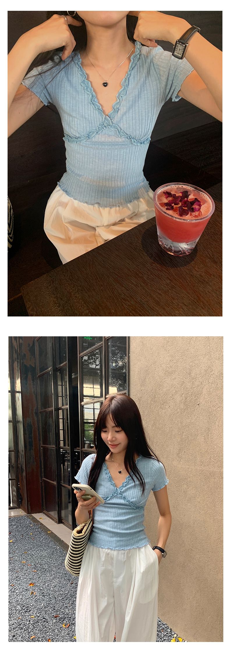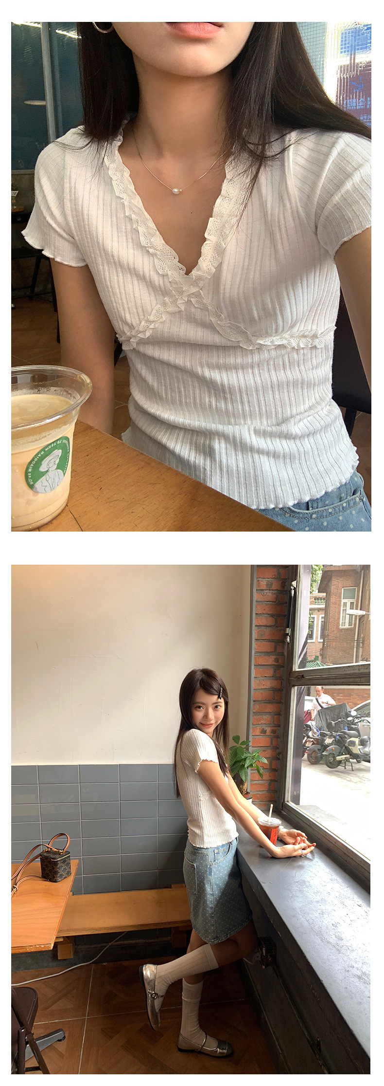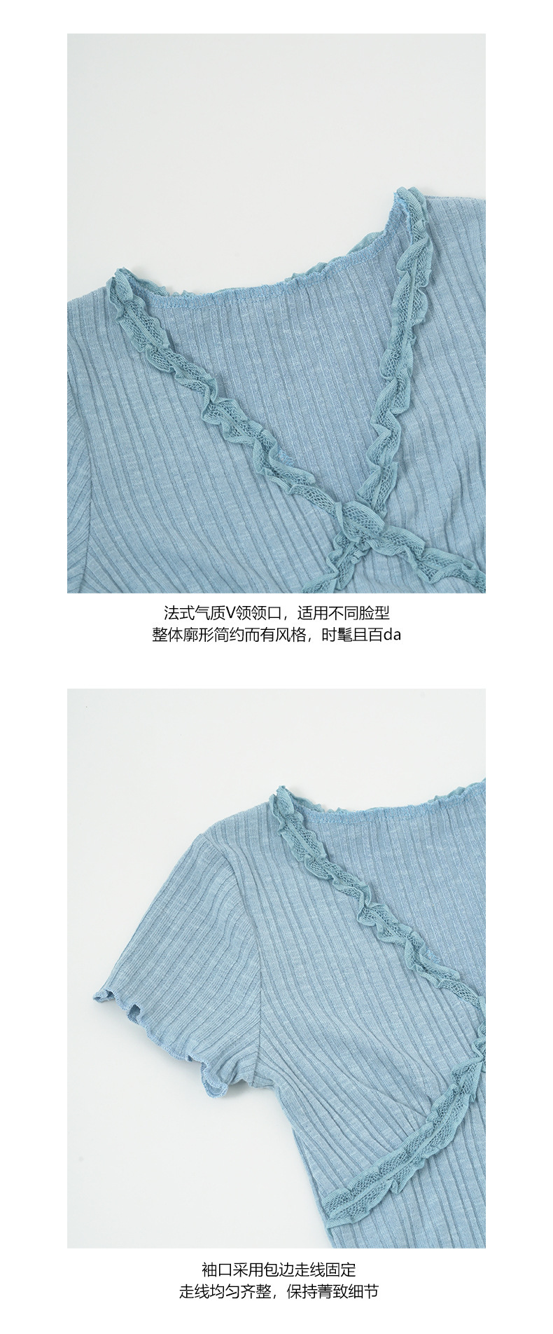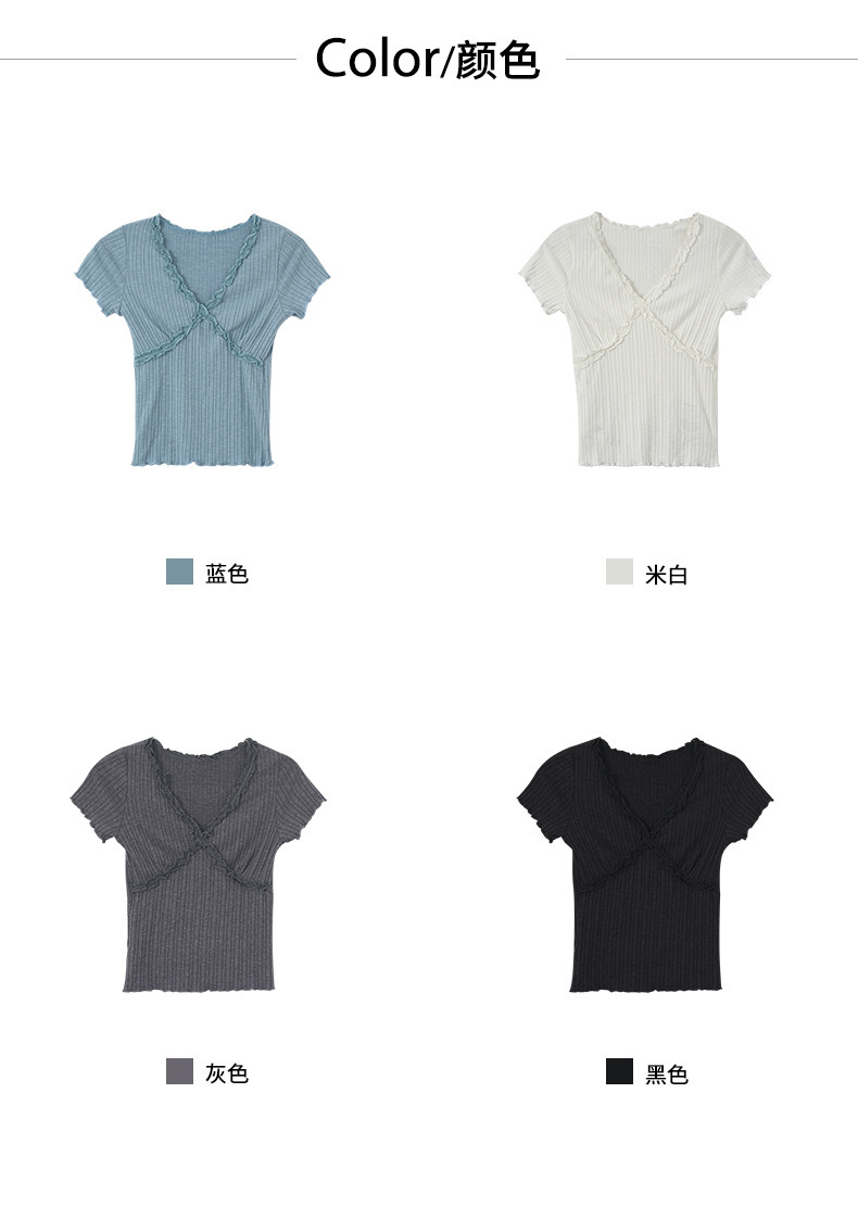 *o-ha-you*【FHZ142TH5069】甜美V領木耳花邊短袖T恤2024夏季修身顯瘦短版上衣-4色