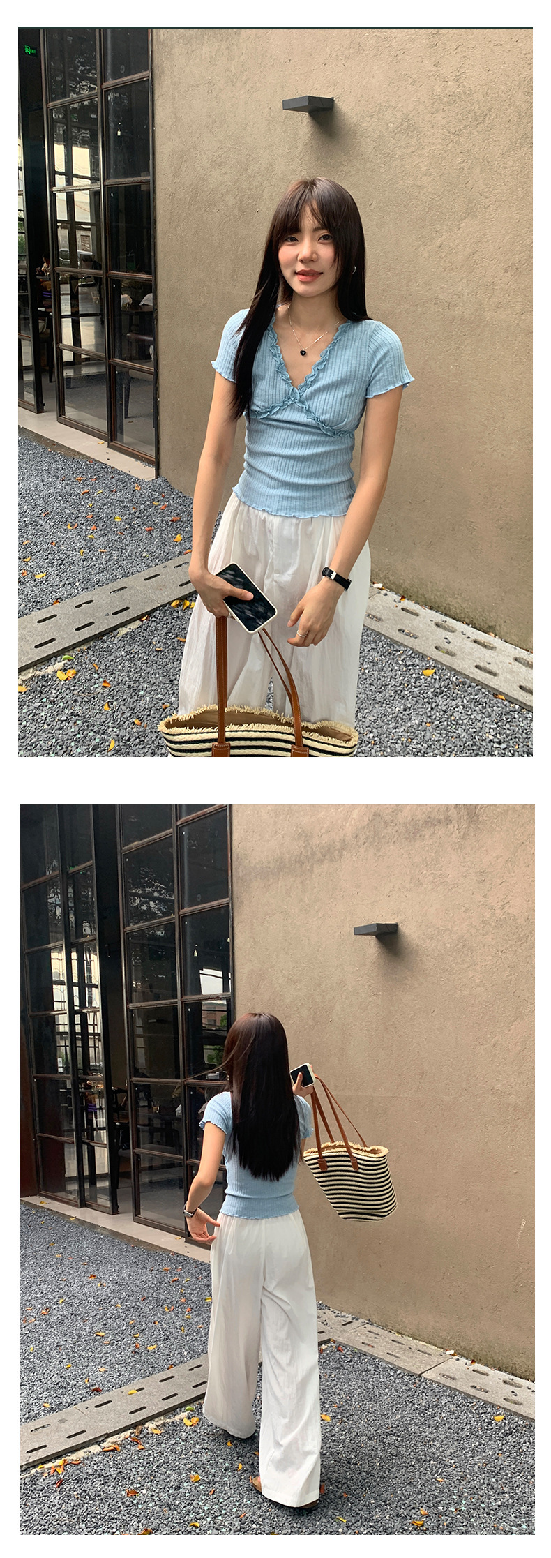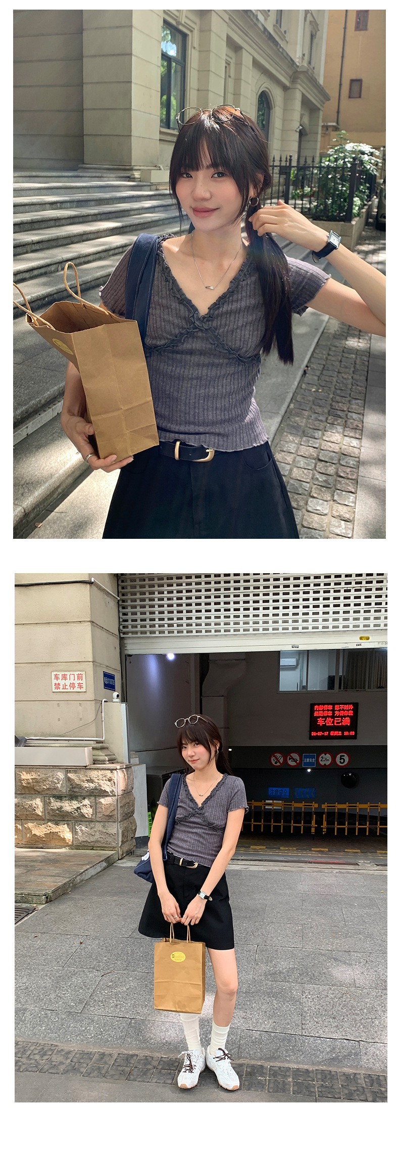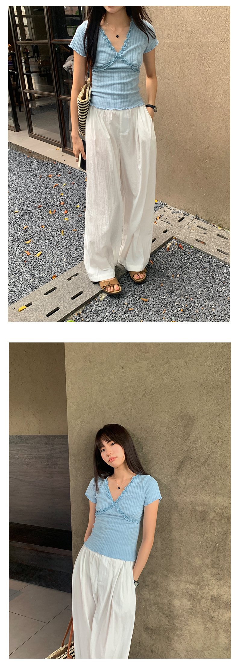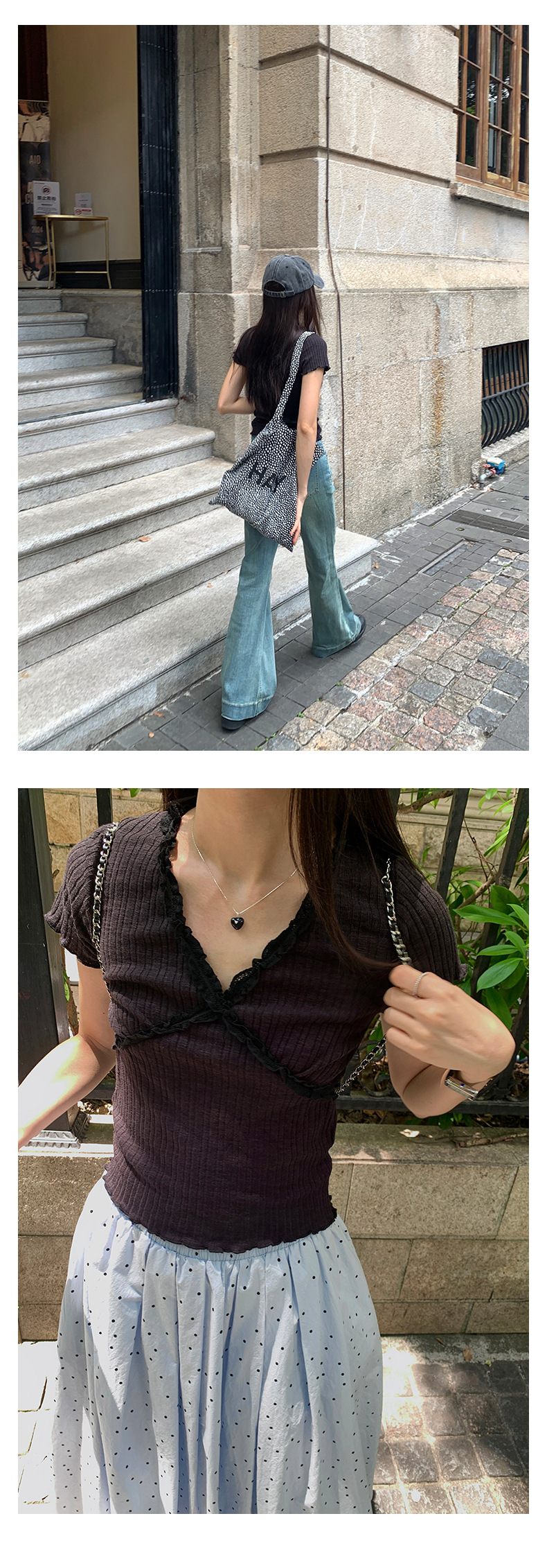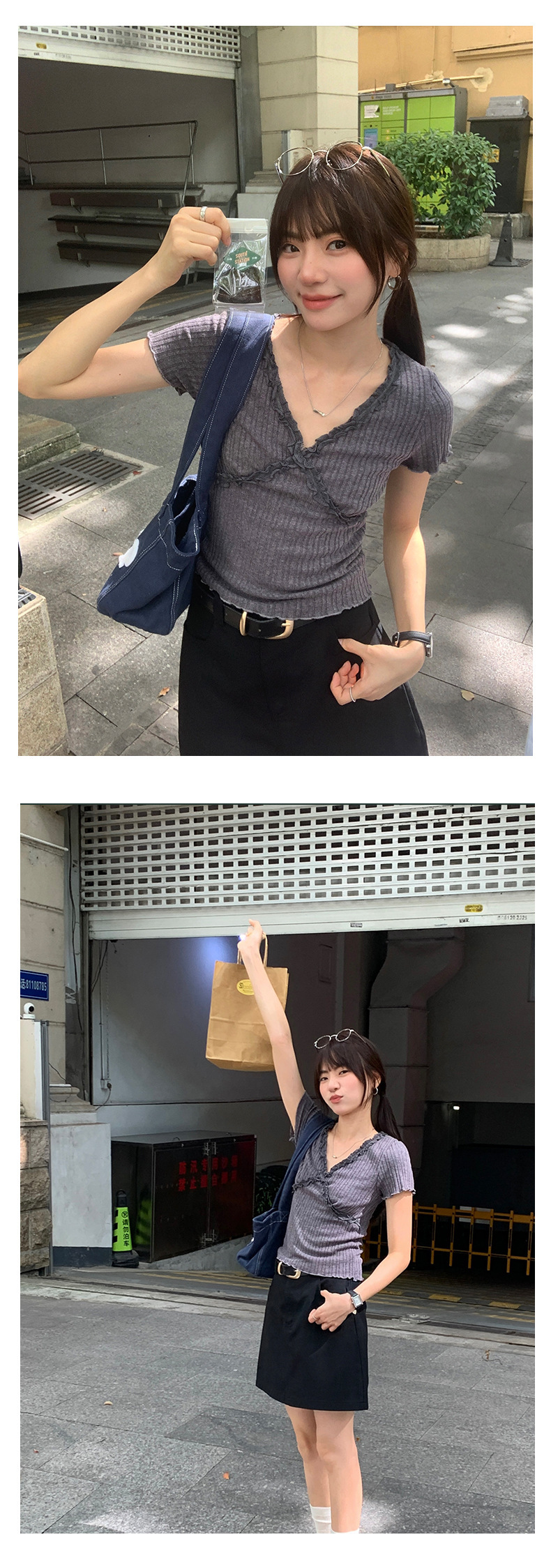 *o-ha-you*【FHZ142TH5069】甜美V領木耳花邊短袖T恤2024夏季修身顯瘦短版上衣-4色