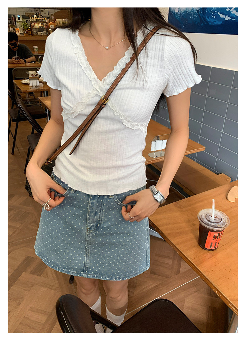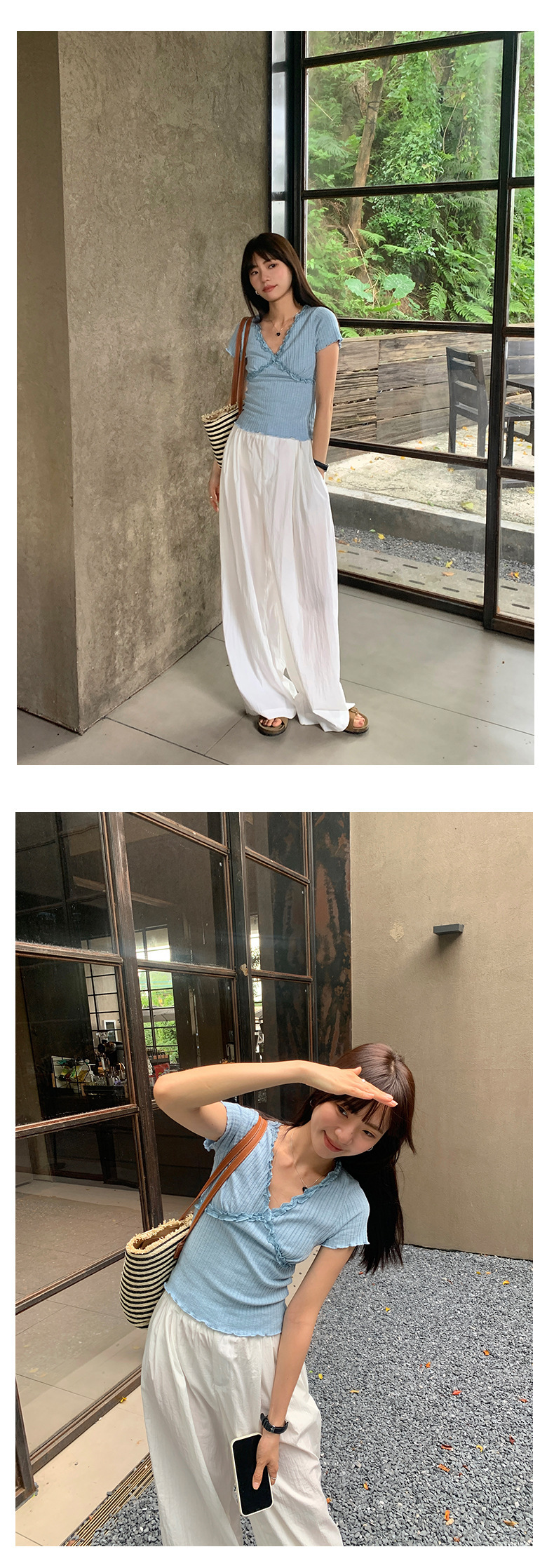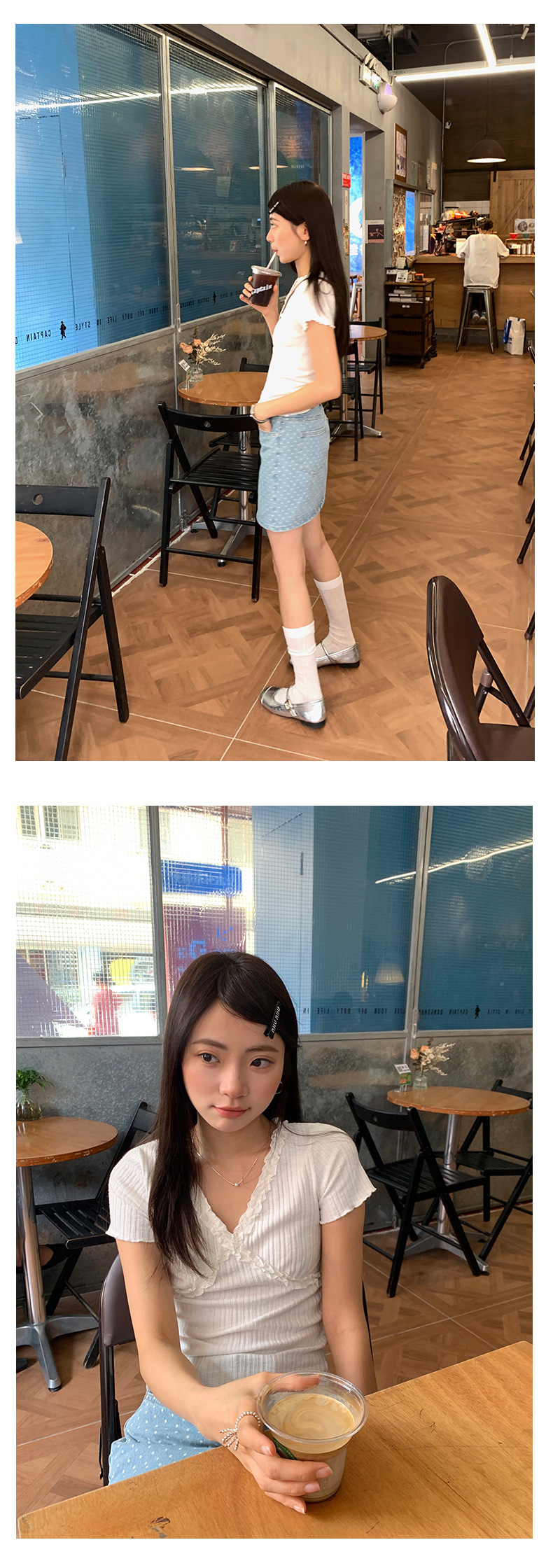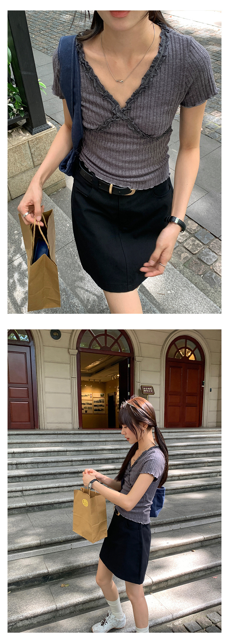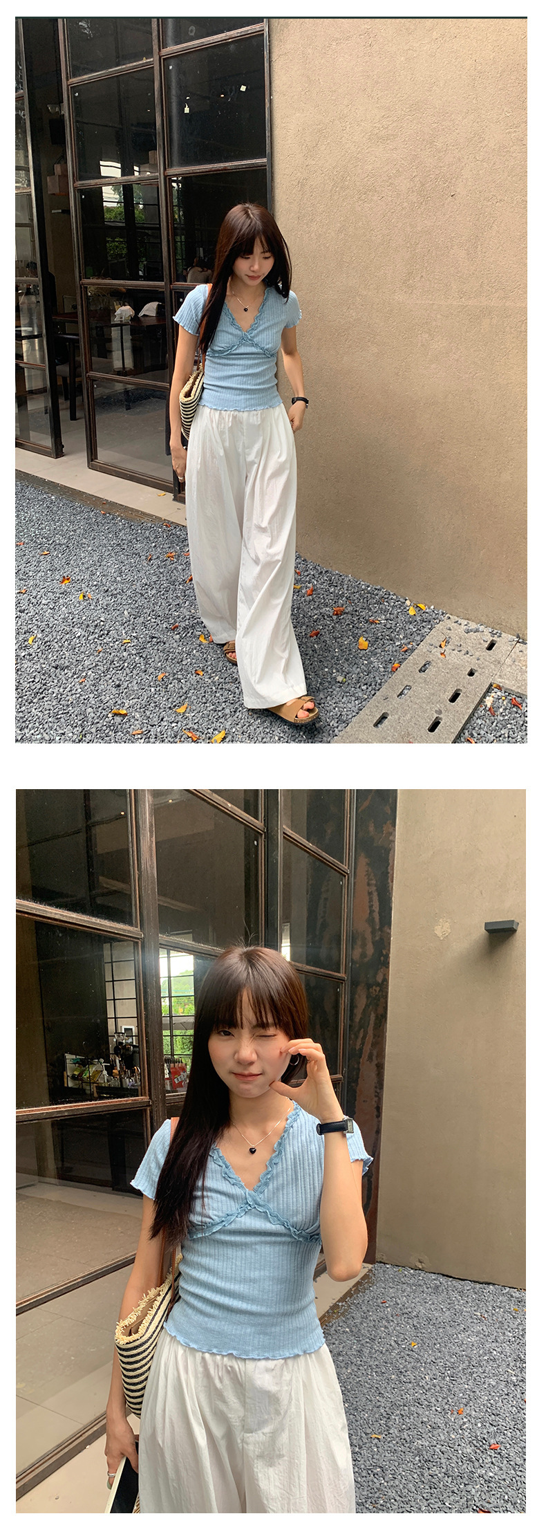 *o-ha-you*【FHZ142TH5069】甜美V領木耳花邊短袖T恤2024夏季修身顯瘦短版上衣-4色