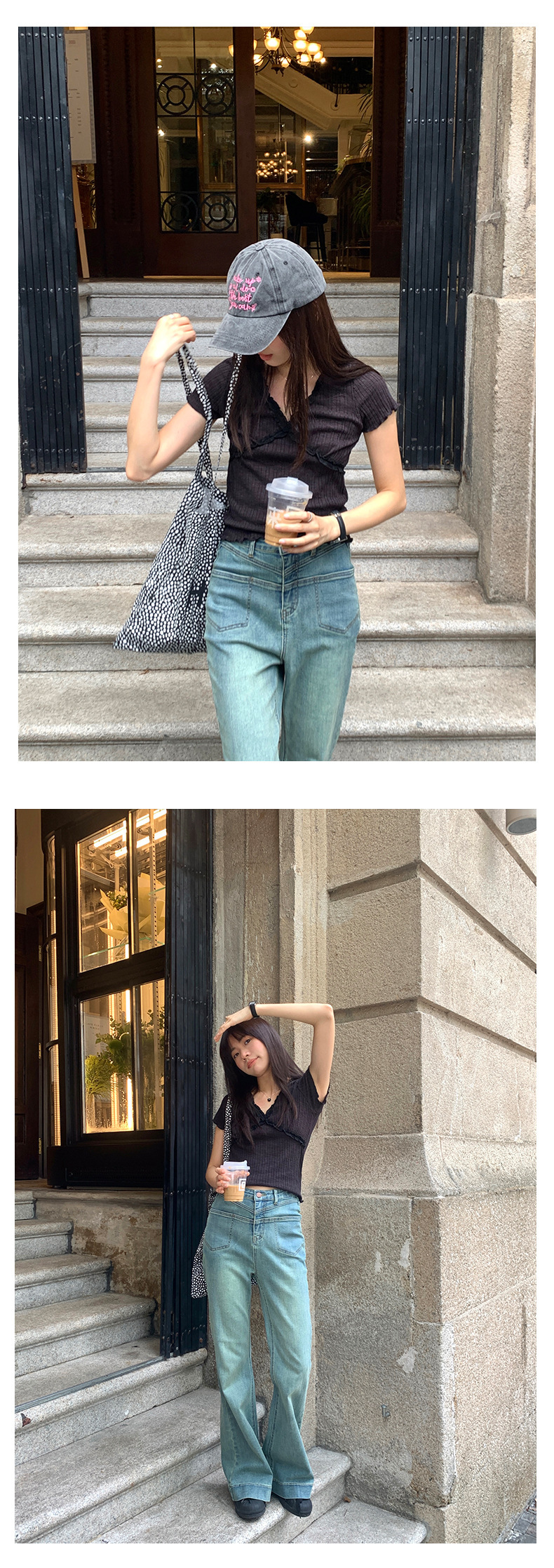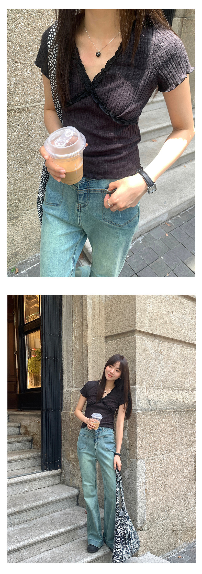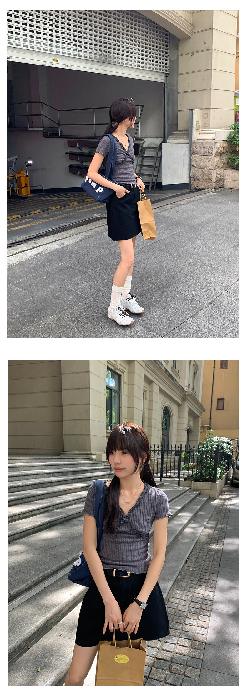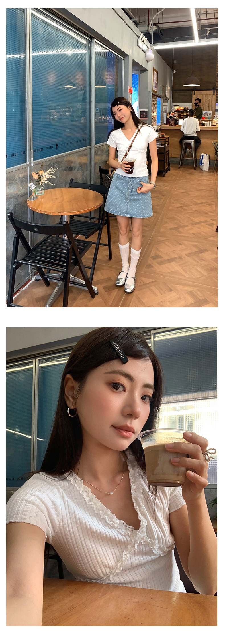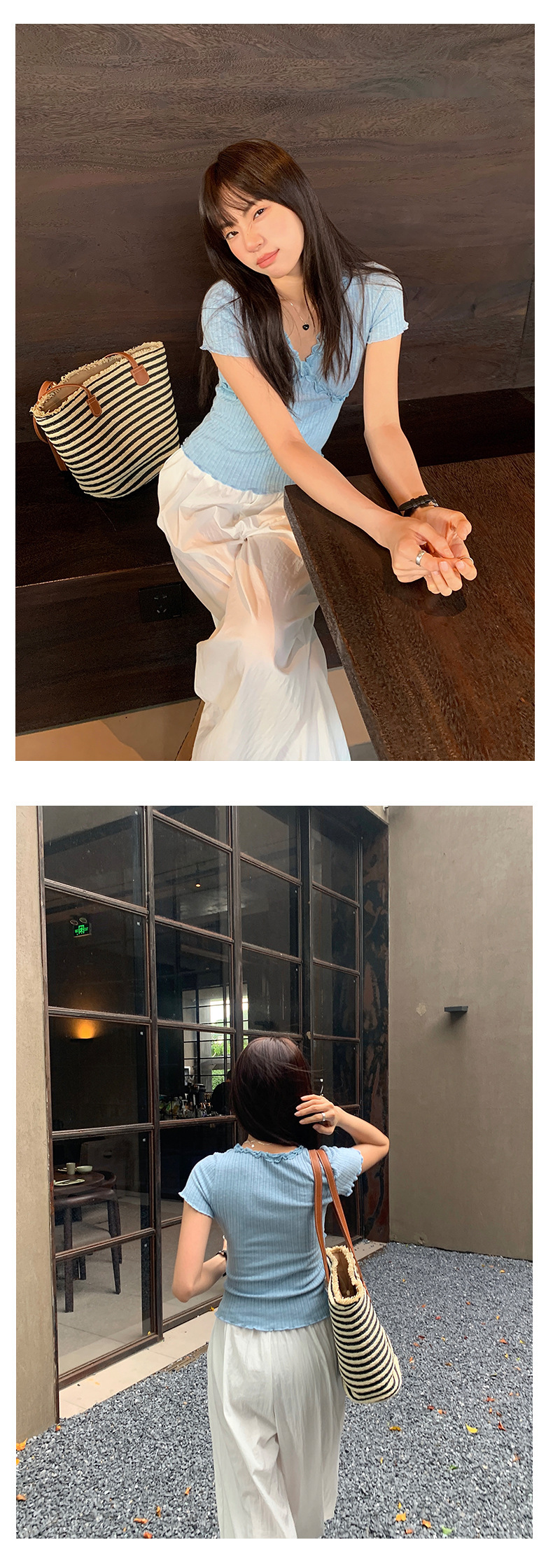 *o-ha-you*【FHZ142TH5069】甜美V領木耳花邊短袖T恤2024夏季修身顯瘦短版上衣-4色