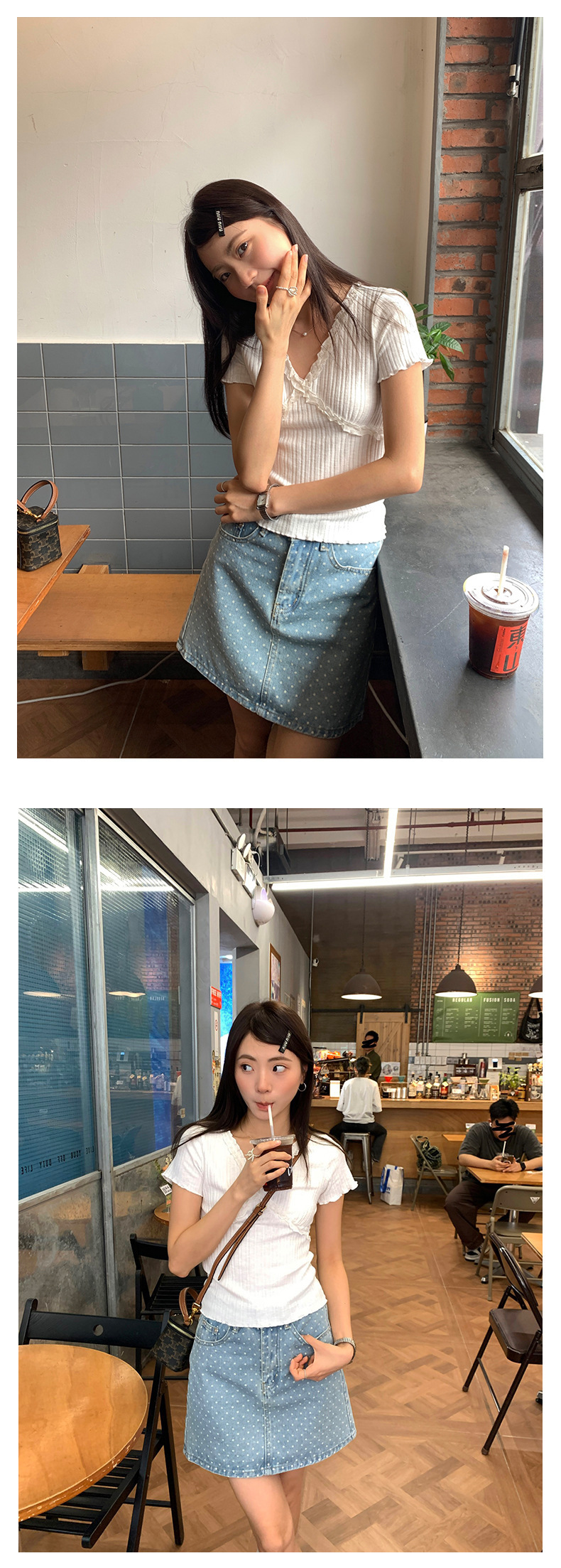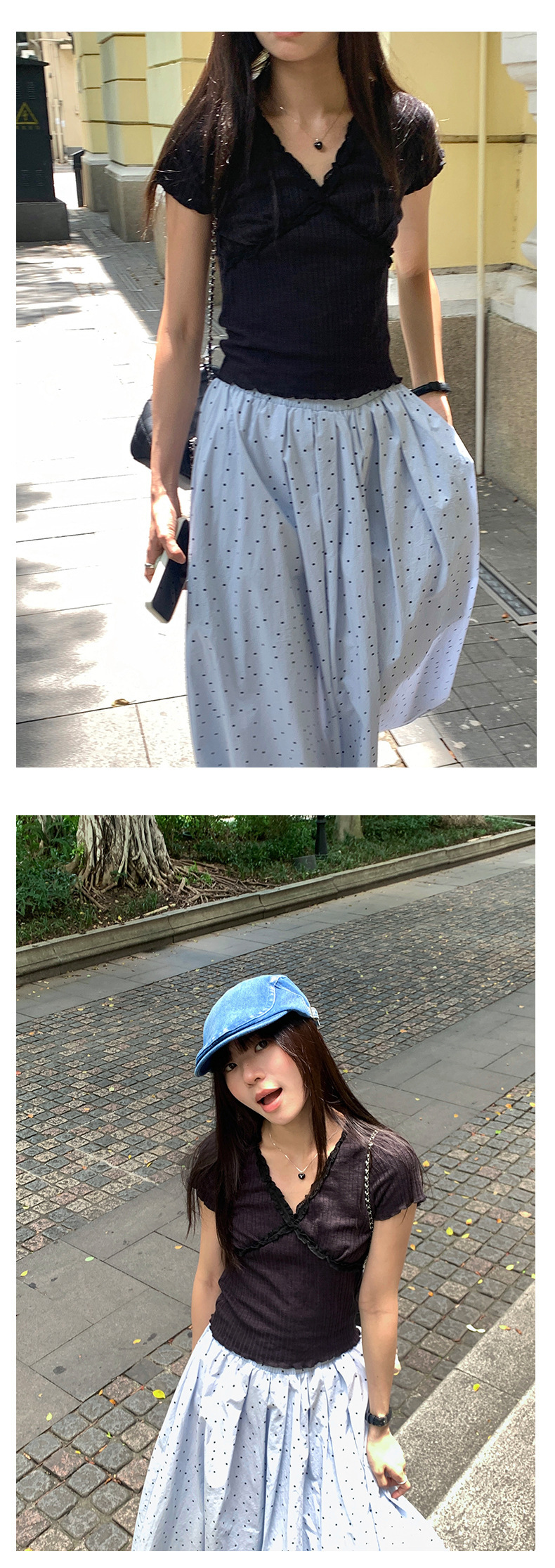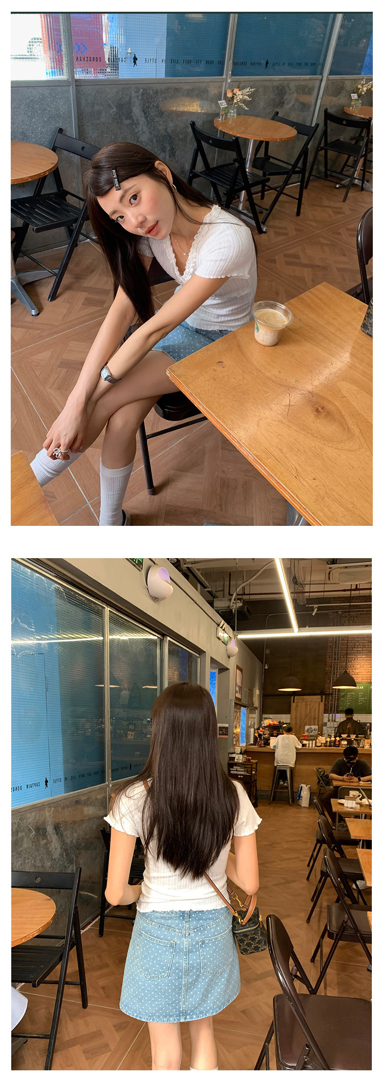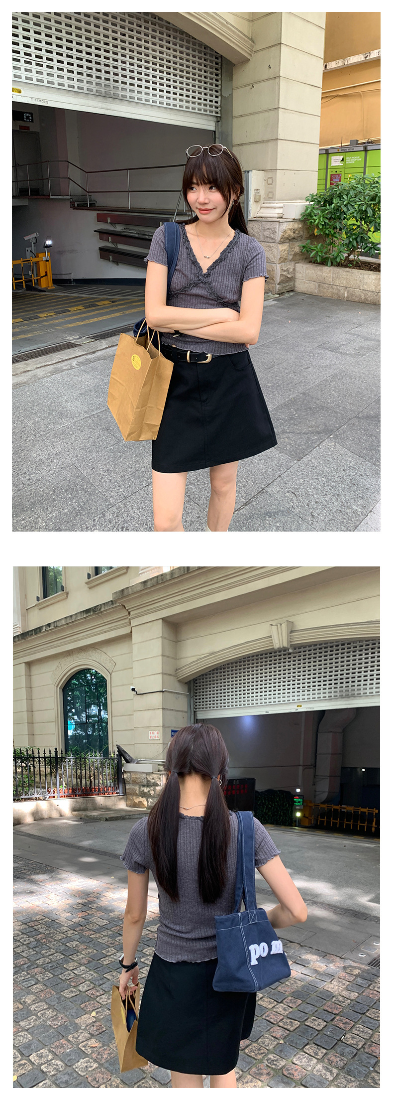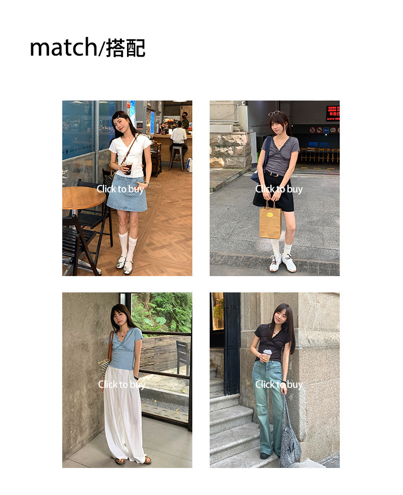 *o-ha-you*【FHZ142TH5069】甜美V領木耳花邊短袖T恤2024夏季修身顯瘦短版上衣-4色