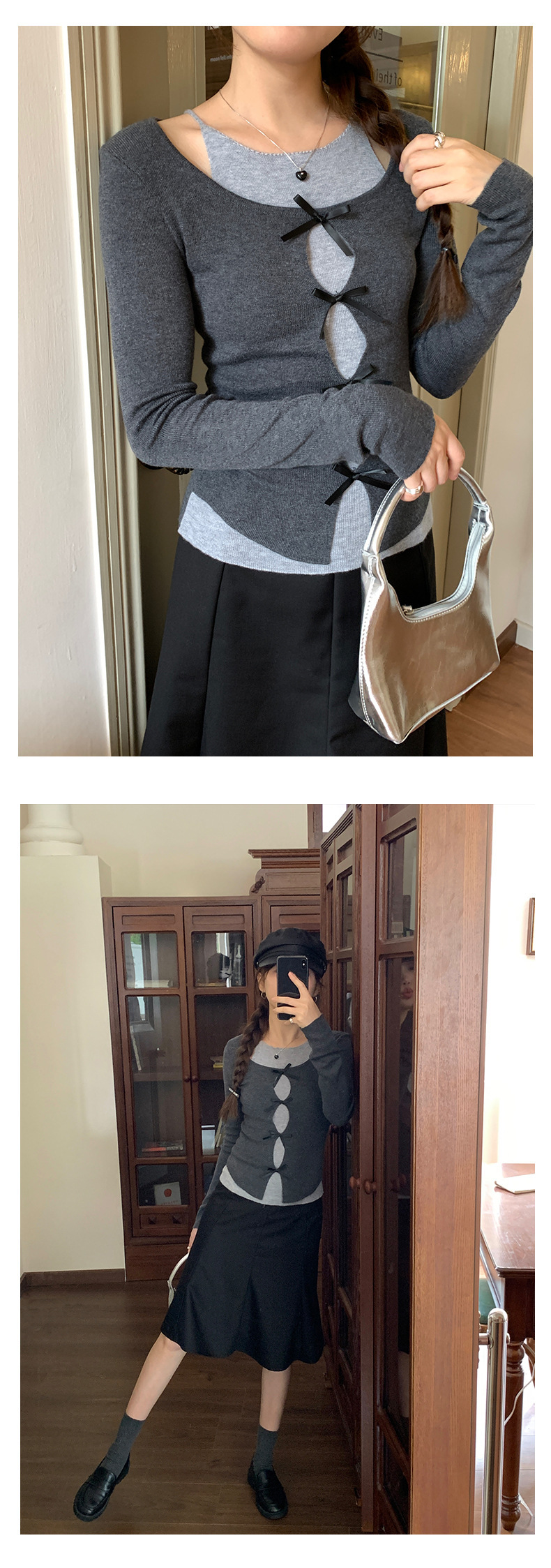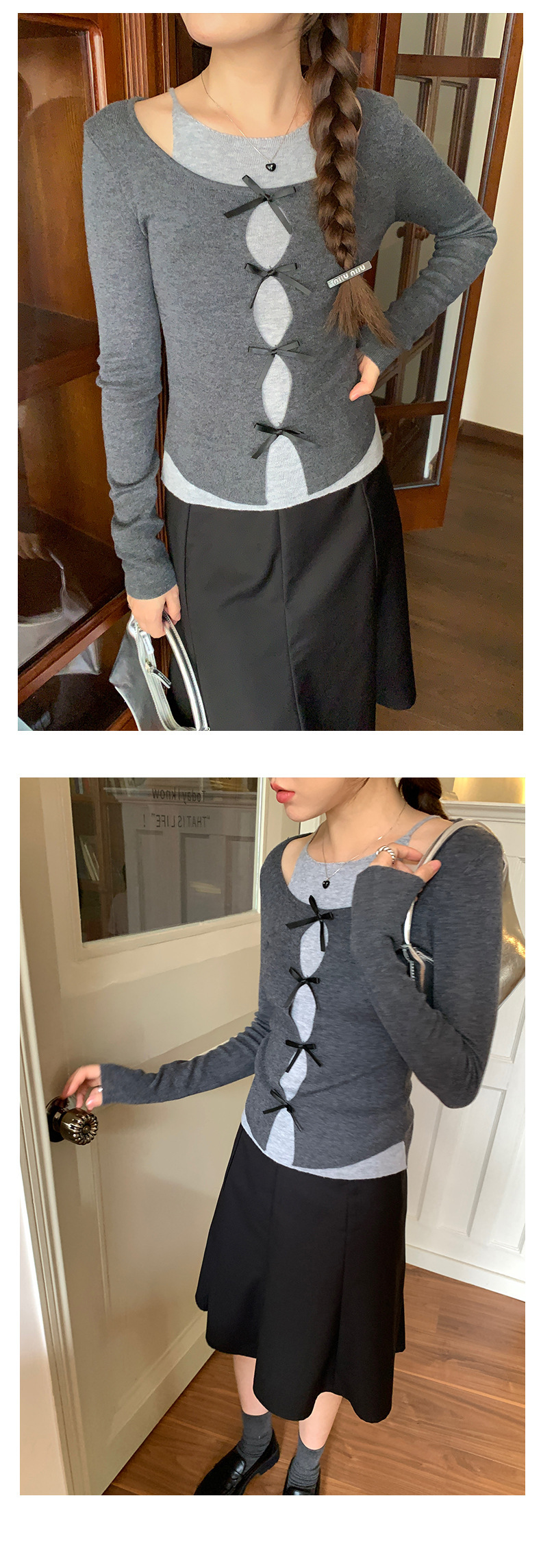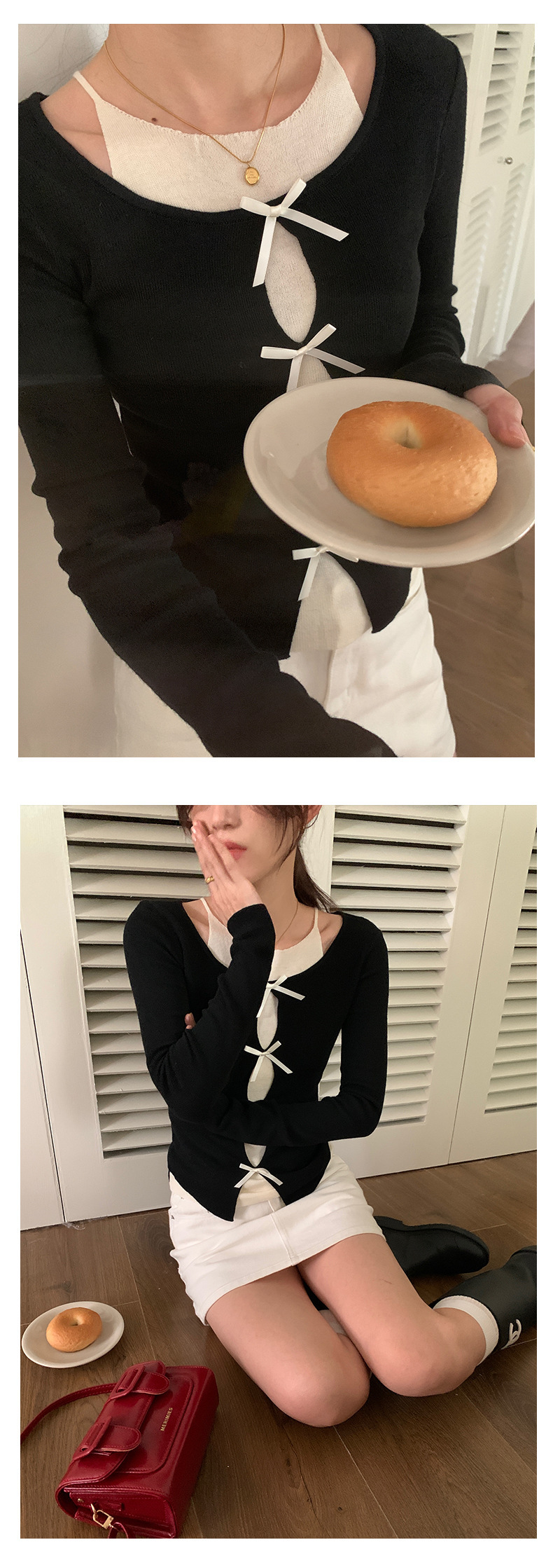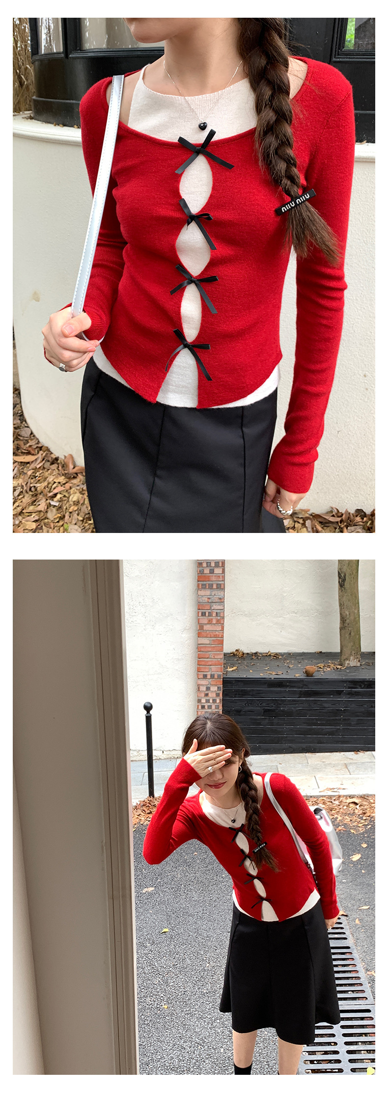 *o-ha-you*【FHZ143MY6028】甜辣假兩件蝴蝶結針織衫2024秋季韓版顯瘦打底長袖-5色