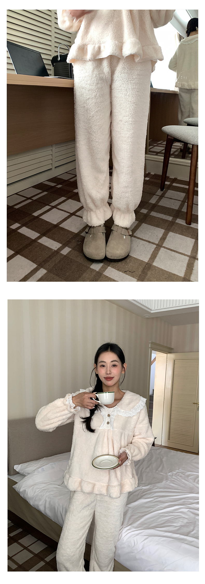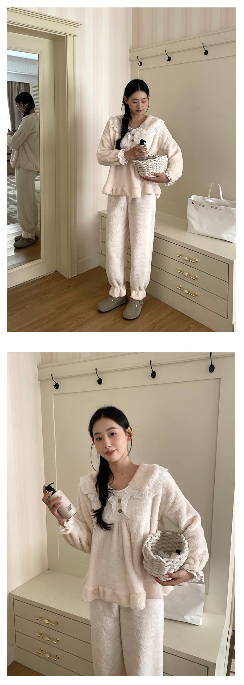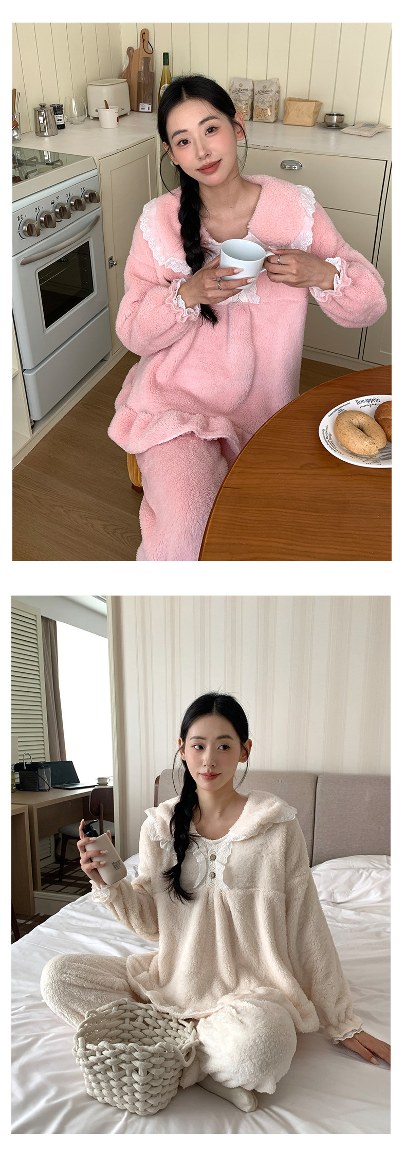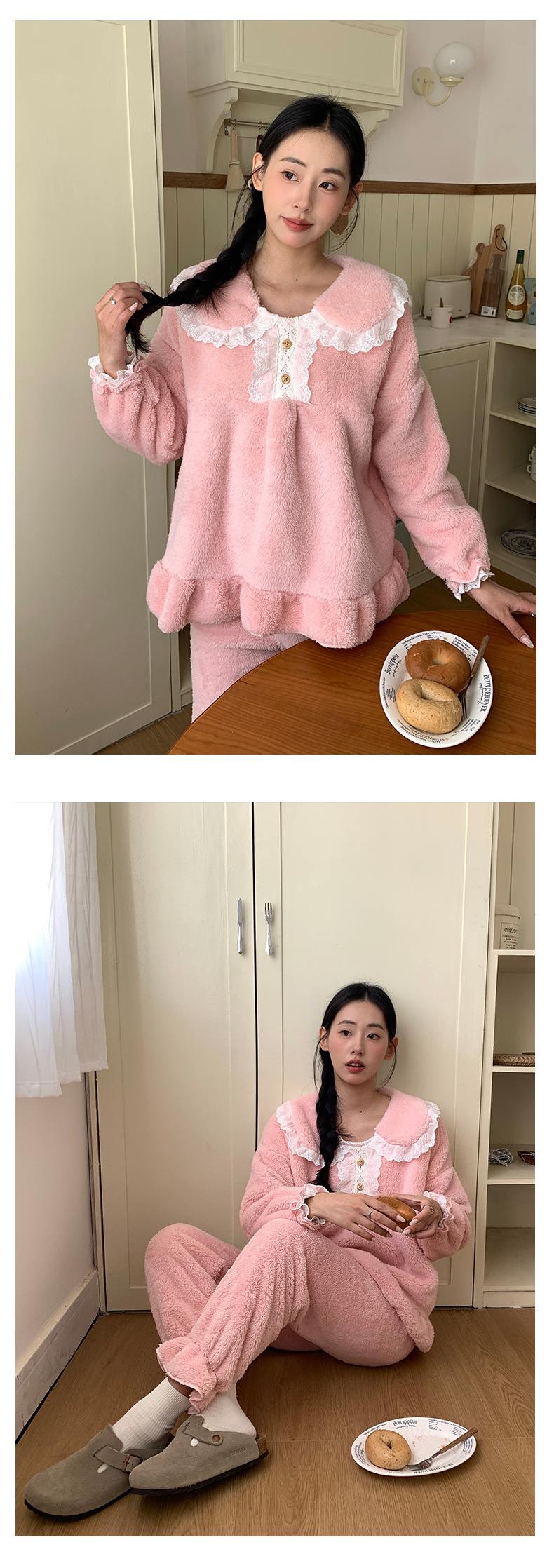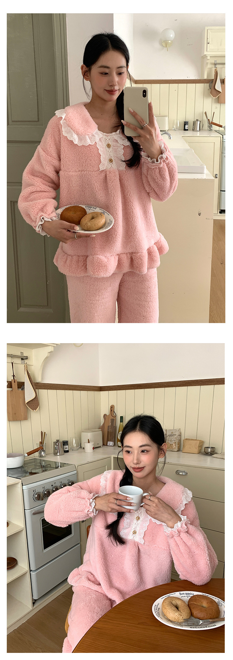 *o-ha-you*【FHZ145ZY10043】珊瑚絨加厚睡衣套裝2024冬蕾絲甜美家居-2色