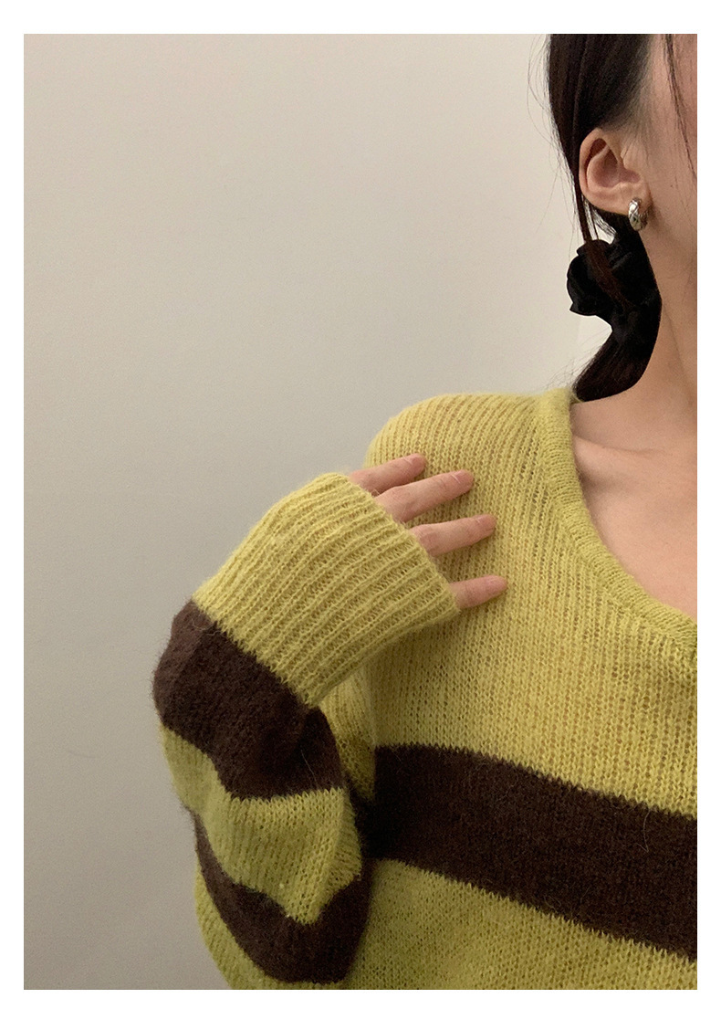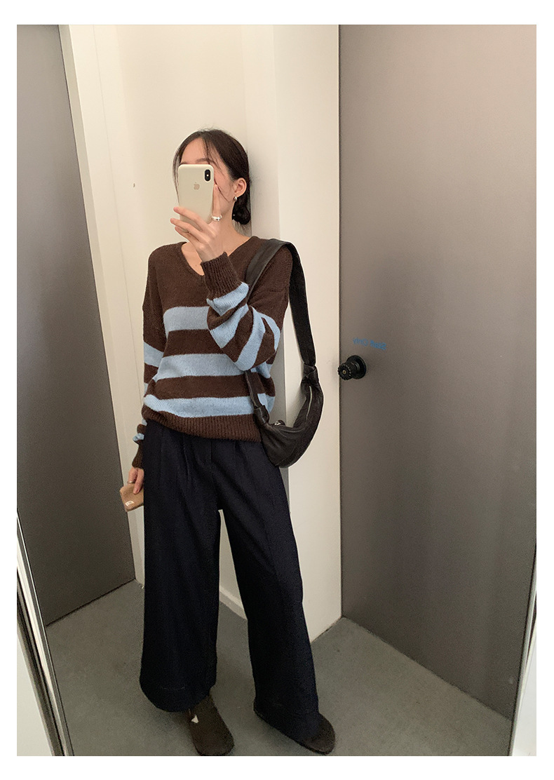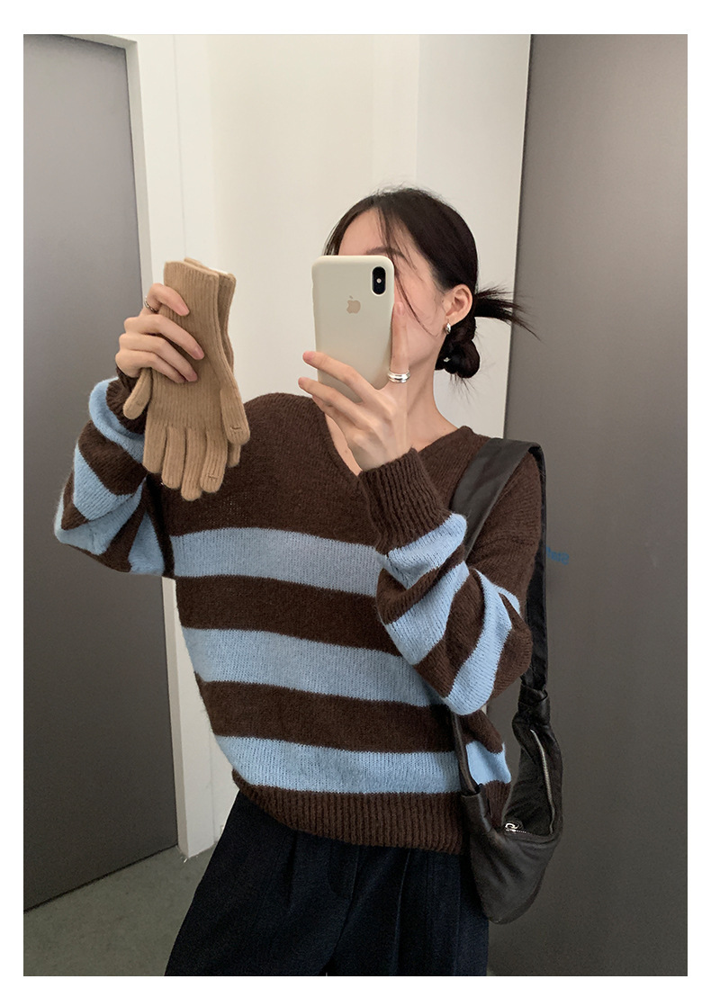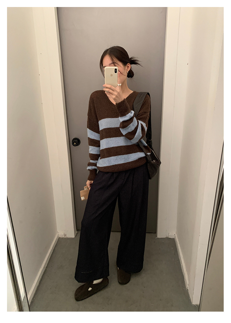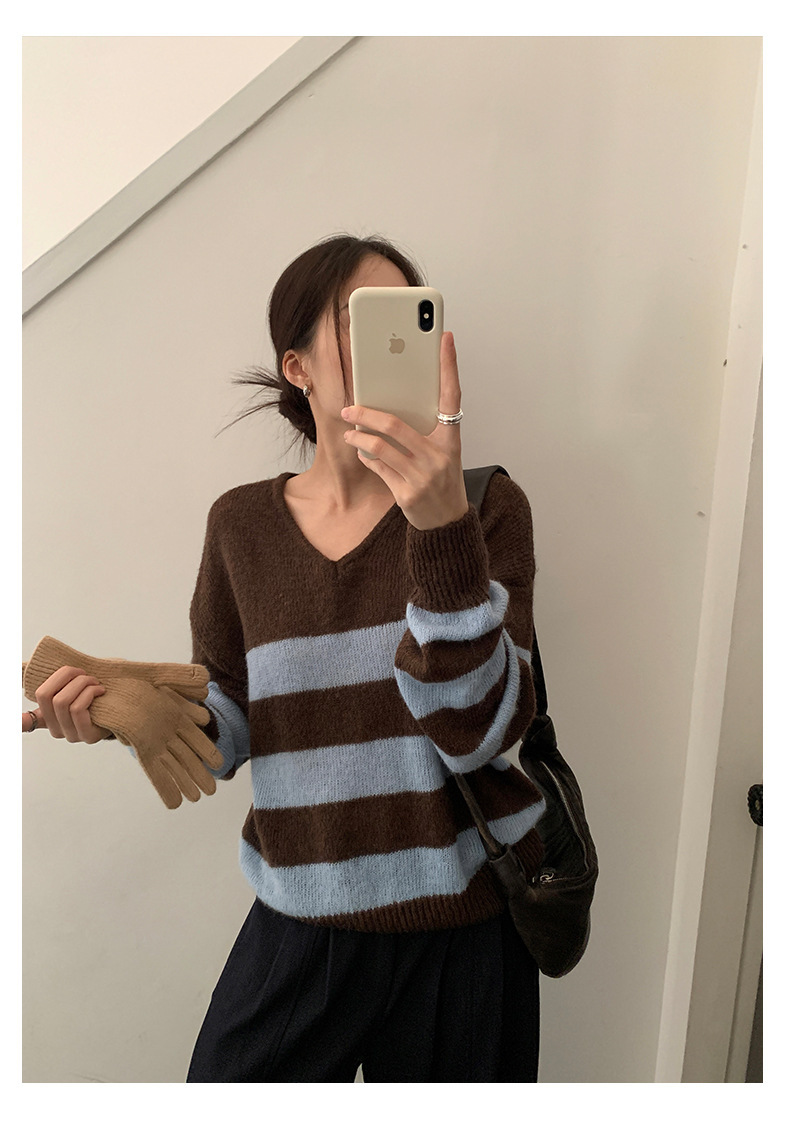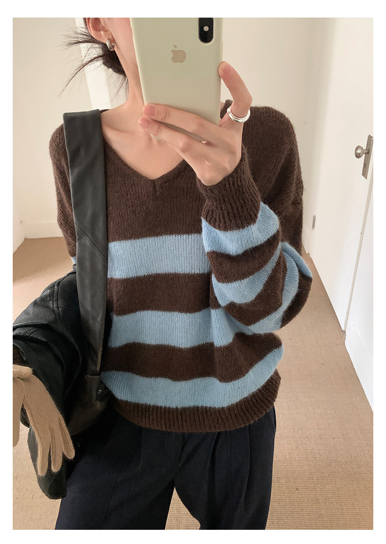 *o-ha-you*【FHZH1BB5041008】韓系慵懶風條紋撞色V領毛衣女2025冬寬鬆休閒長袖上衣-2色