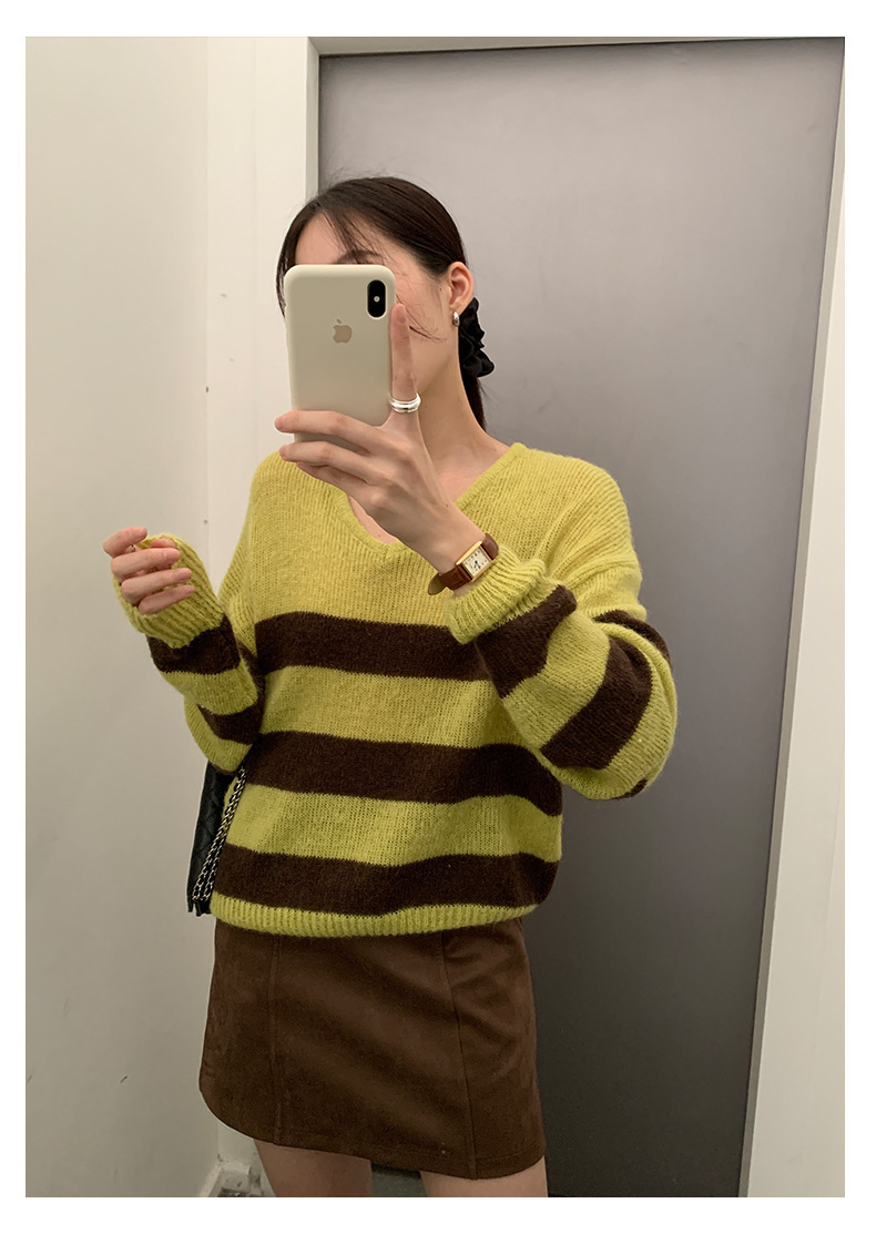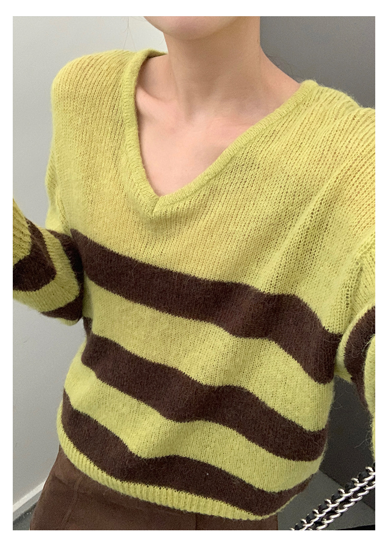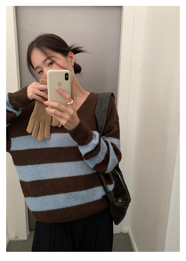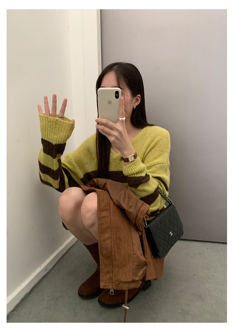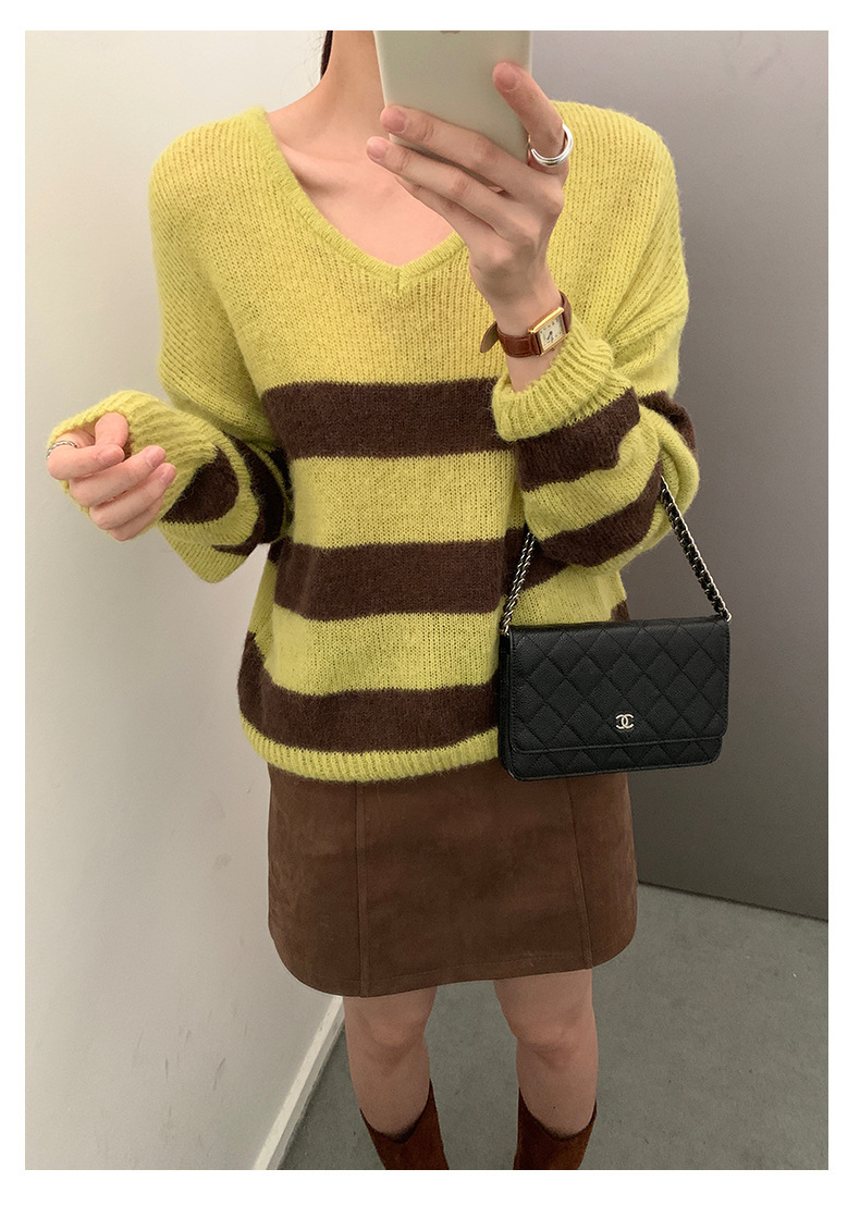 *o-ha-you*【FHZH1BB5041008】韓系慵懶風條紋撞色V領毛衣女2025冬寬鬆休閒長袖上衣-2色
