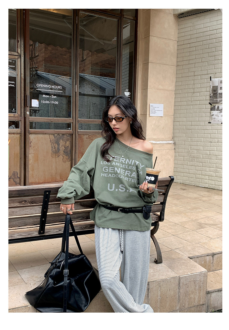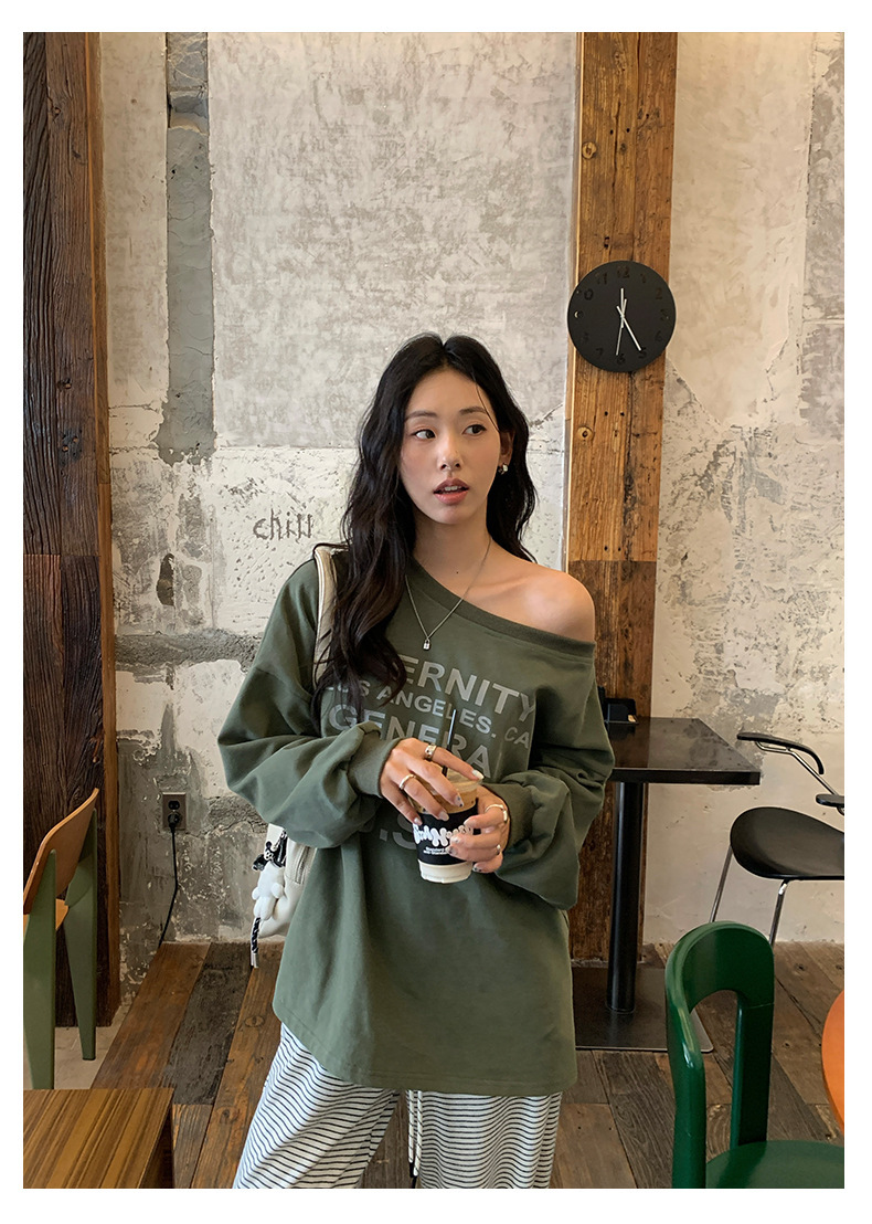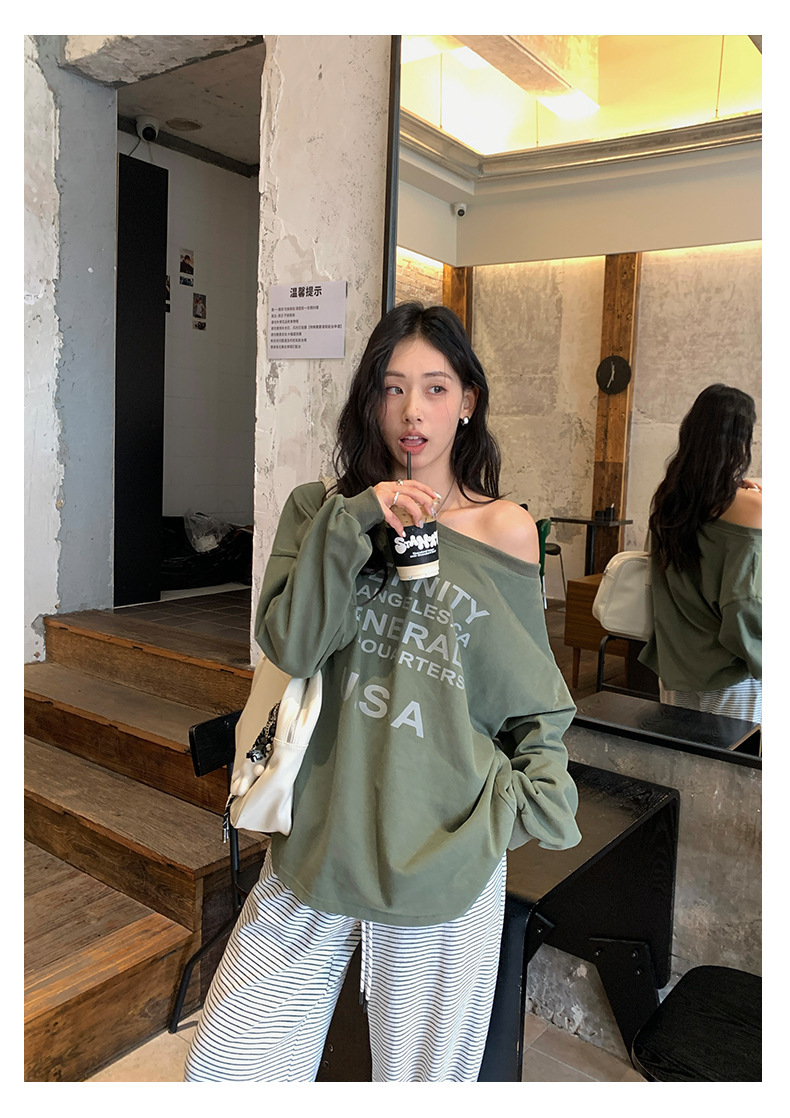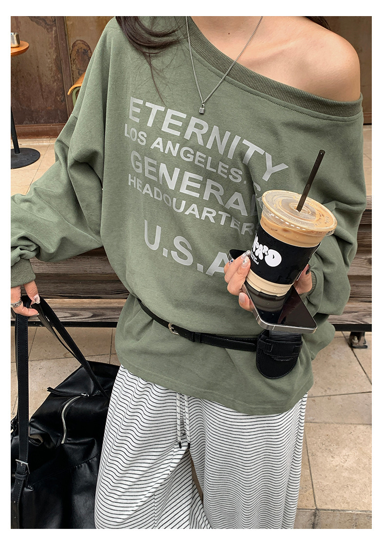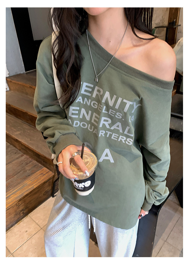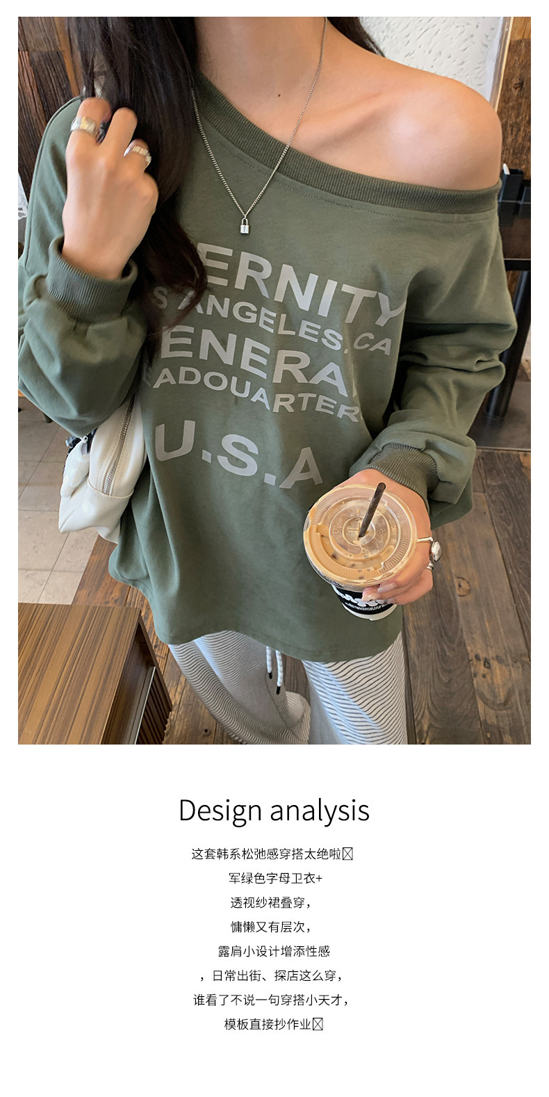 *o-ha-you*【FHZH1BF5030795】潮流個性灰色斜肩字母衛衣秋慵懶寬鬆街頭風上衣