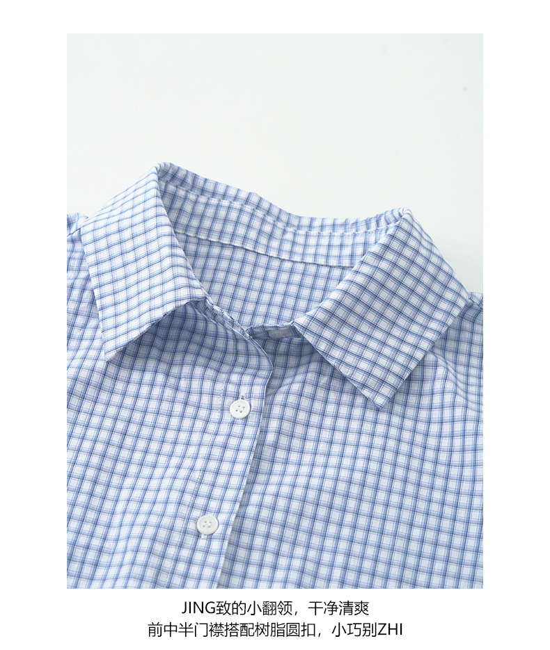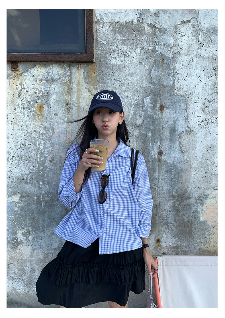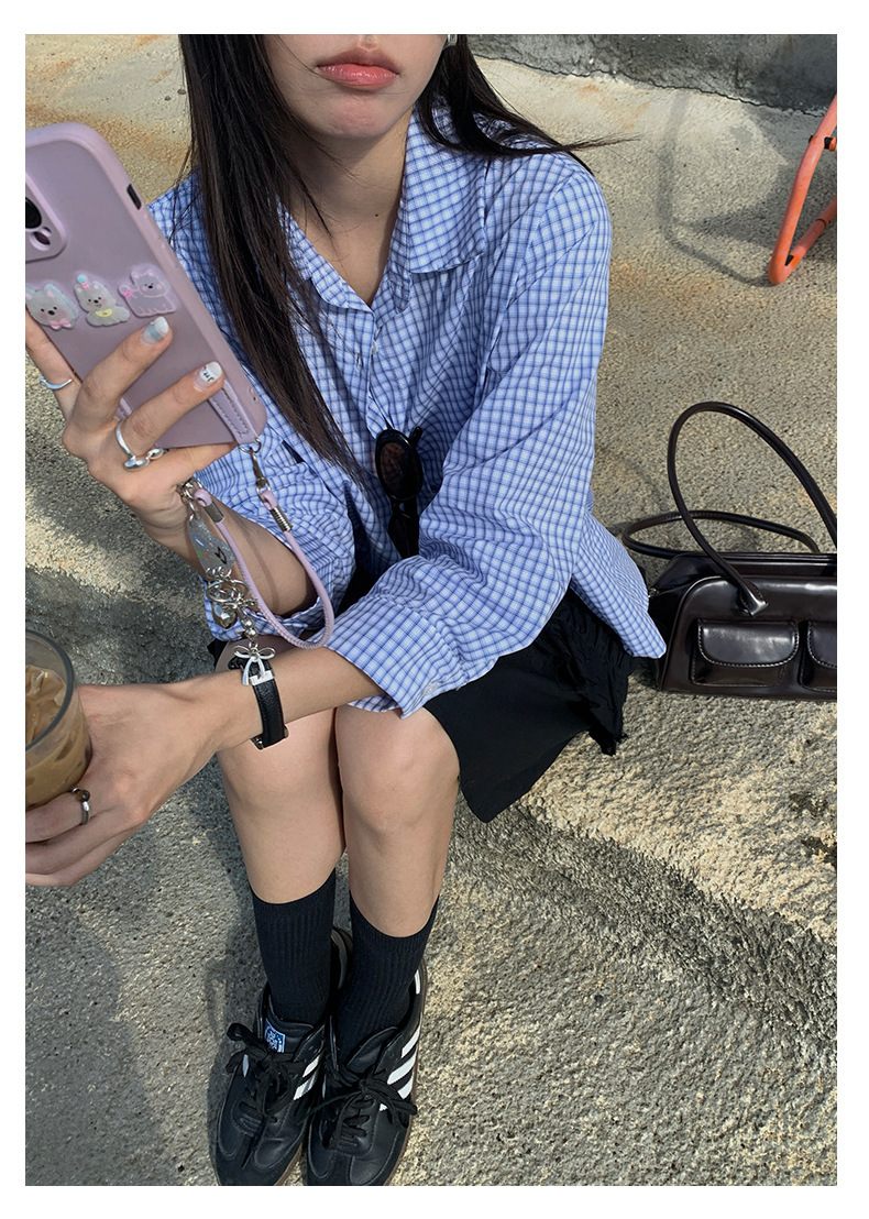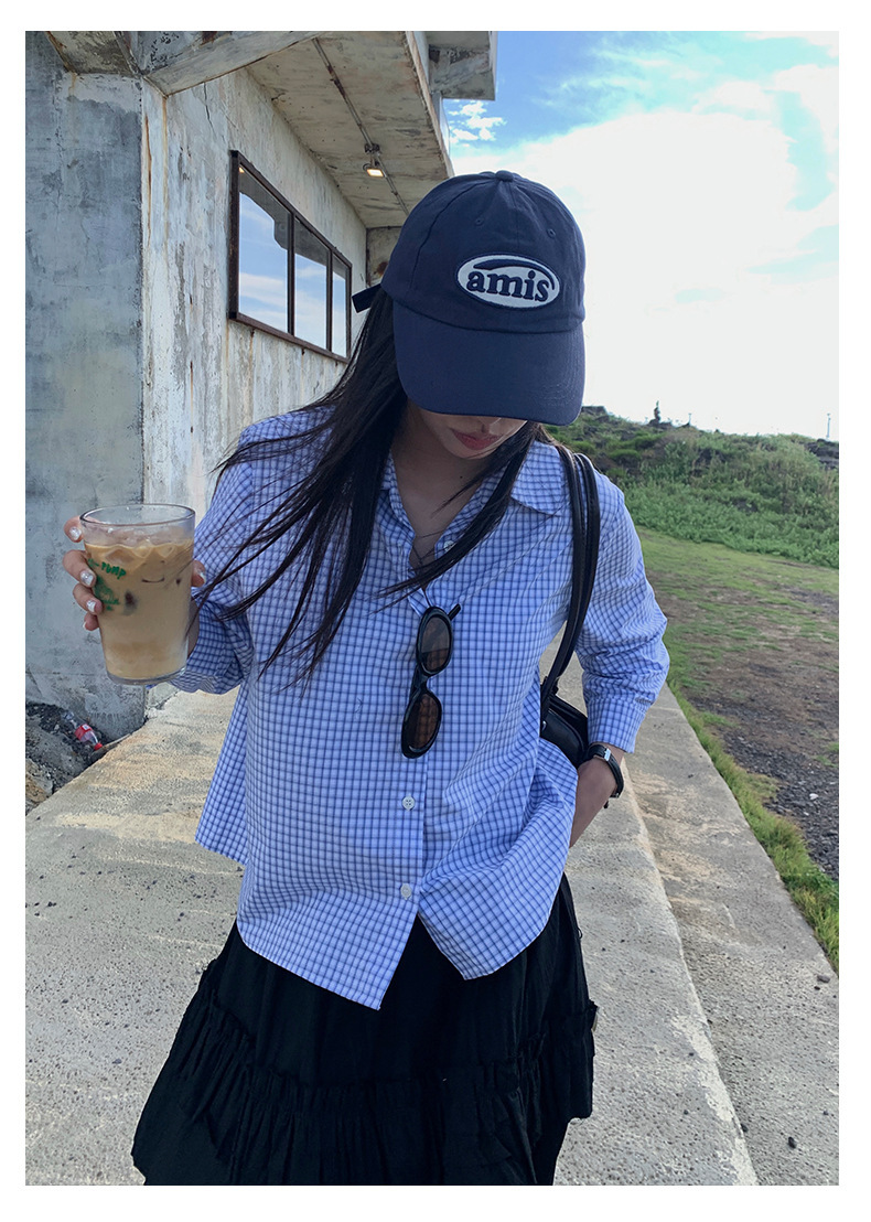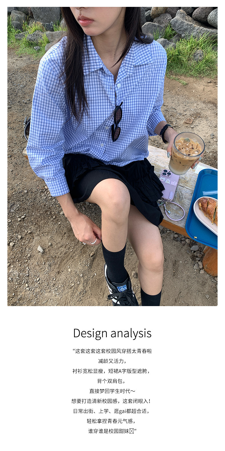*o-ha-you*【FHZH1CA5030719】法式復古藍格子條紋POLO領防曬襯衫寬鬆休閒襯衫