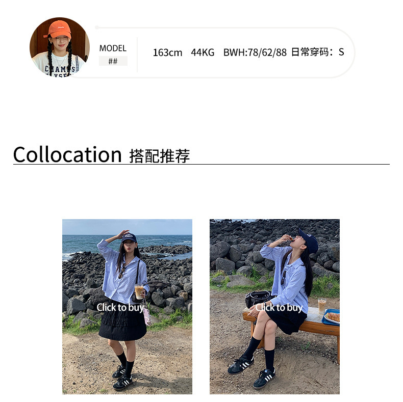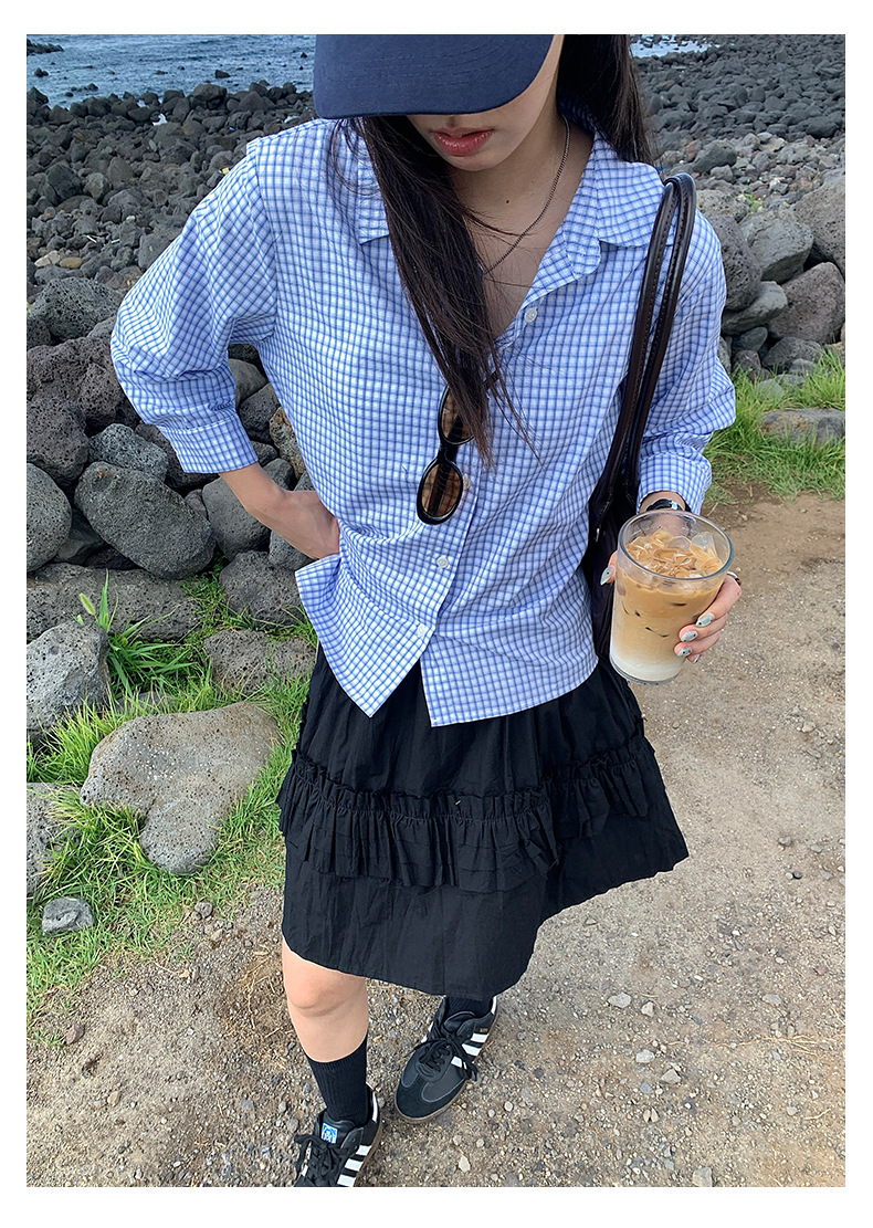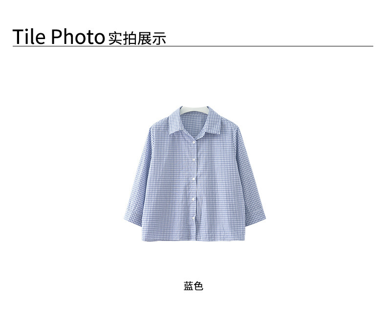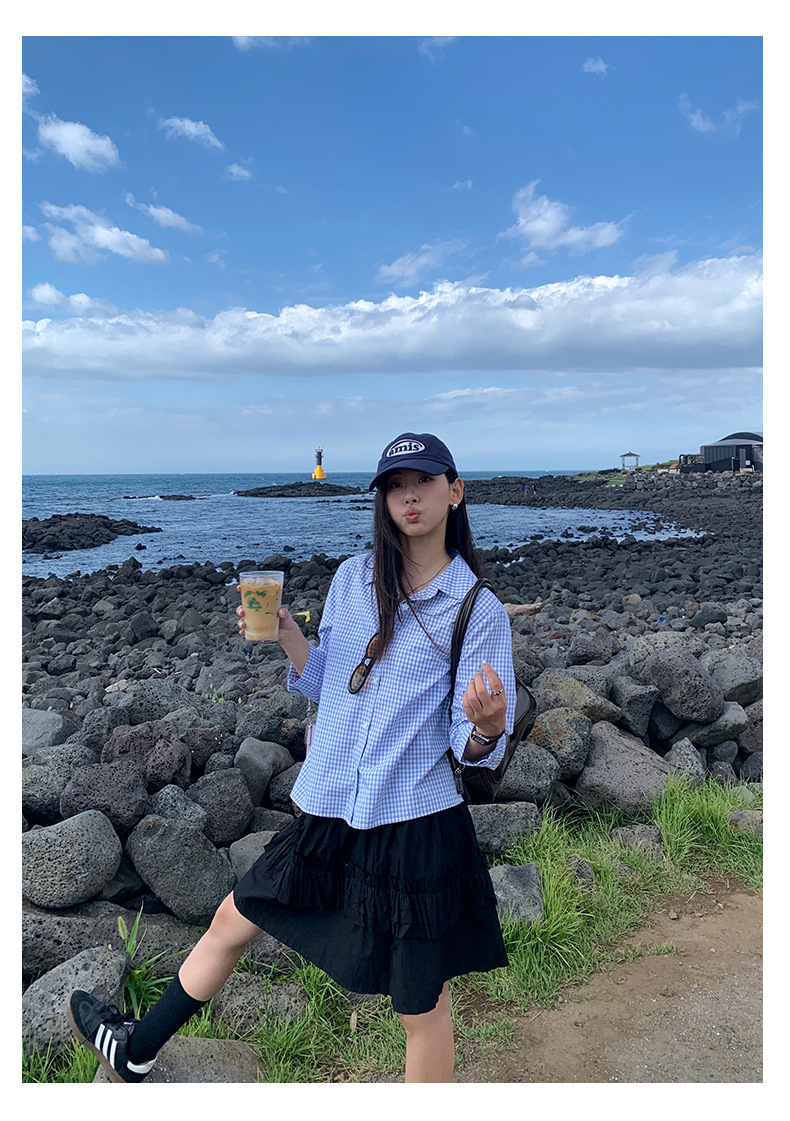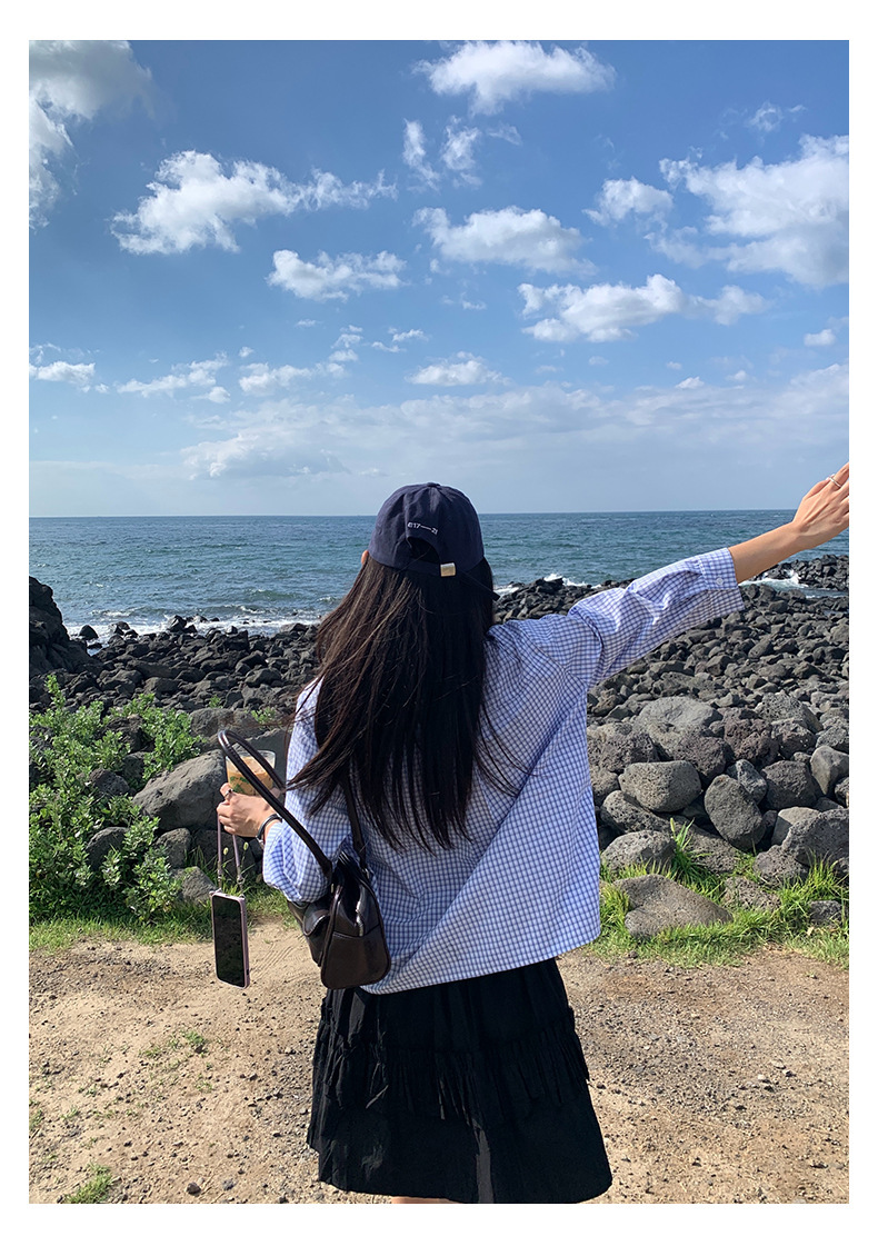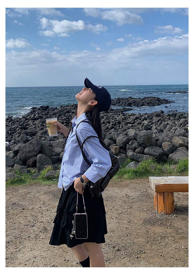 *o-ha-you*【FHZH1CA5030719】法式復古藍格子條紋POLO領防曬襯衫寬鬆休閒襯衫
