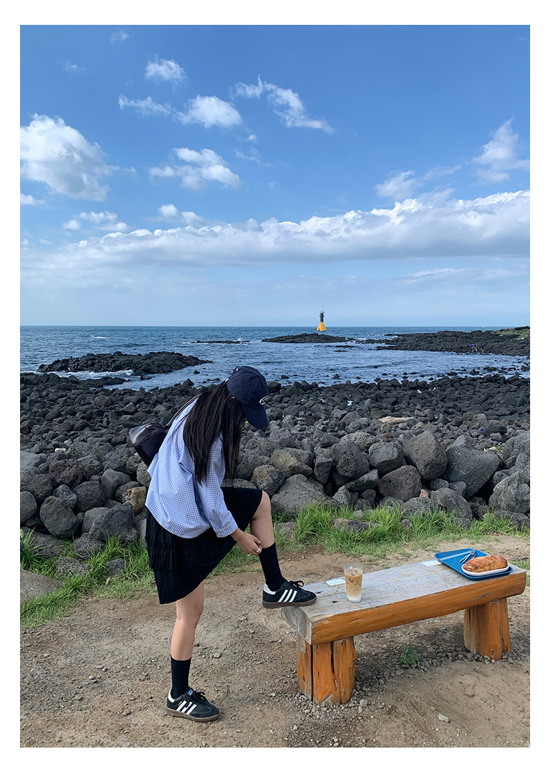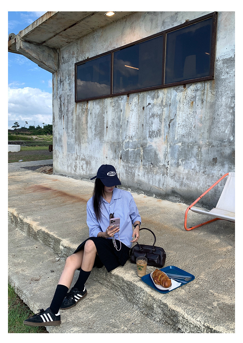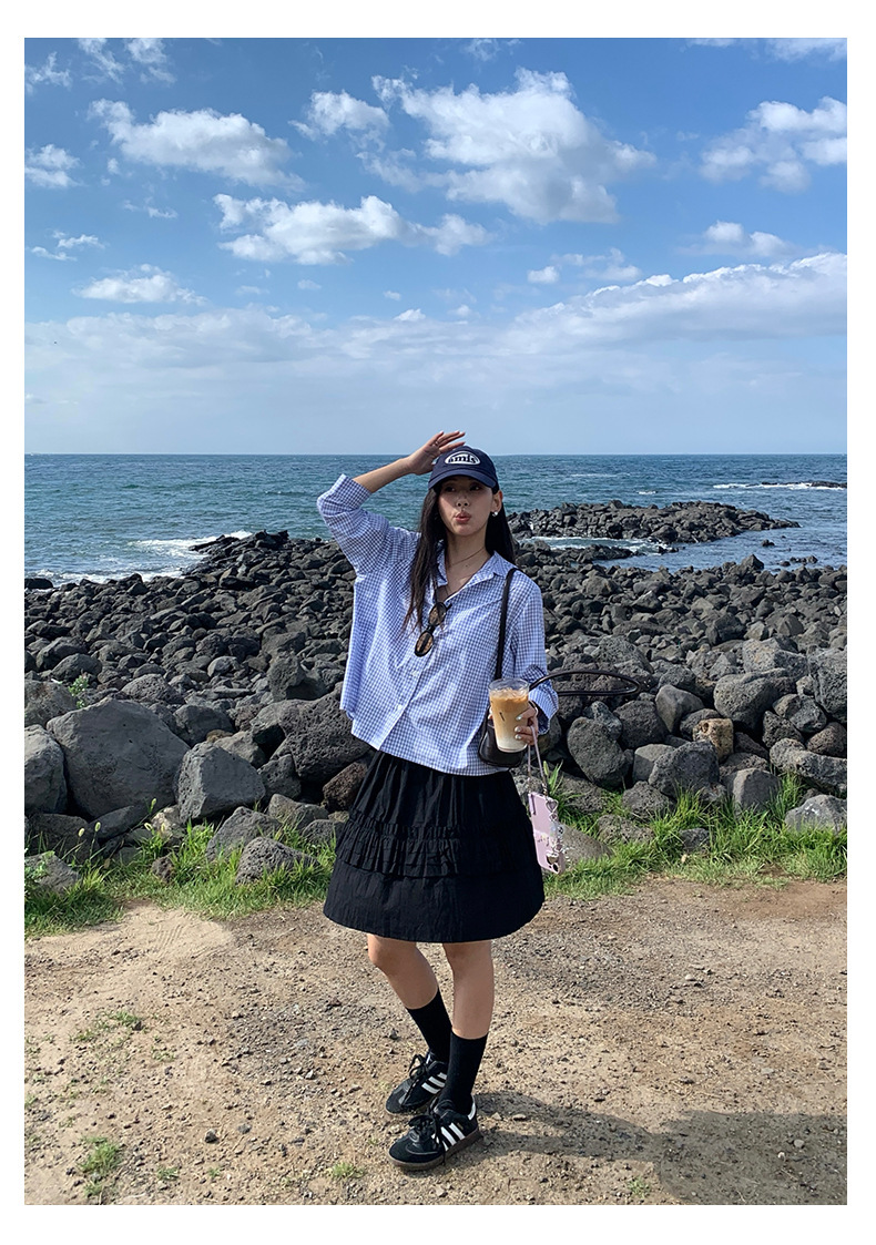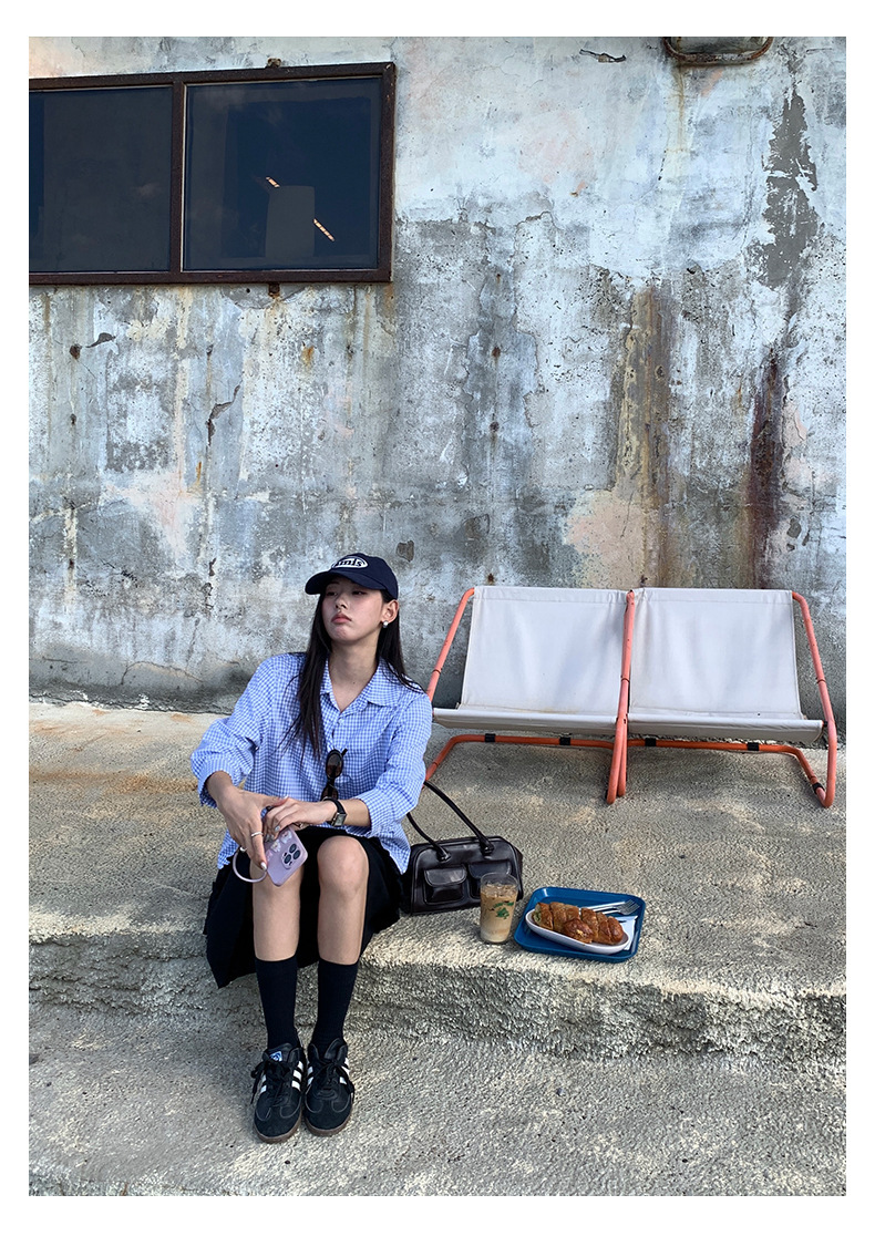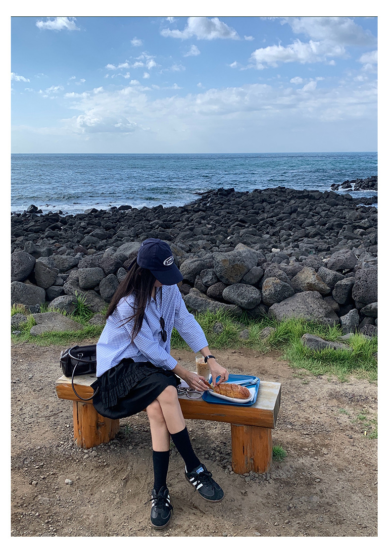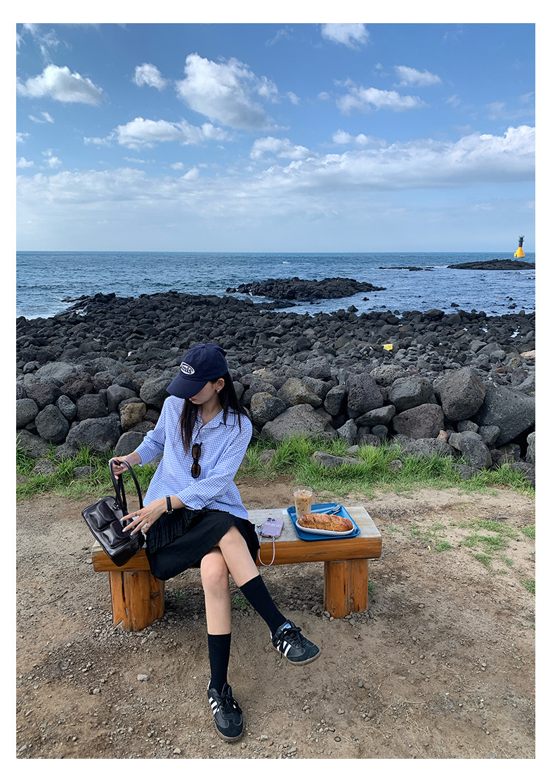 *o-ha-you*【FHZH1CA5030719】法式復古藍格子條紋POLO領防曬襯衫寬鬆休閒襯衫