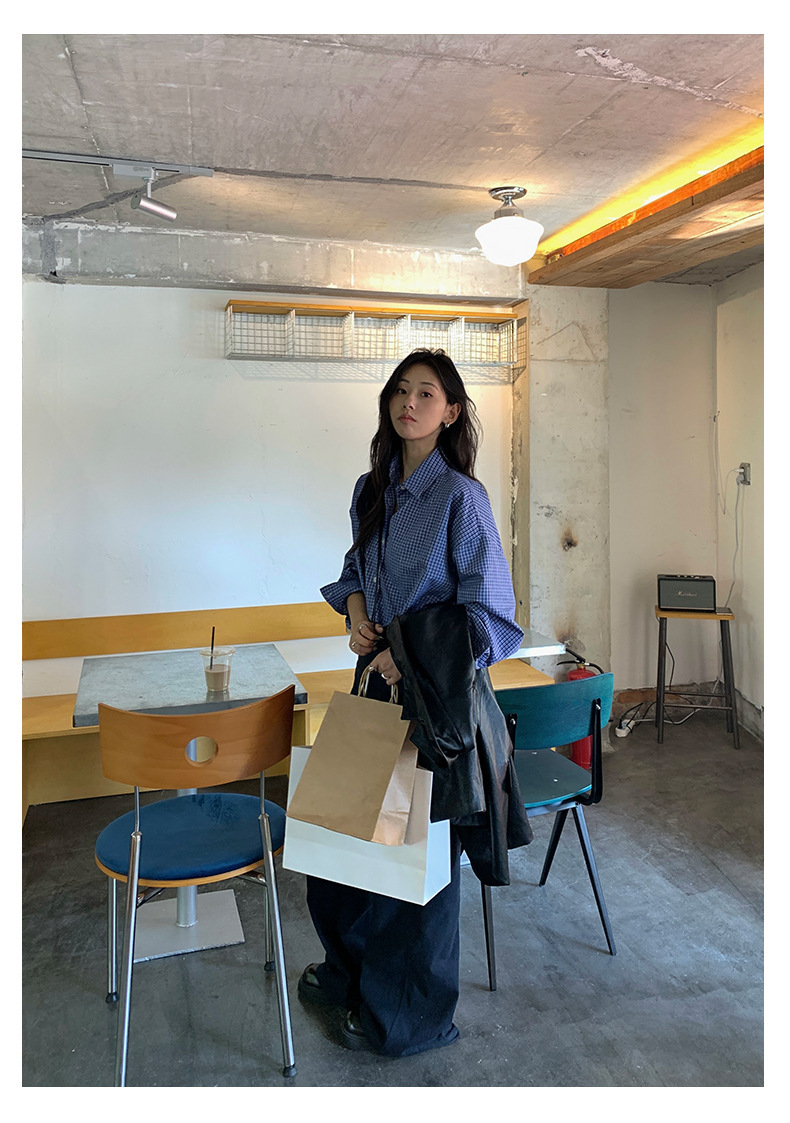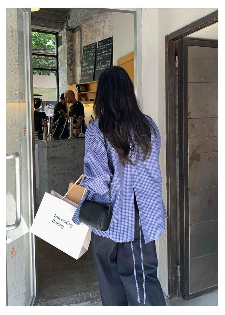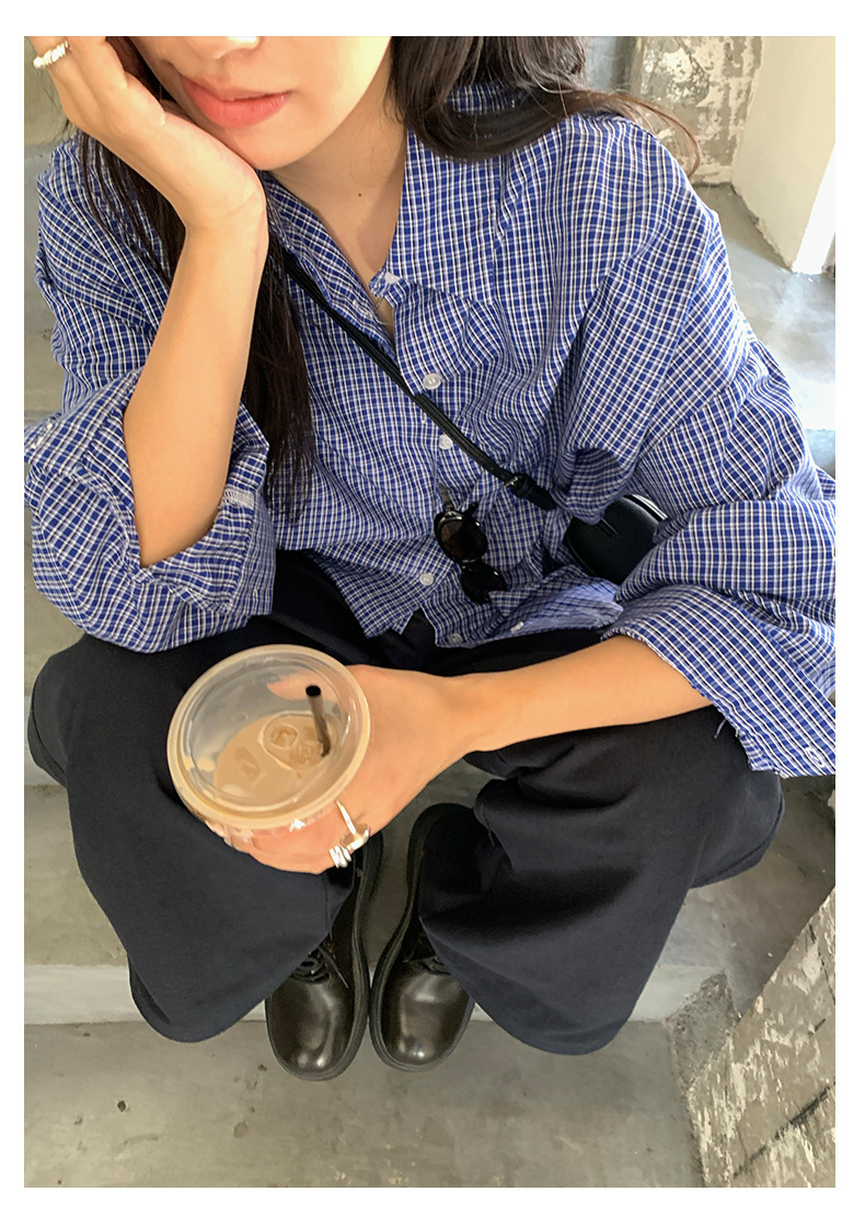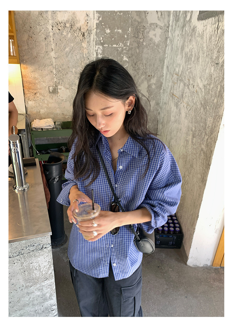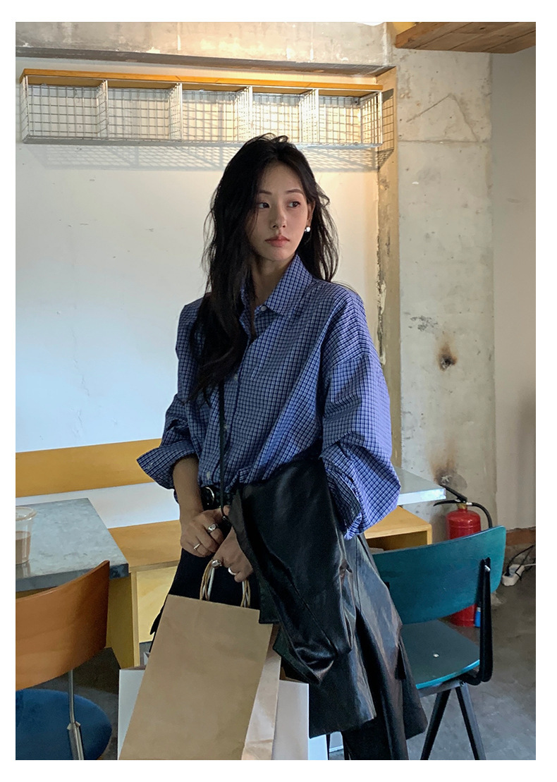 *o-ha-you*【FHZH1CA5030744】韓式藍色格紋長袖襯衫秋季寬鬆襯衣後背開叉設計