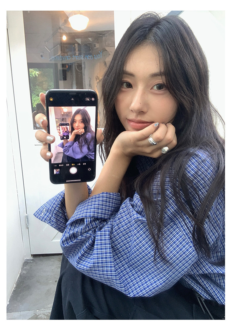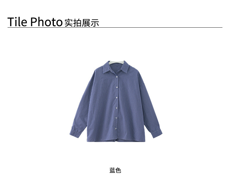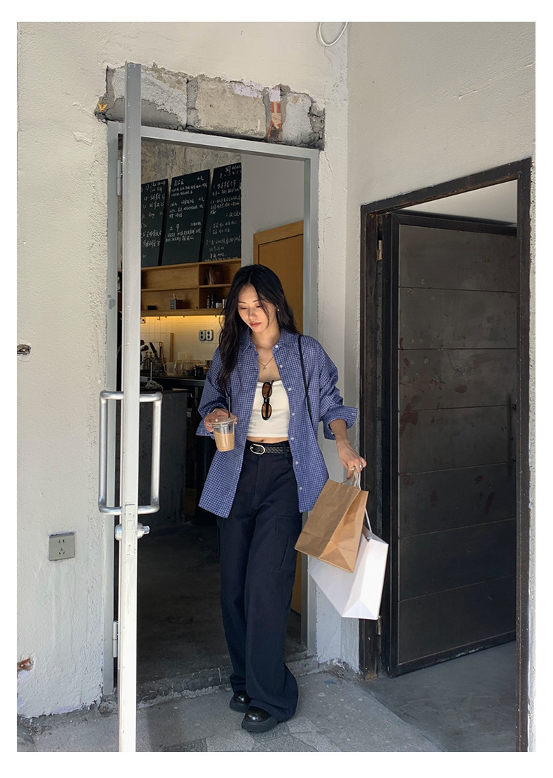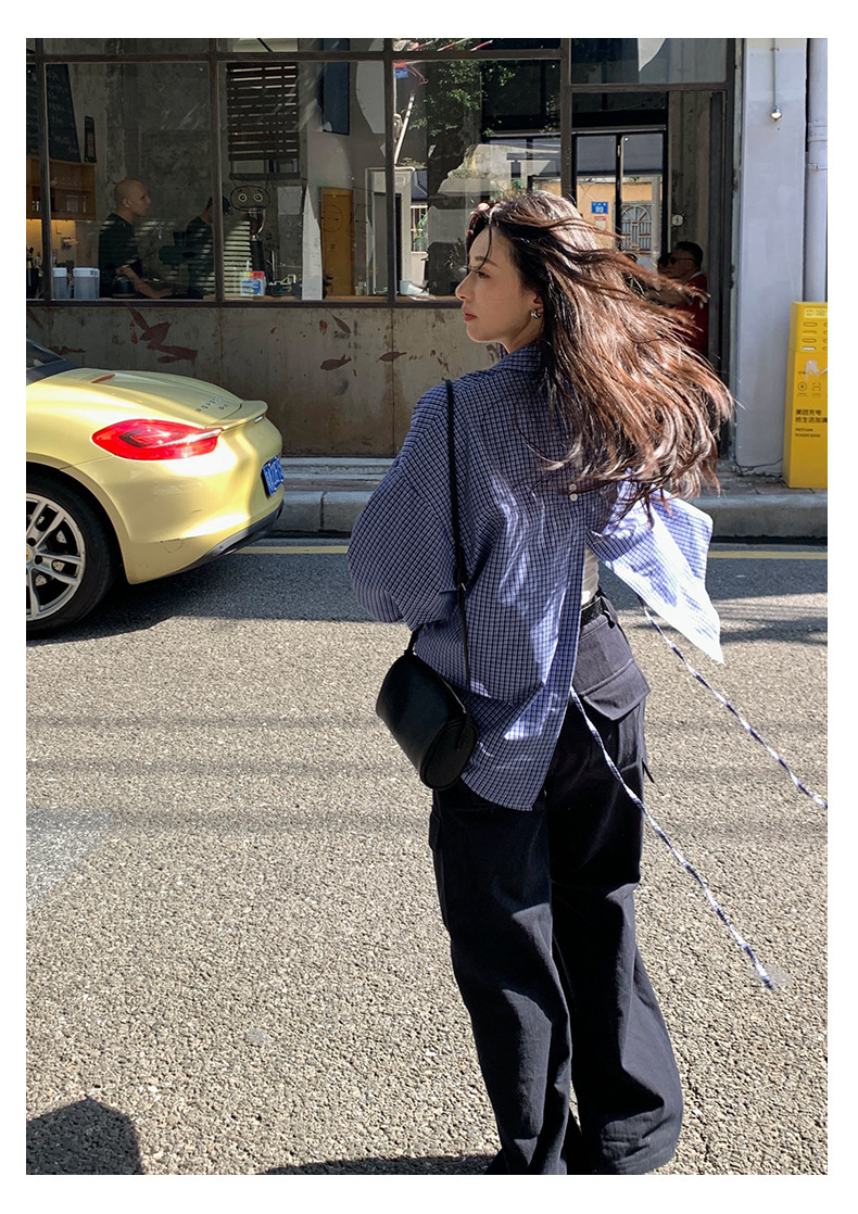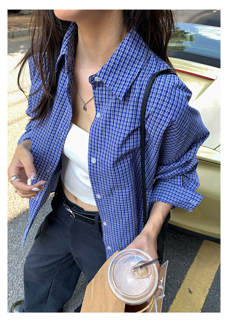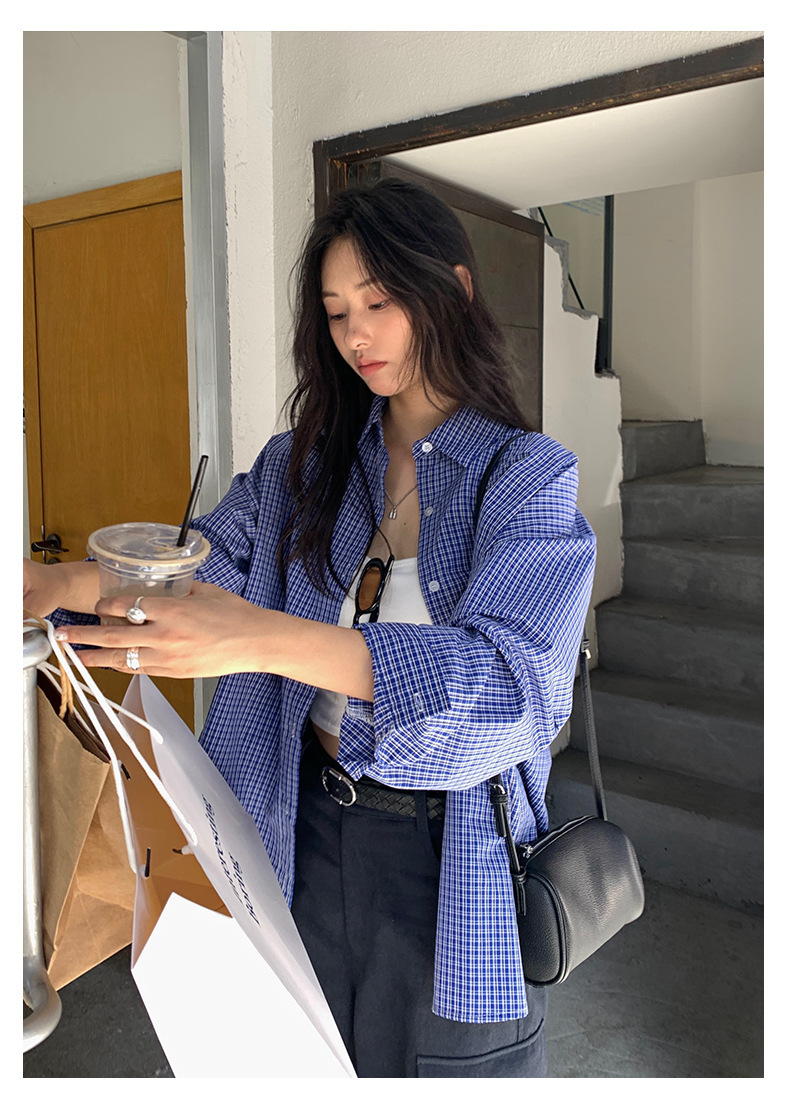 *o-ha-you*【FHZH1CA5030744】韓式藍色格紋長袖襯衫秋季寬鬆襯衣後背開叉設計