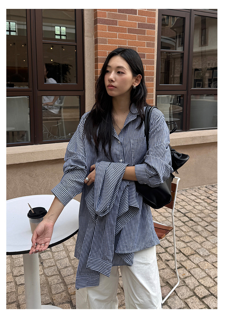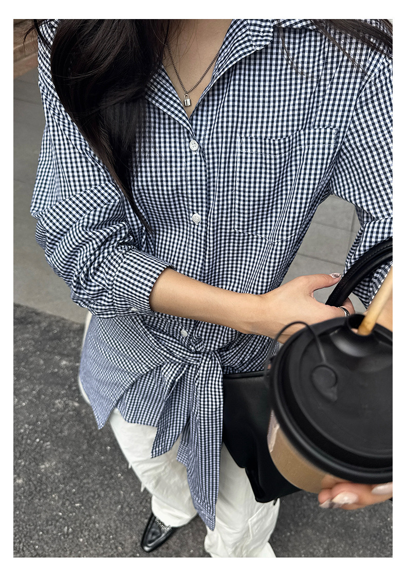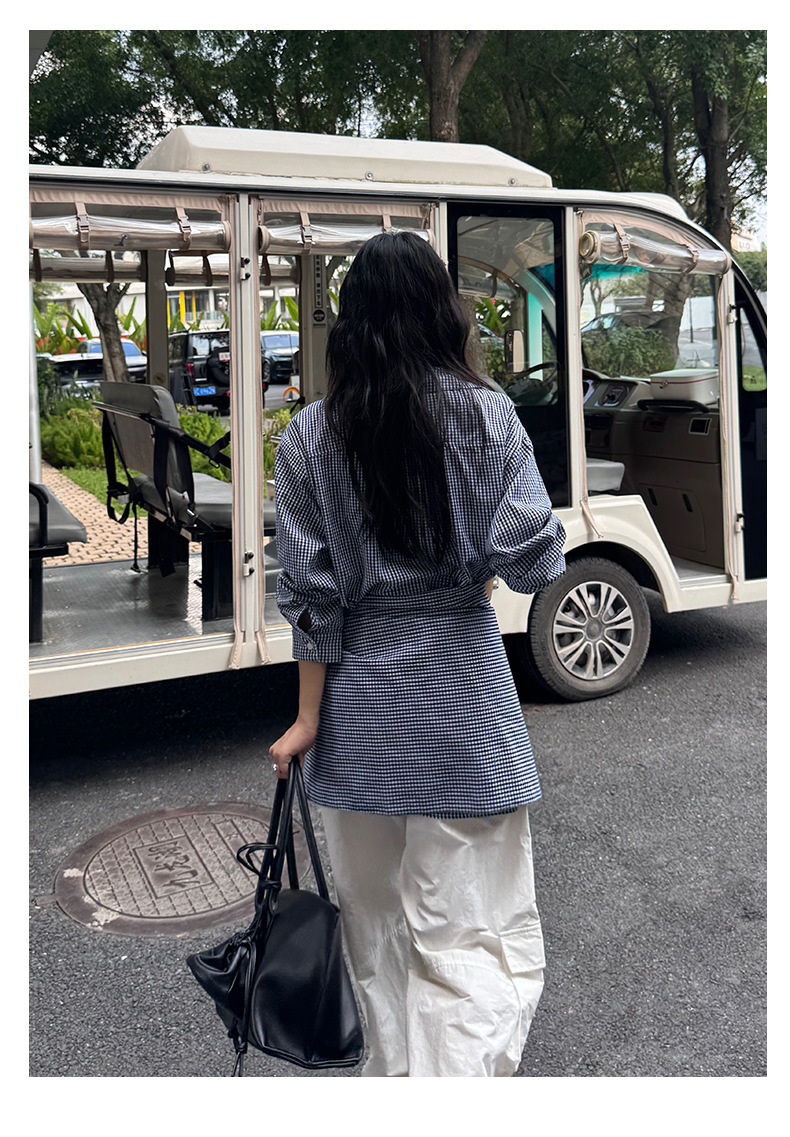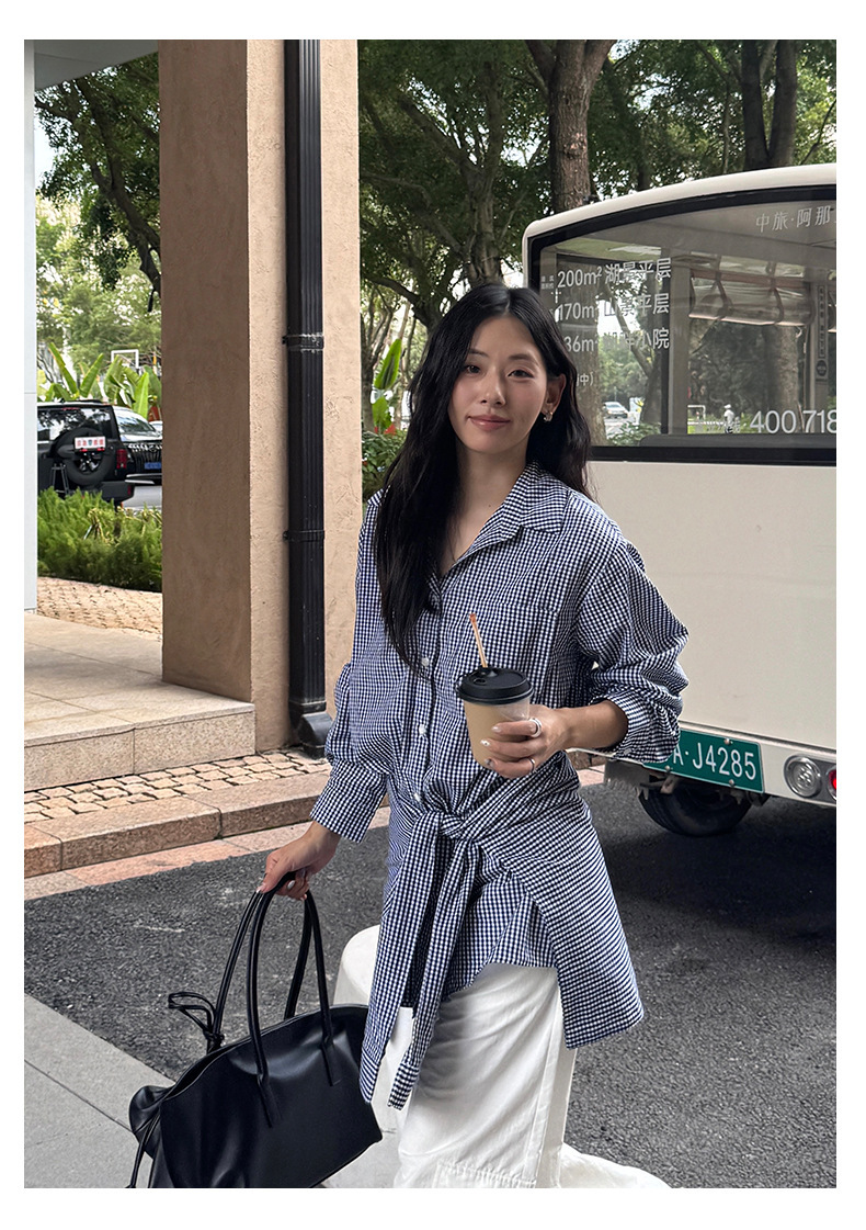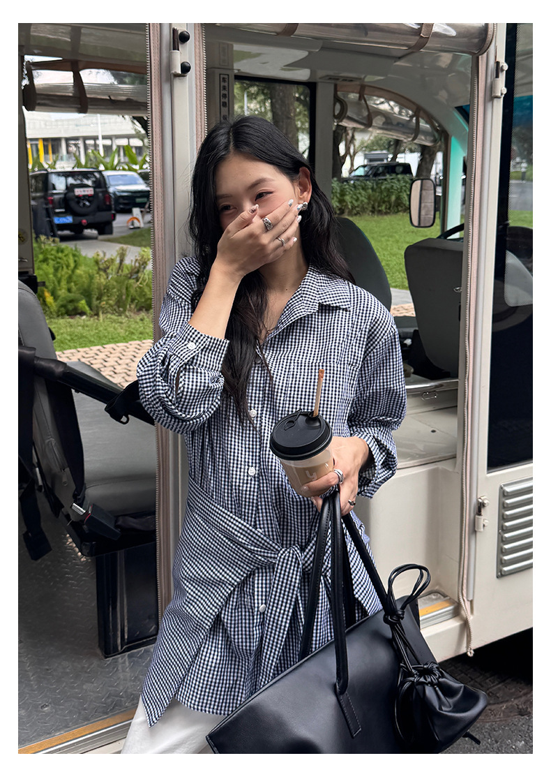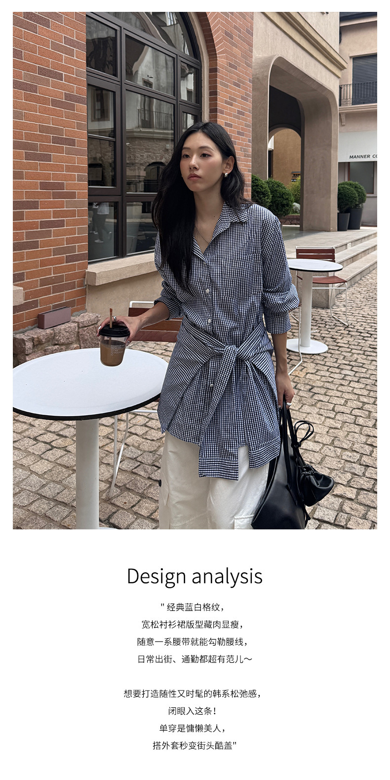 *o-ha-you*【FHZH1CA5030750】韓版秋季新款復古百搭顯瘦屁簾綁腰格紋長袖襯衫疊穿上衣