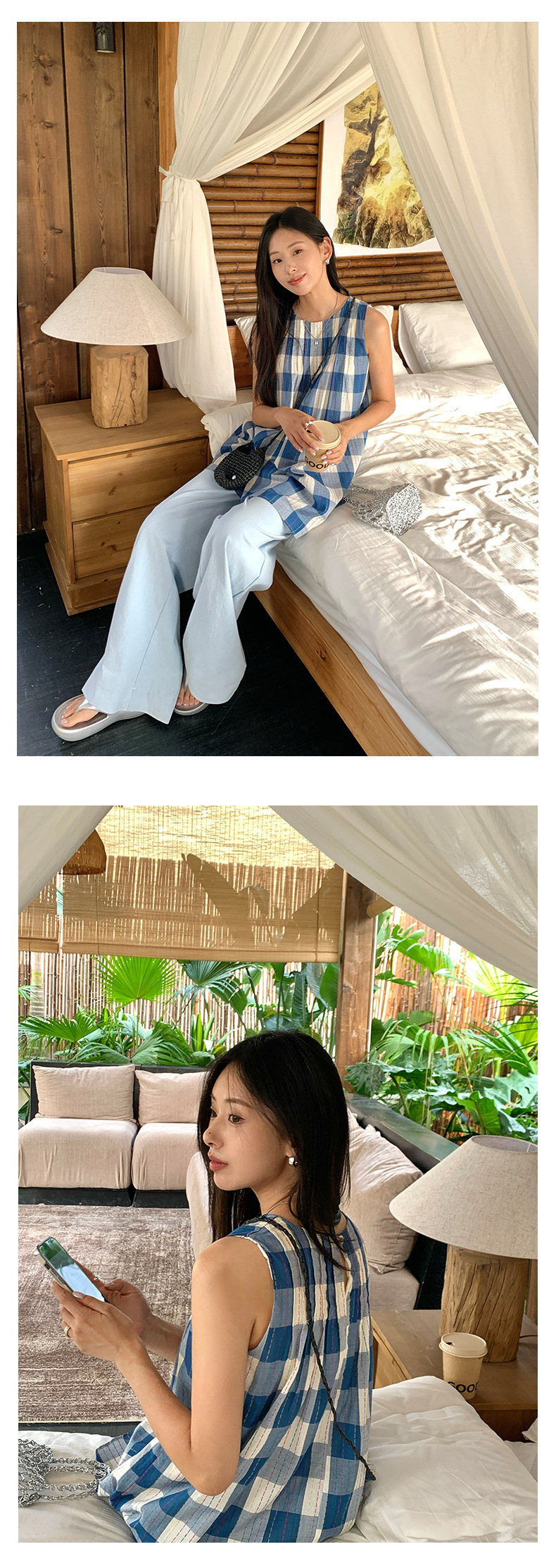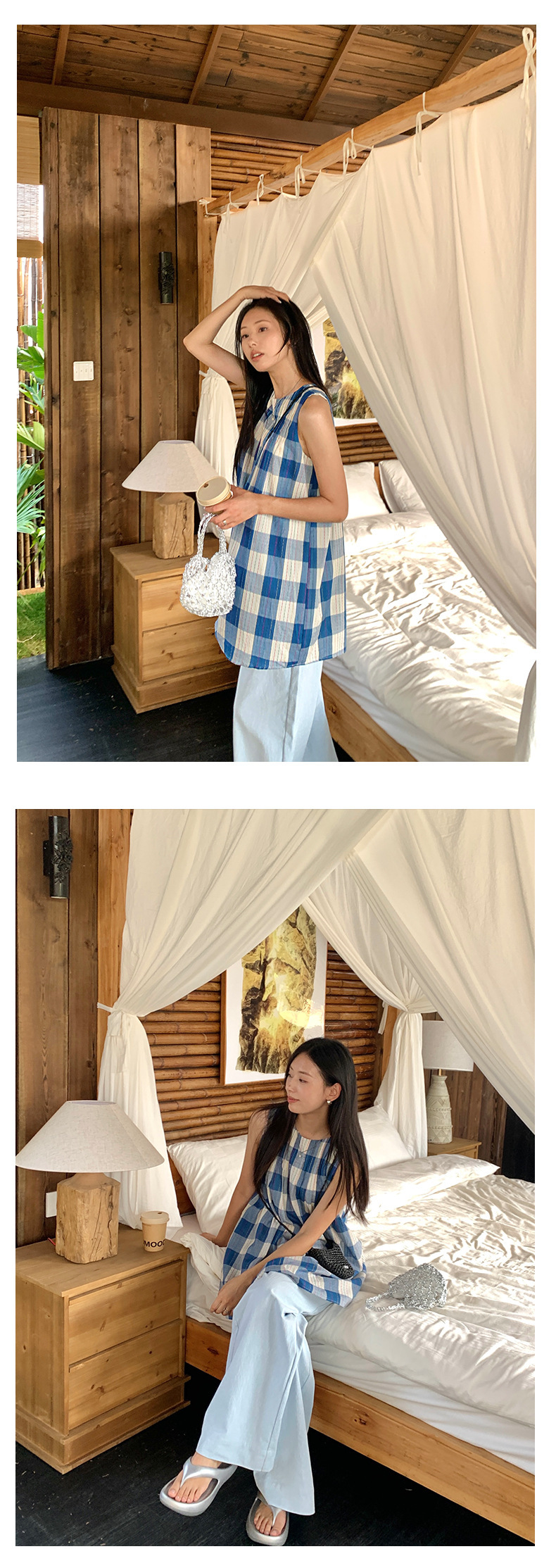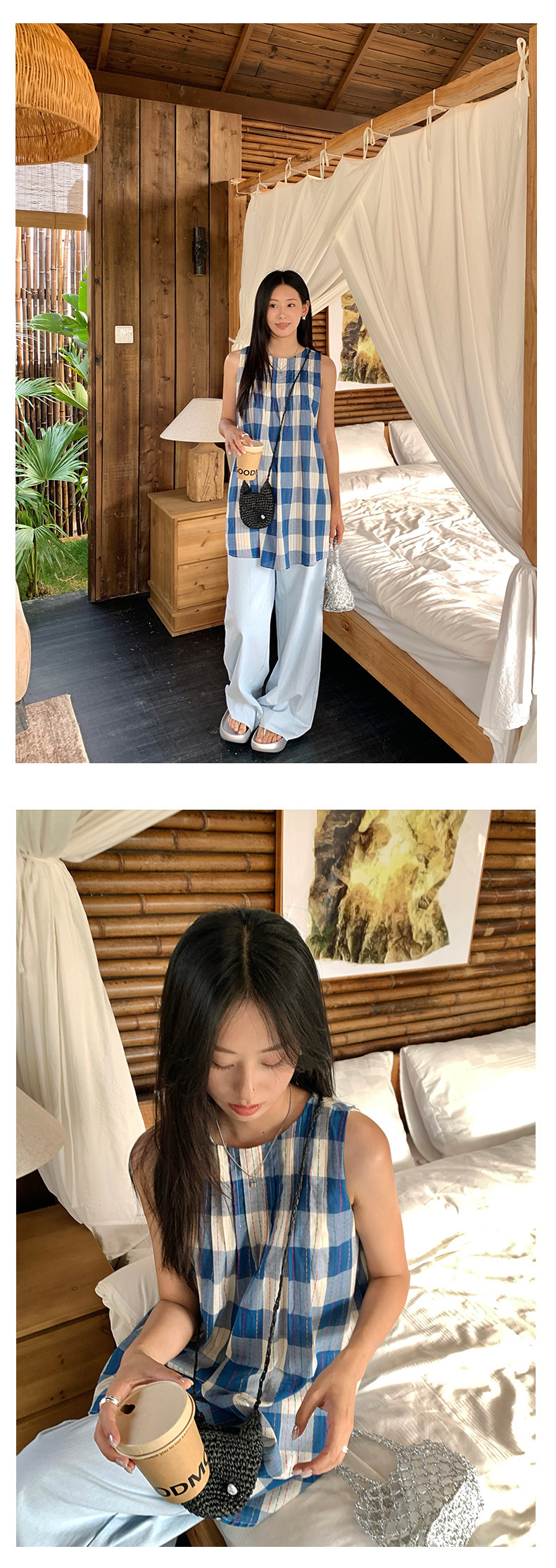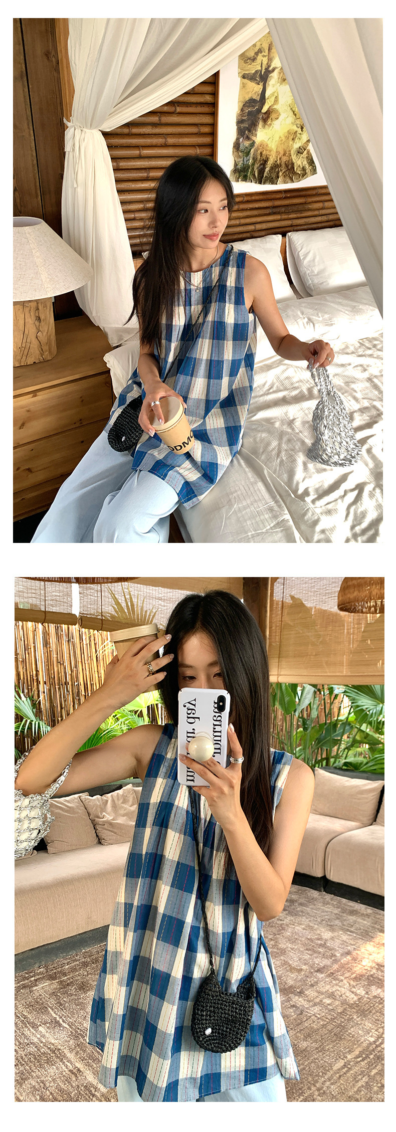 *o-ha-you*【FHZH1CH5020410】韓系背心裙時尚拼接格子裙打褶復古藍格紋色織連衣裙洋裝