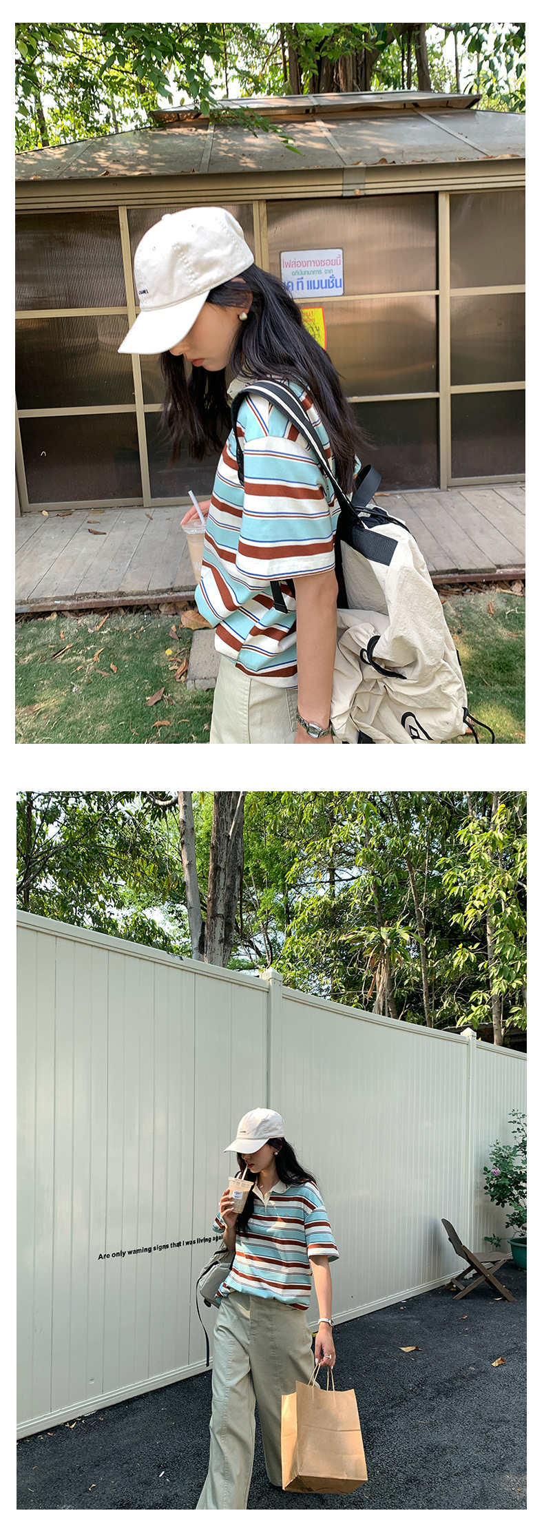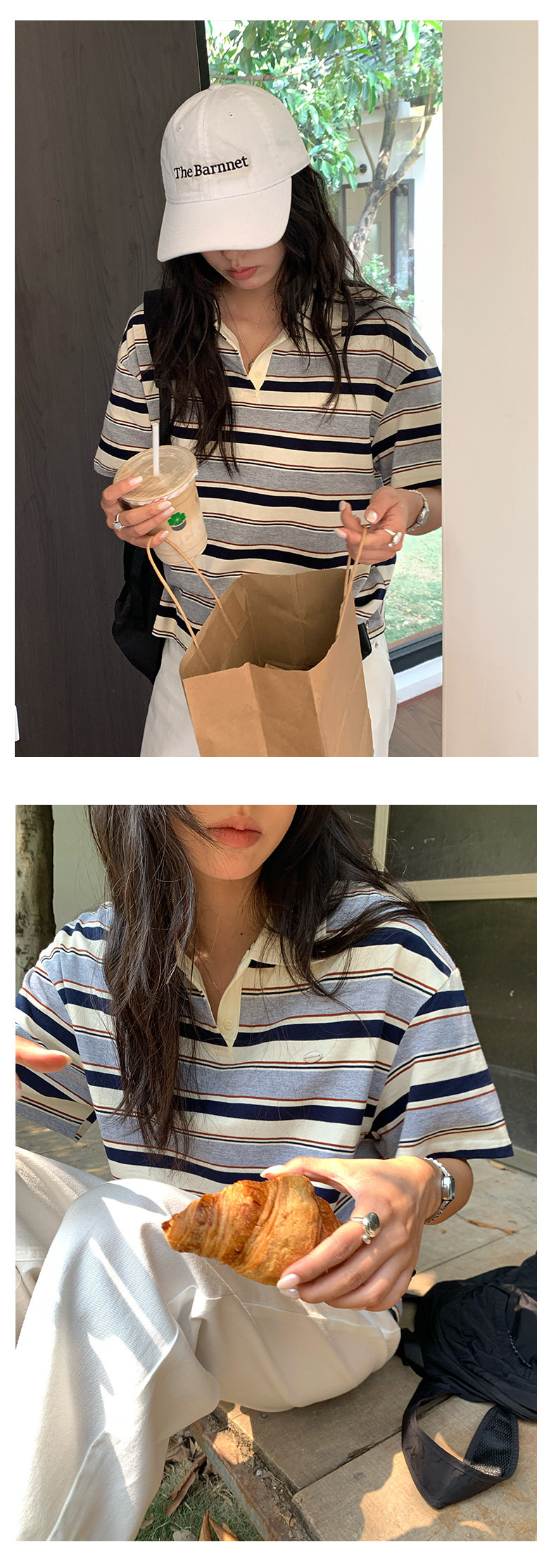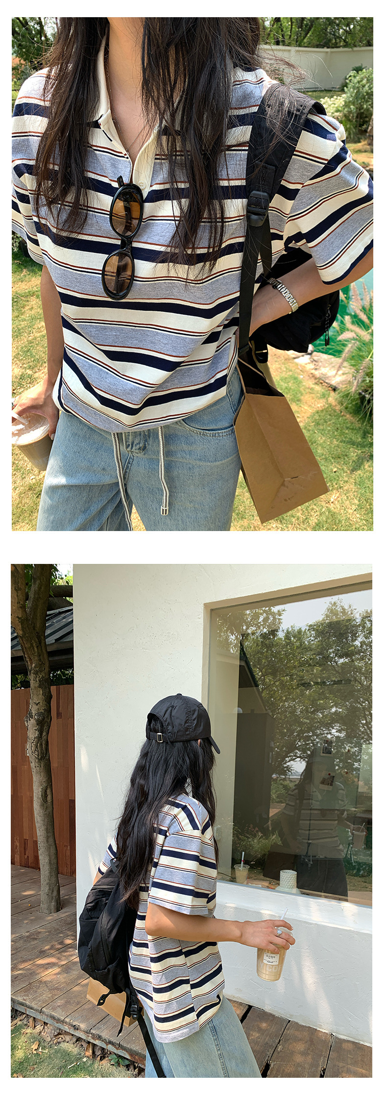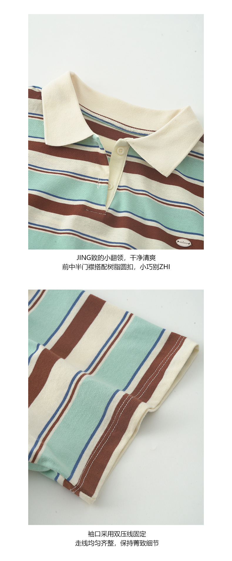 *o-ha-you*【FHZH1DA5020329】撞色條紋polo領鈕扣裝飾寬鬆短T恤2025夏款休閒時尚上衣-2色-如有需要請先諮詢
