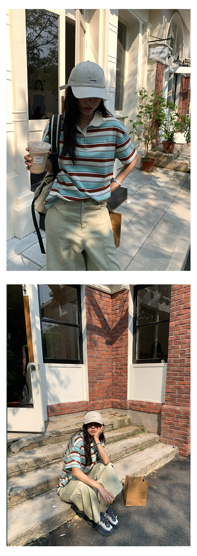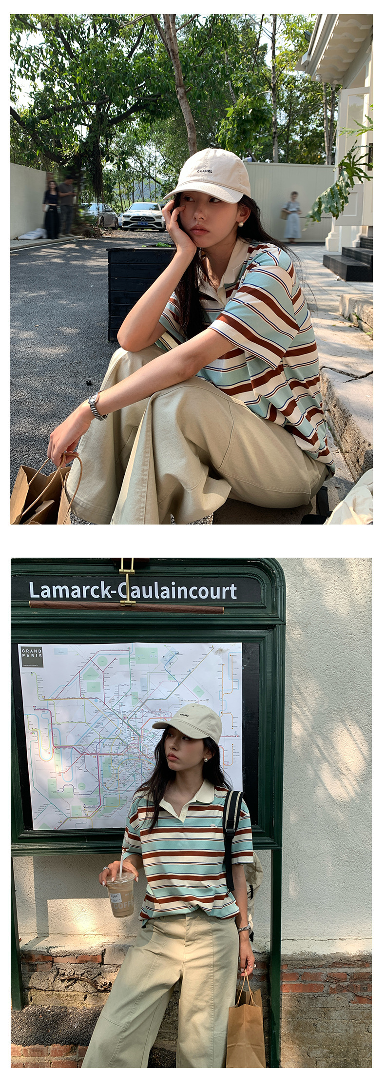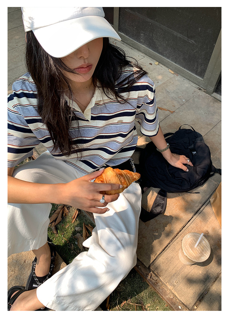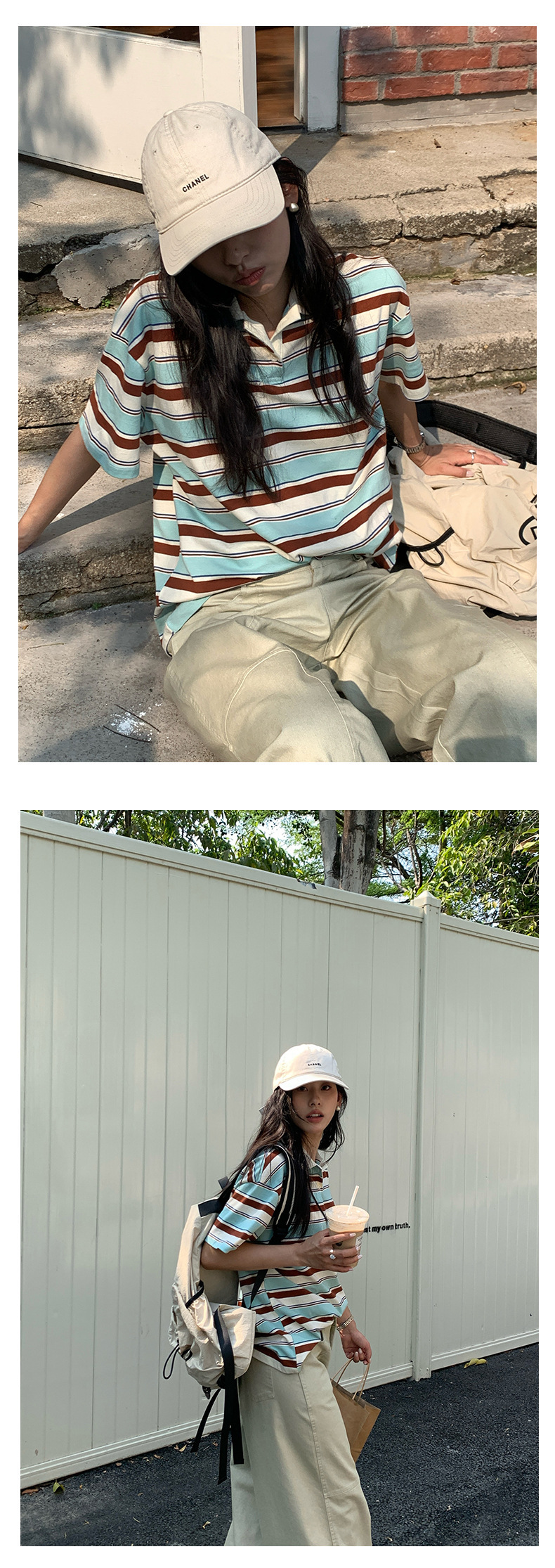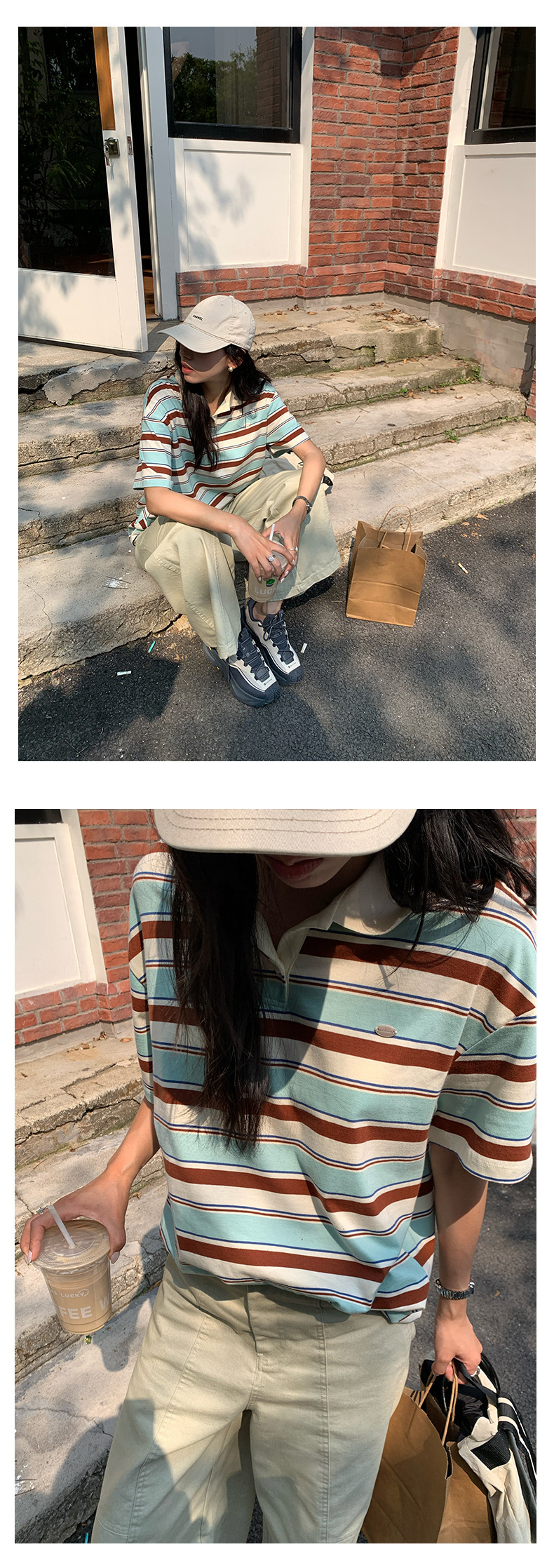 *o-ha-you*【FHZH1DA5020329】撞色條紋polo領鈕扣裝飾寬鬆短T恤2025夏款休閒時尚上衣-2色-如有需要請先諮詢
