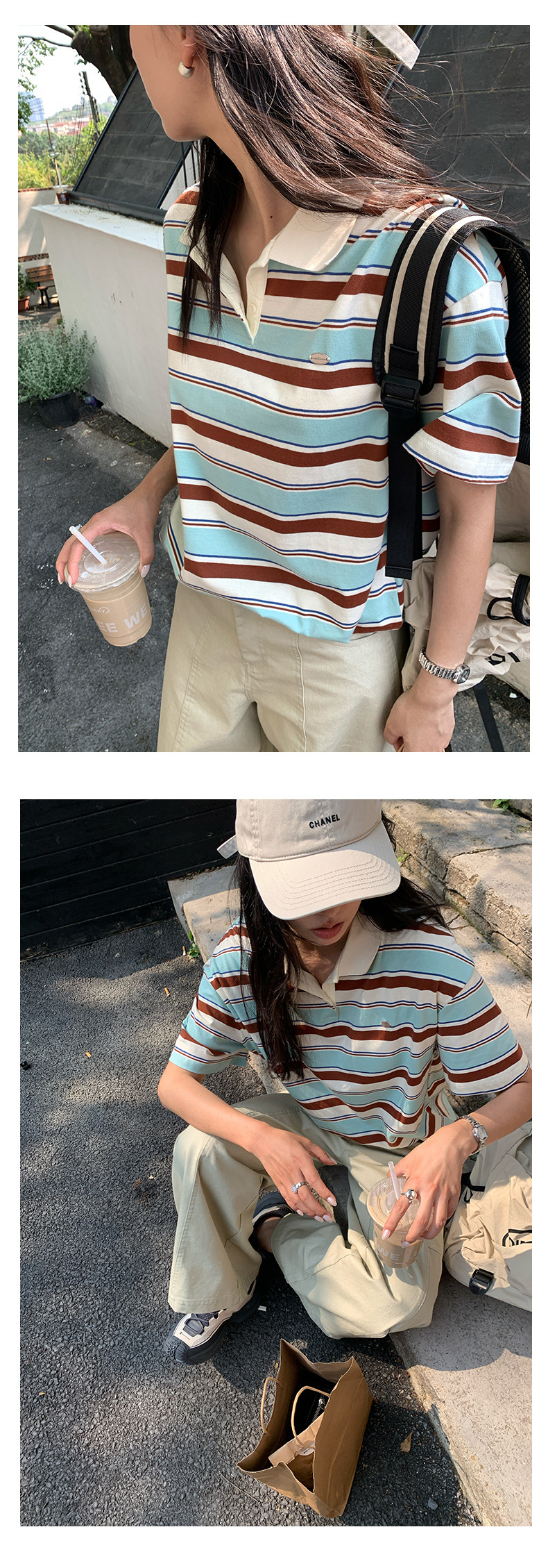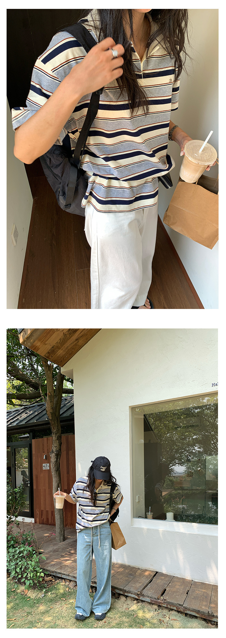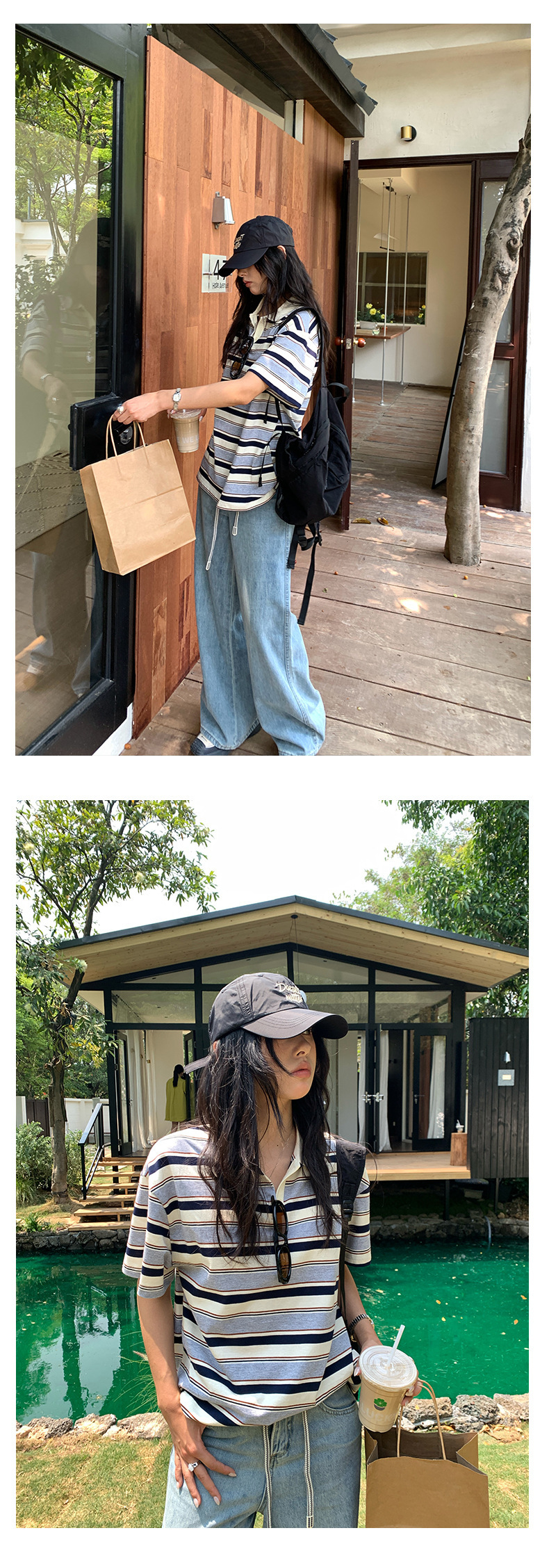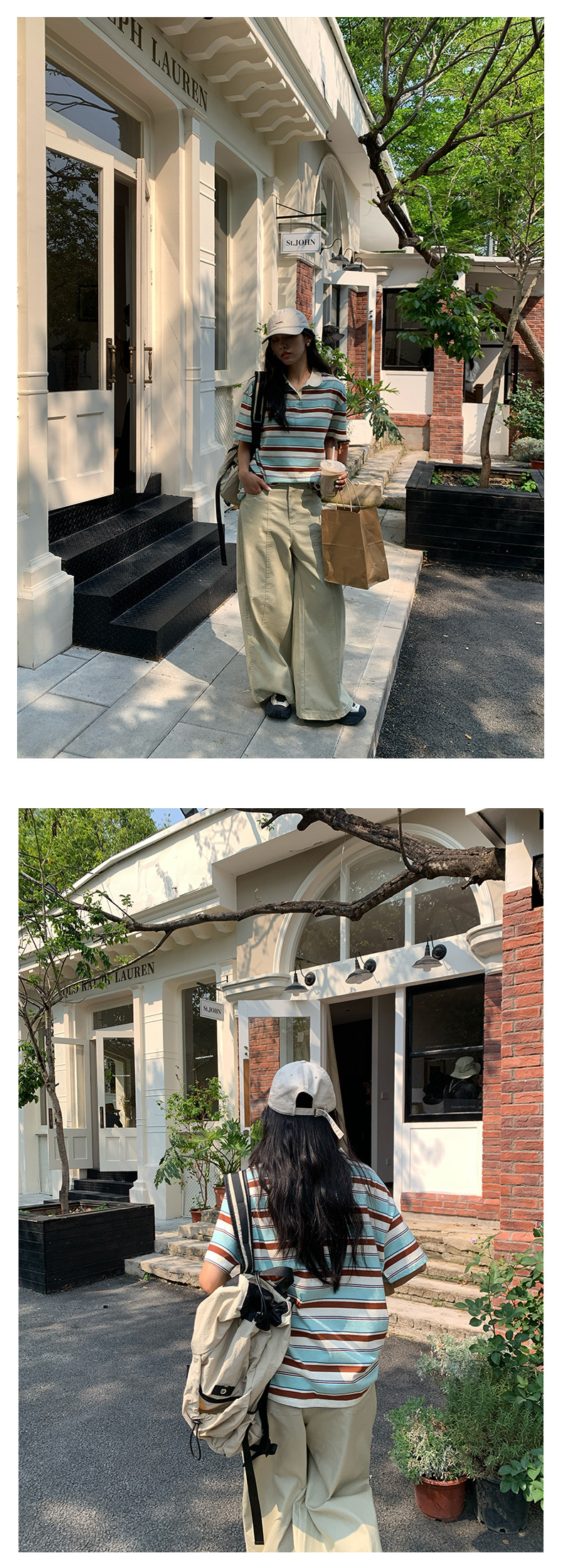 *o-ha-you*【FHZH1DA5020329】撞色條紋polo領鈕扣裝飾寬鬆短T恤2025夏款休閒時尚上衣-2色-如有需要請先諮詢