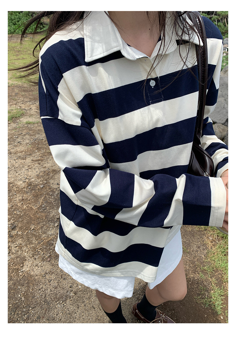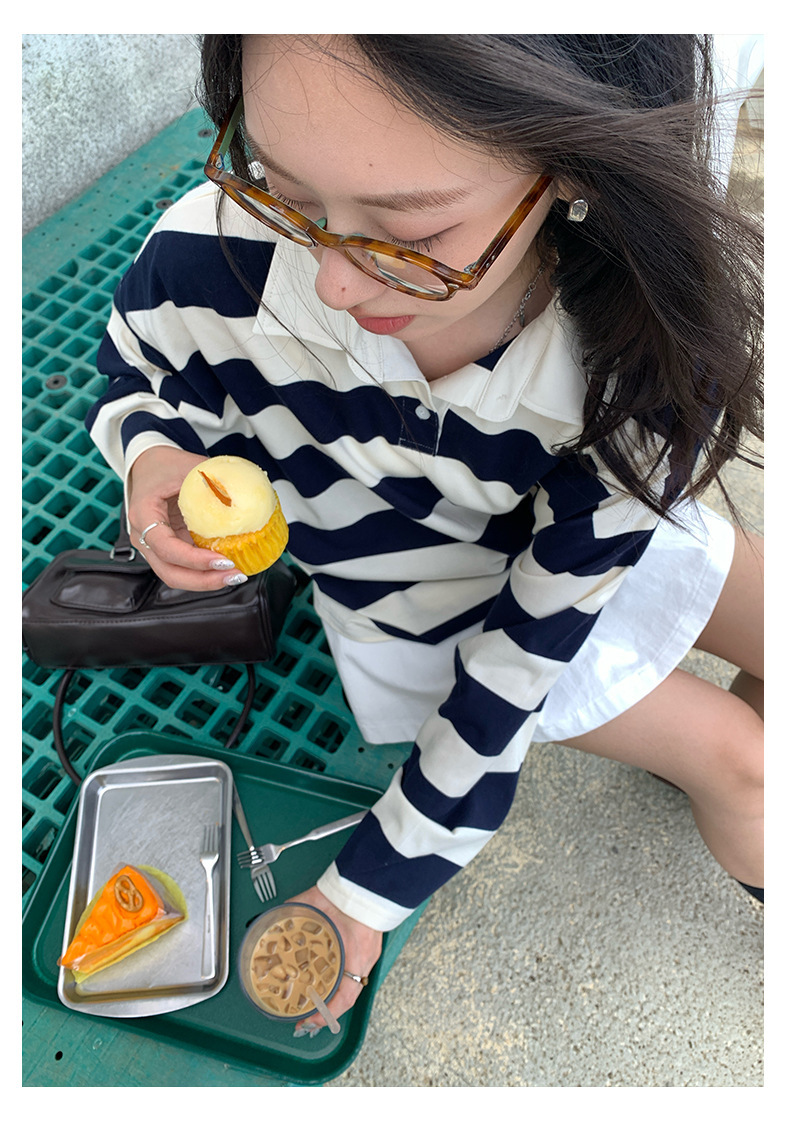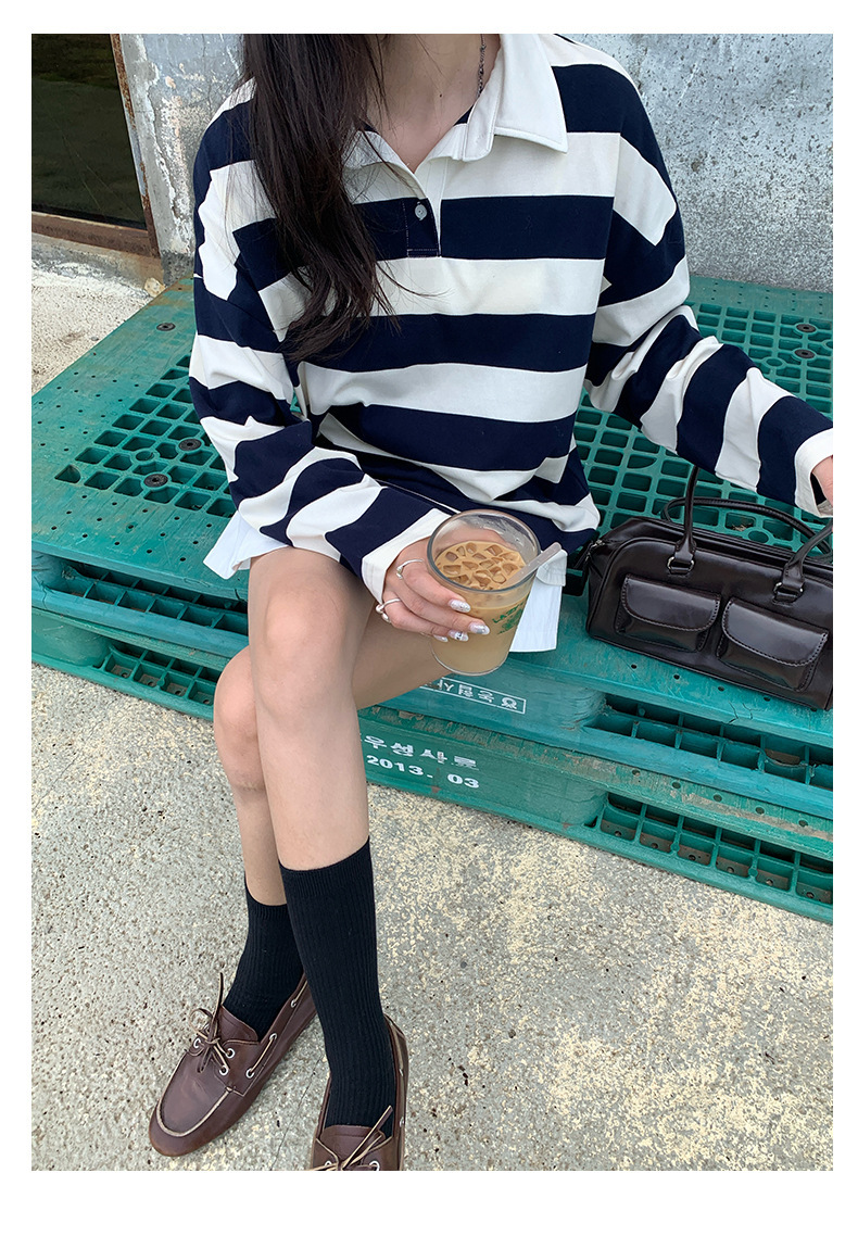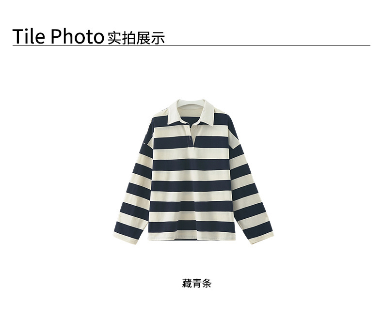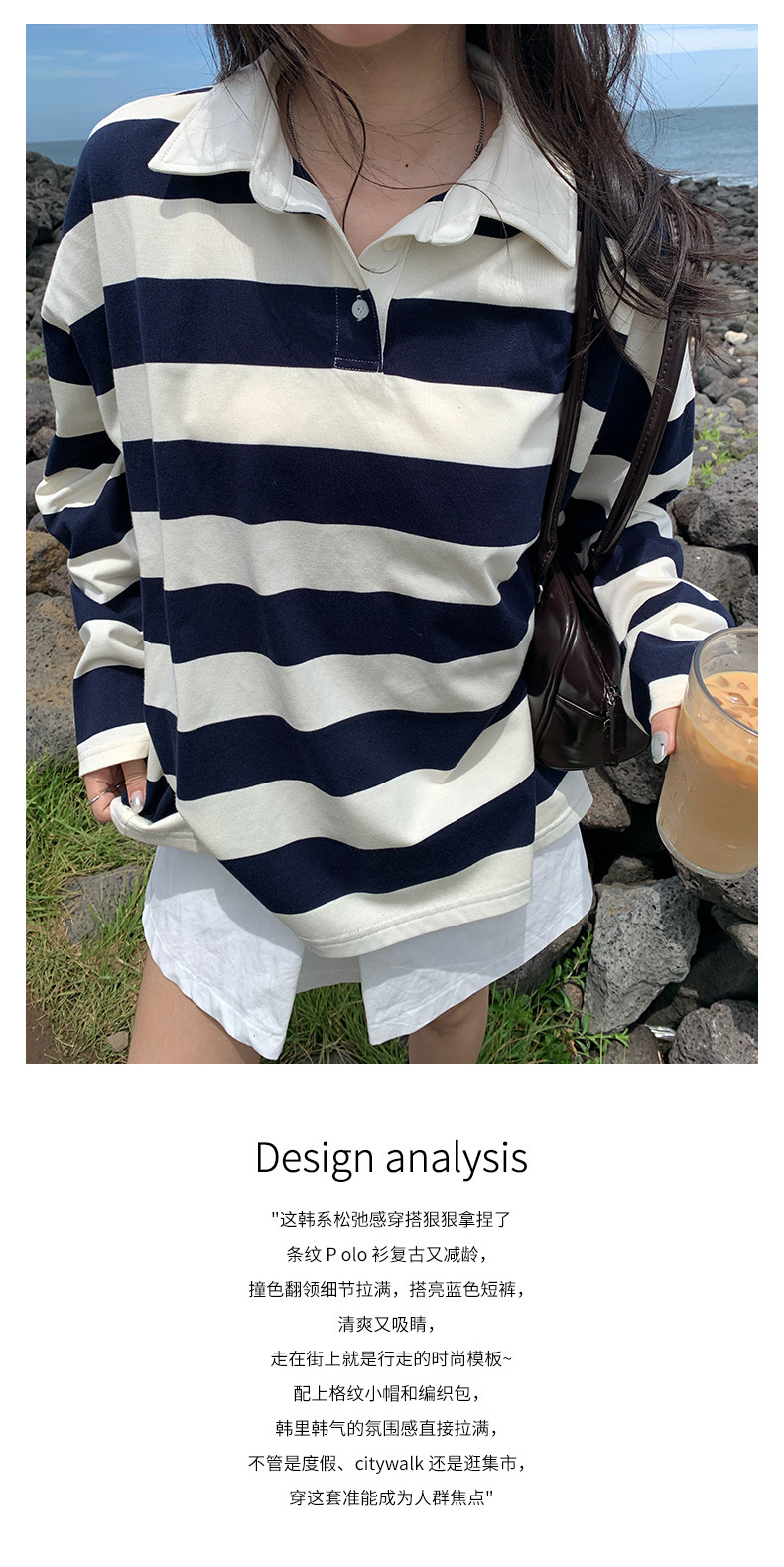 *o-ha-you*【FHZH1DB5030743】學院風翻領百搭條紋polo衛衣秋季寬鬆軟糯減齡上衣
