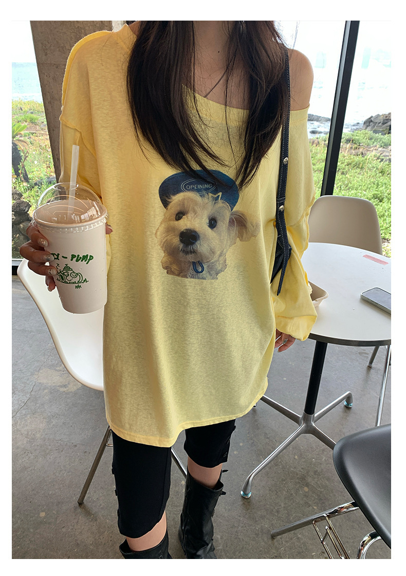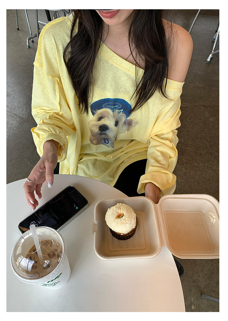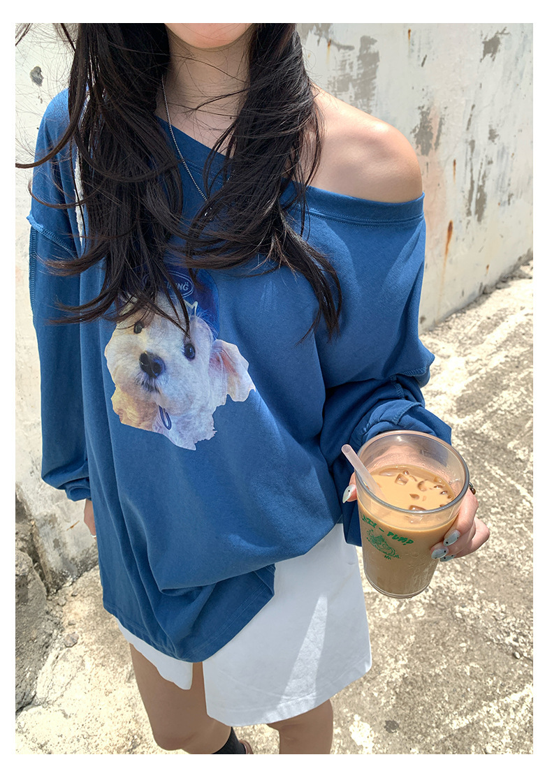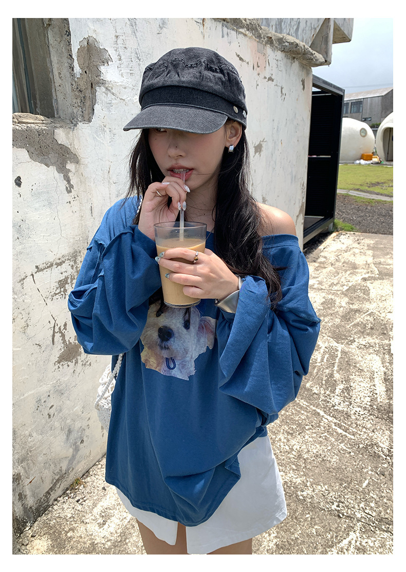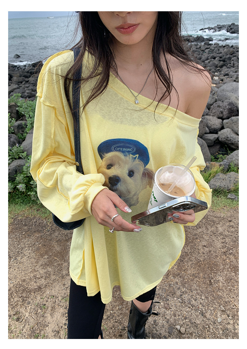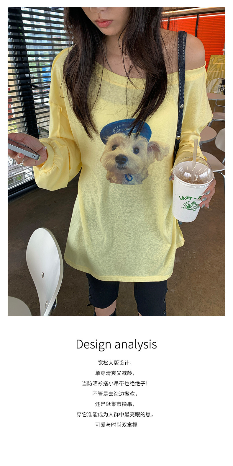 *o-ha-you*【FHZH1DC5030679】韓版秋季美式風寬鬆狗狗印花防曬衫一字肩T恤上衣-2色