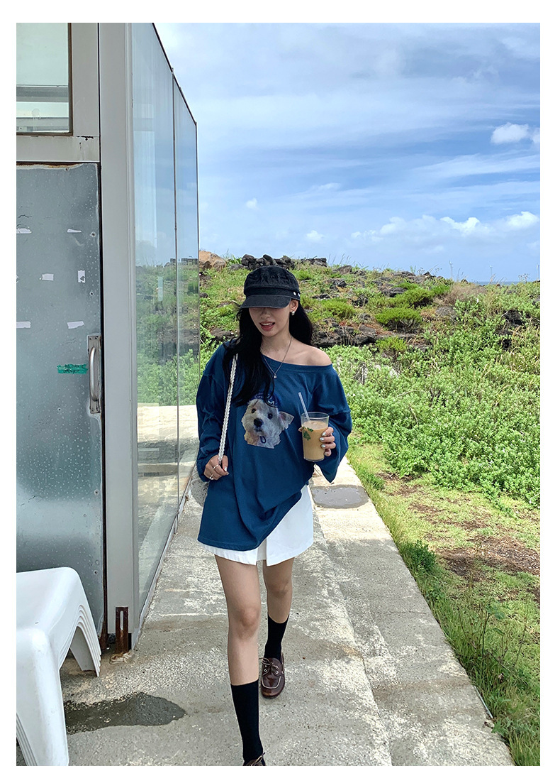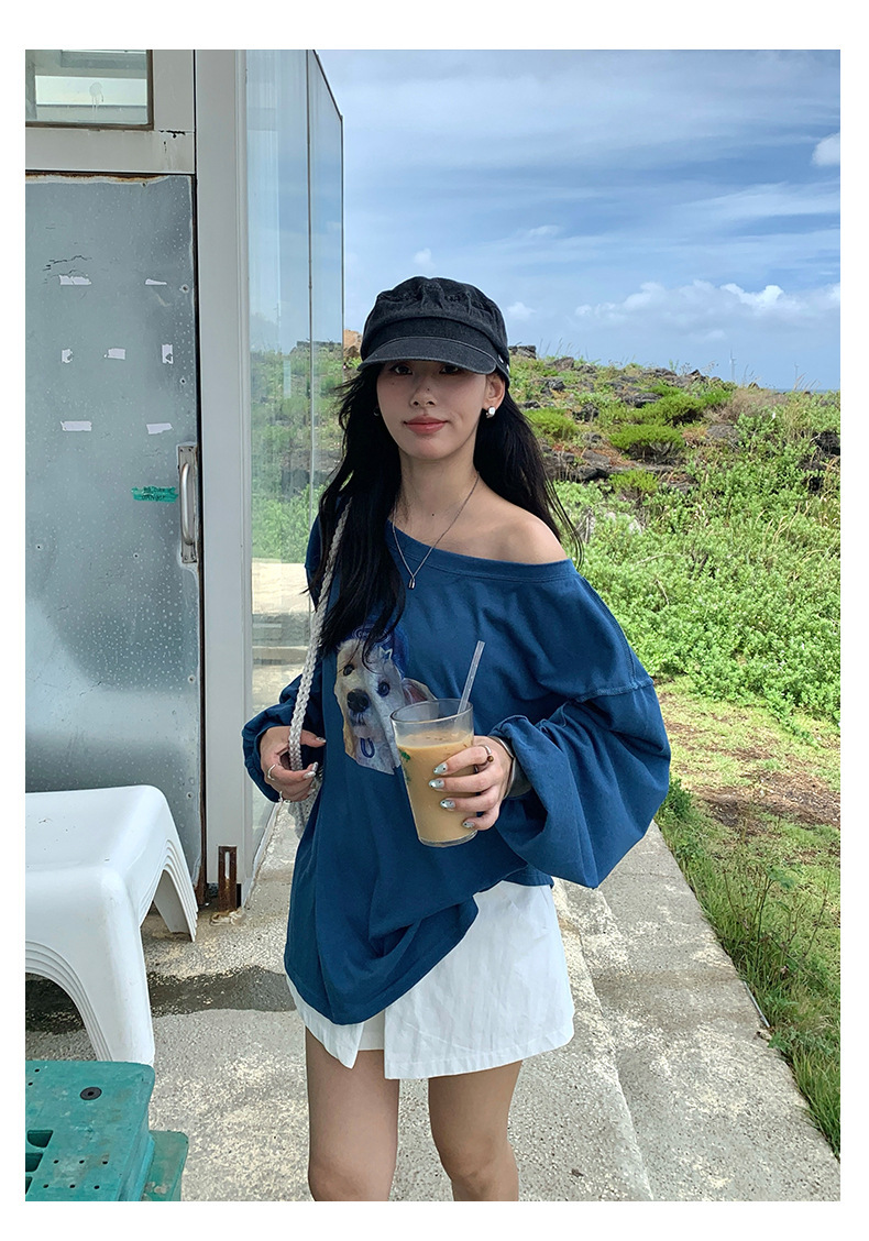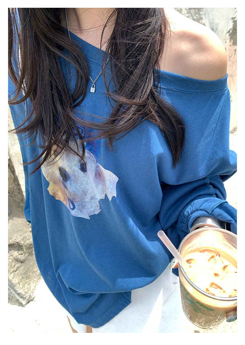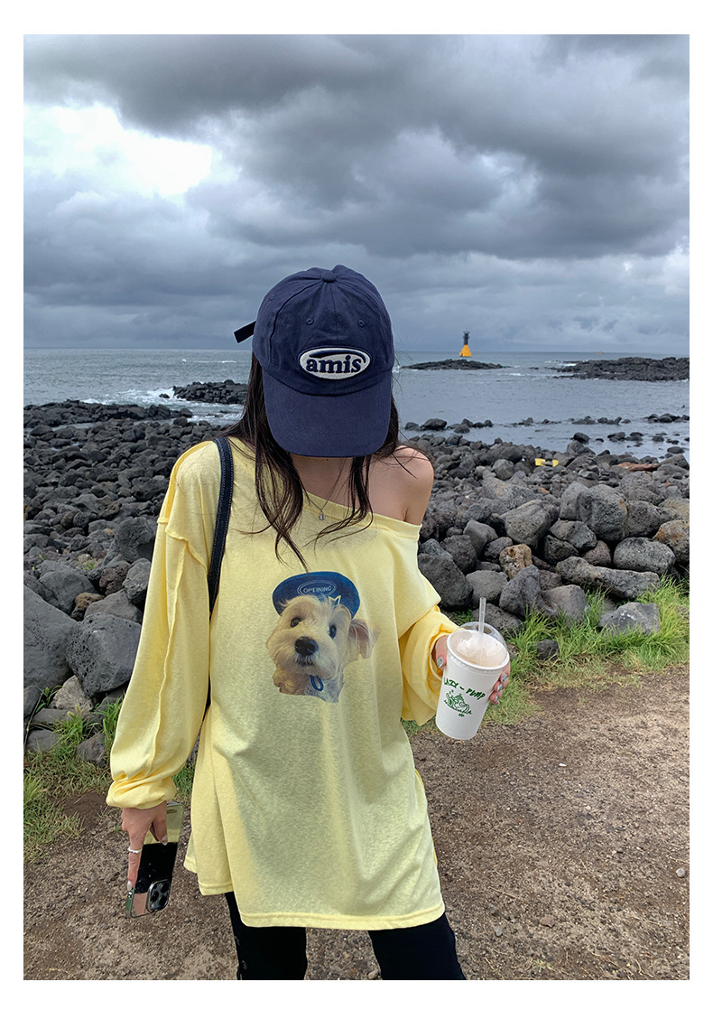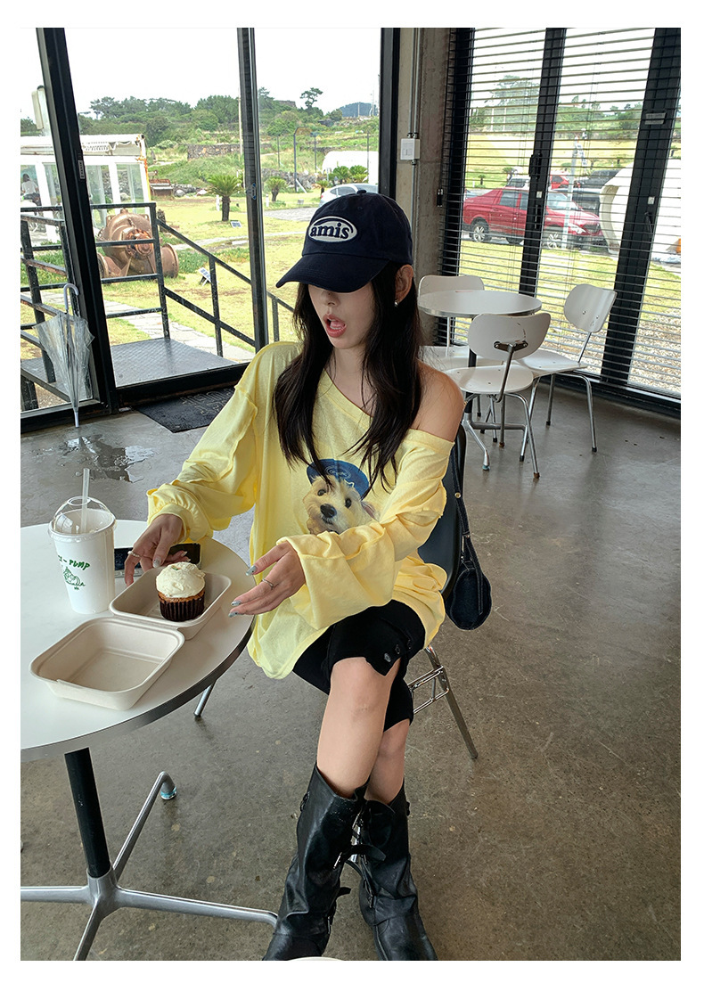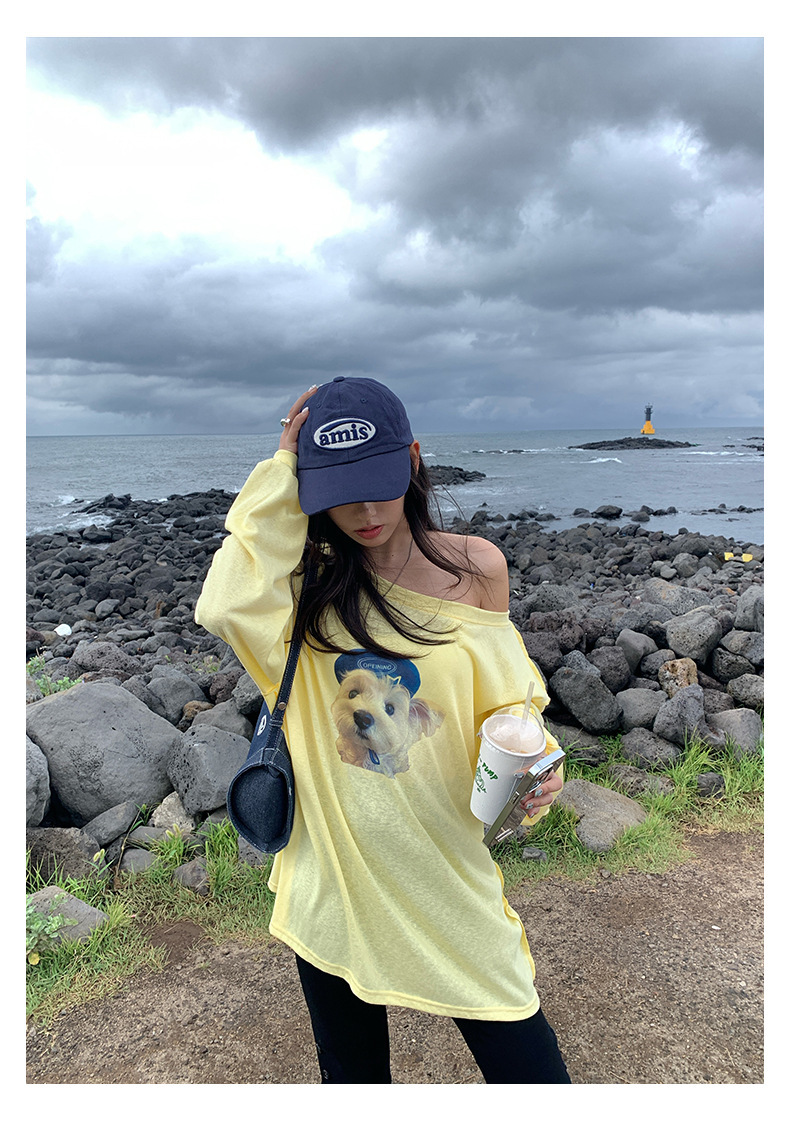 *o-ha-you*【FHZH1DC5030679】韓版秋季美式風寬鬆狗狗印花防曬衫一字肩T恤上衣-2色