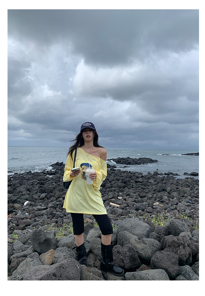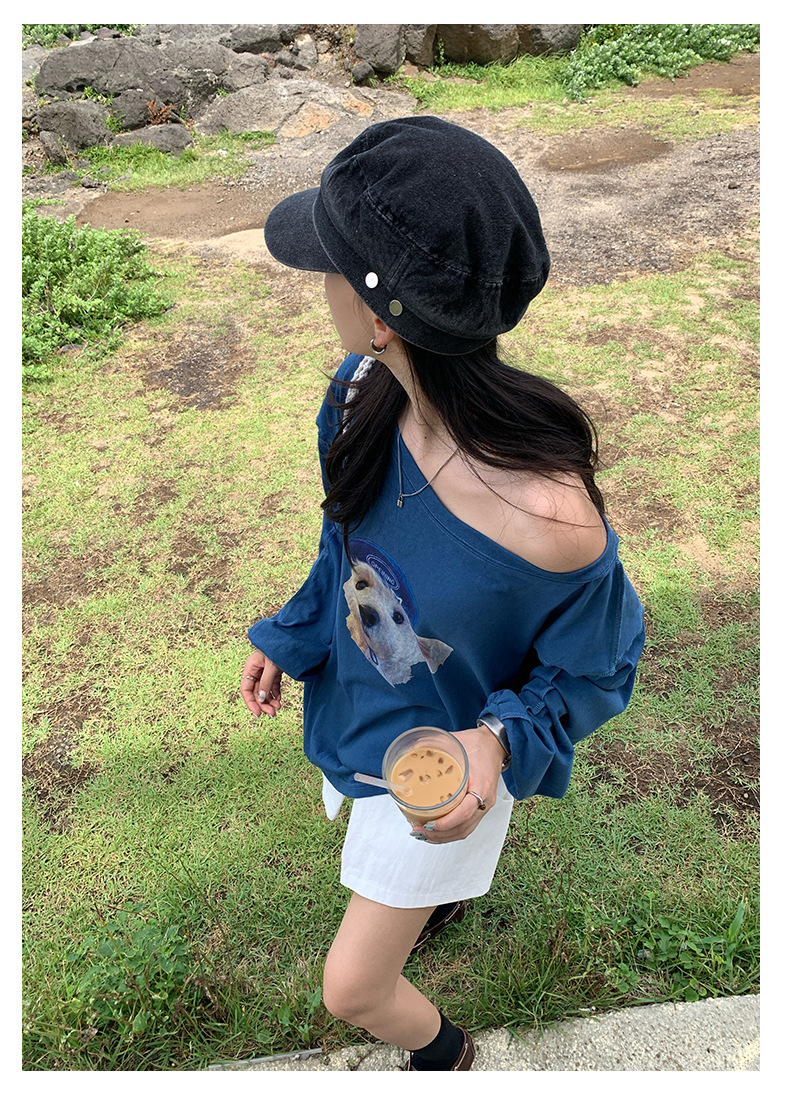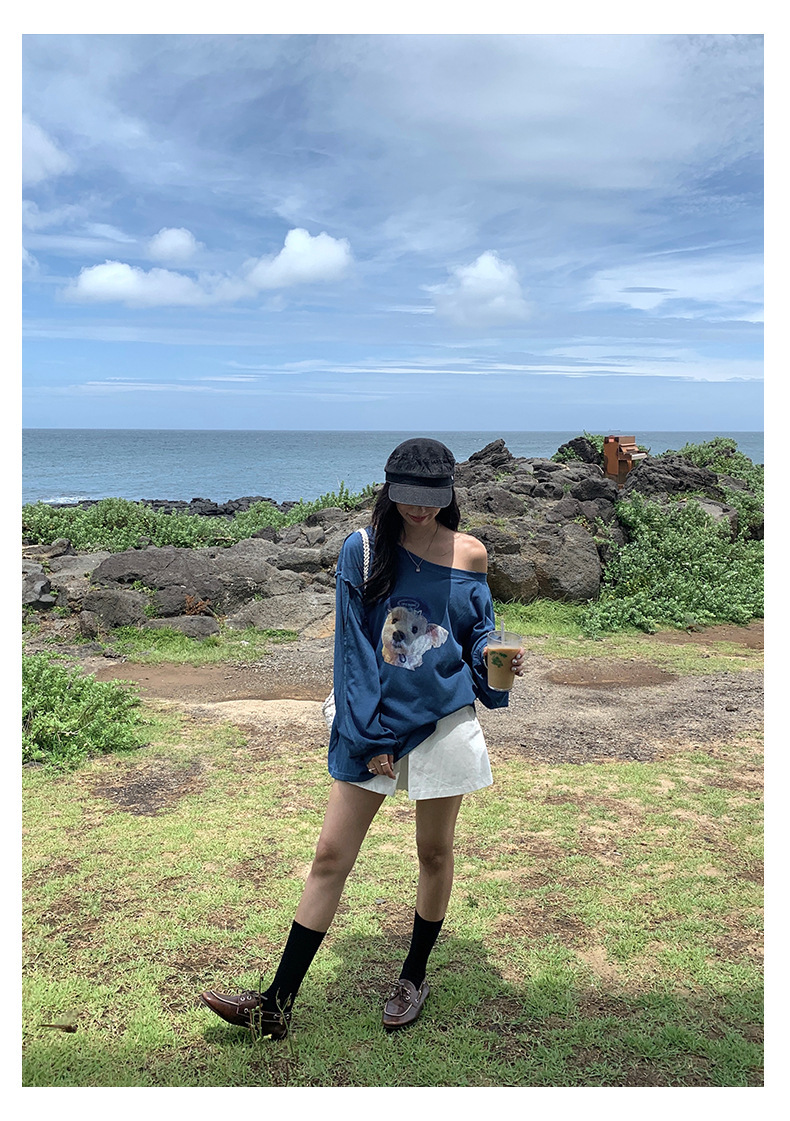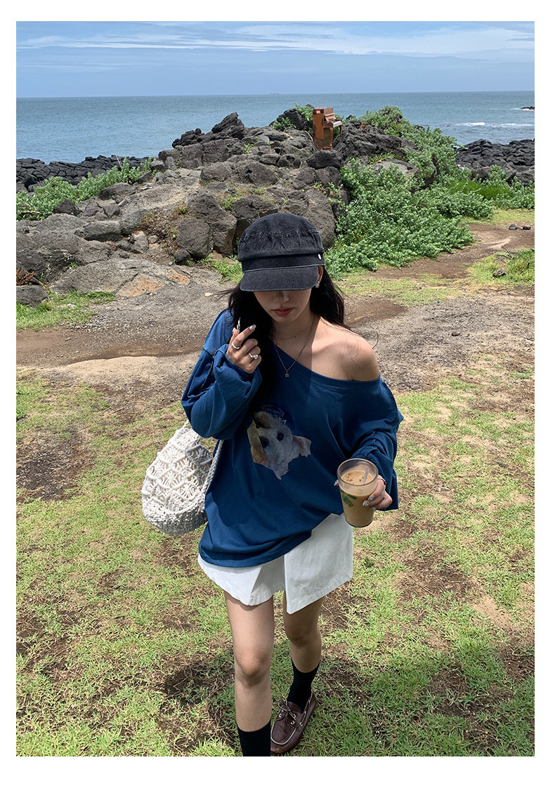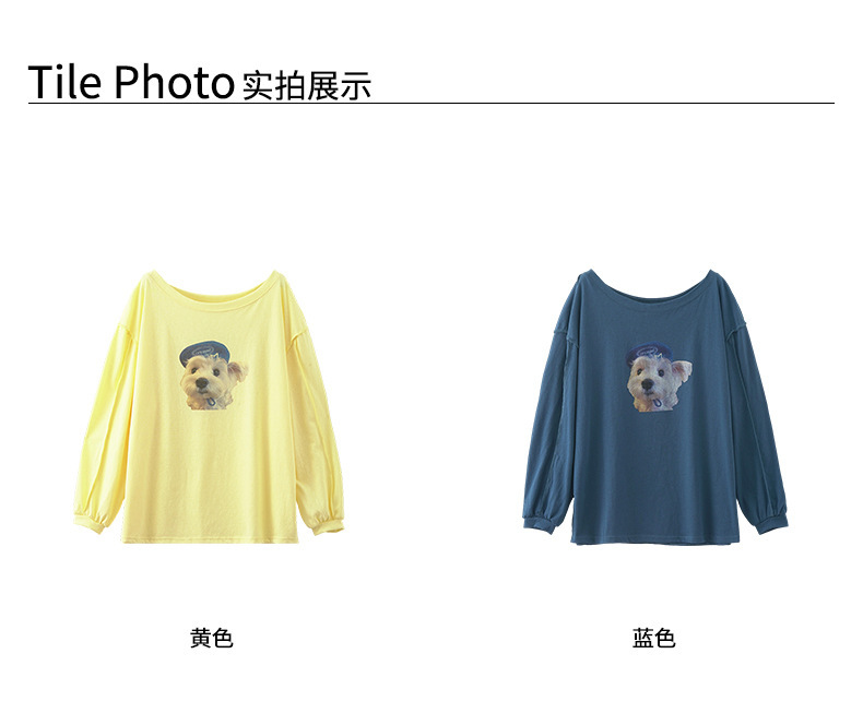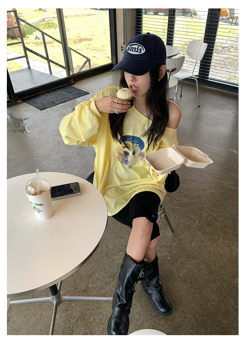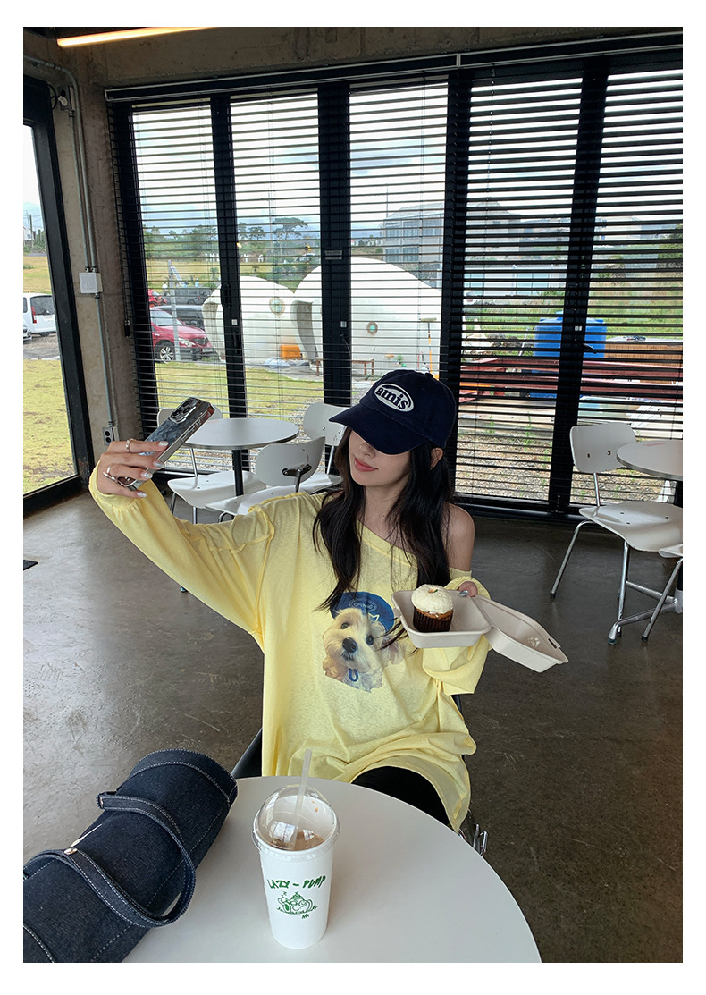 *o-ha-you*【FHZH1DC5030679】韓版秋季美式風寬鬆狗狗印花防曬衫一字肩T恤上衣-2色