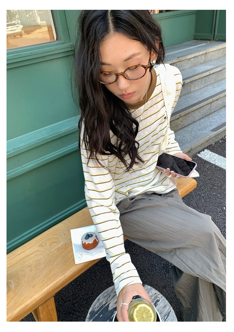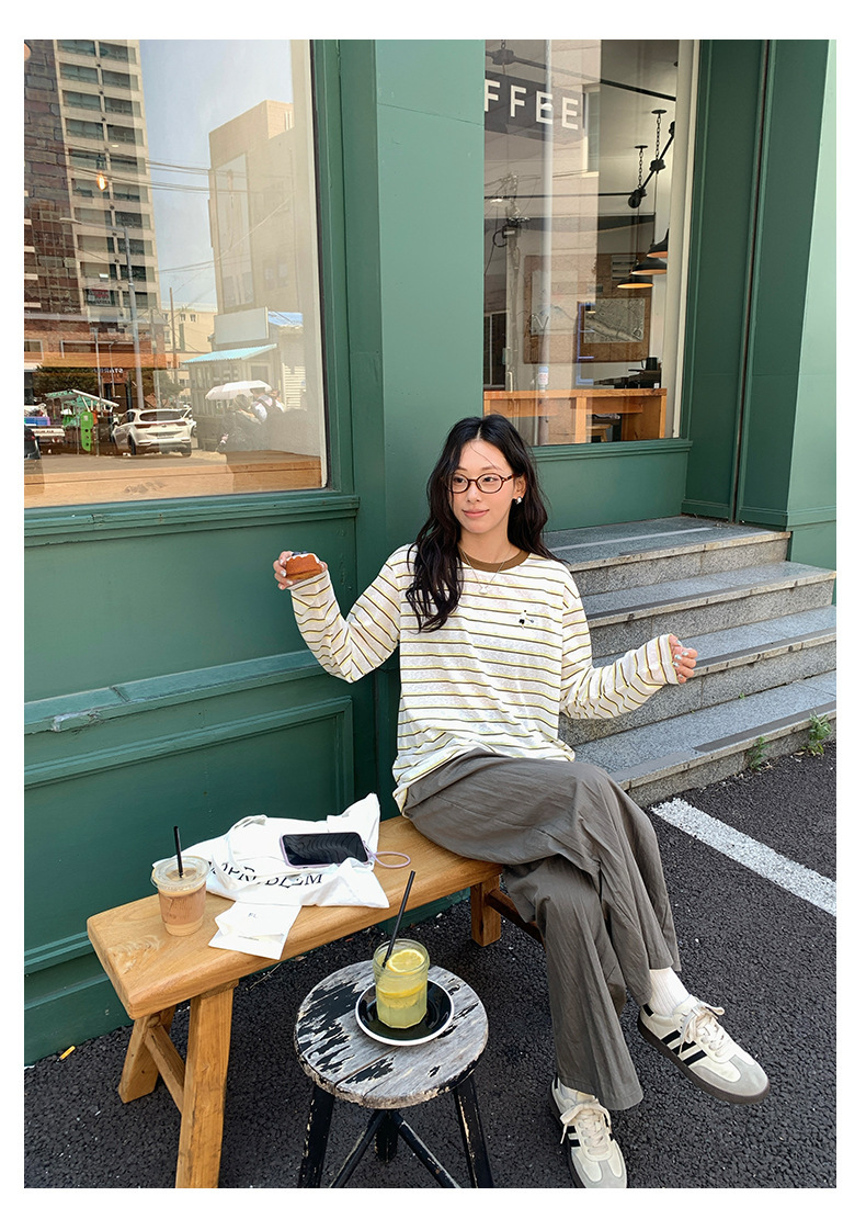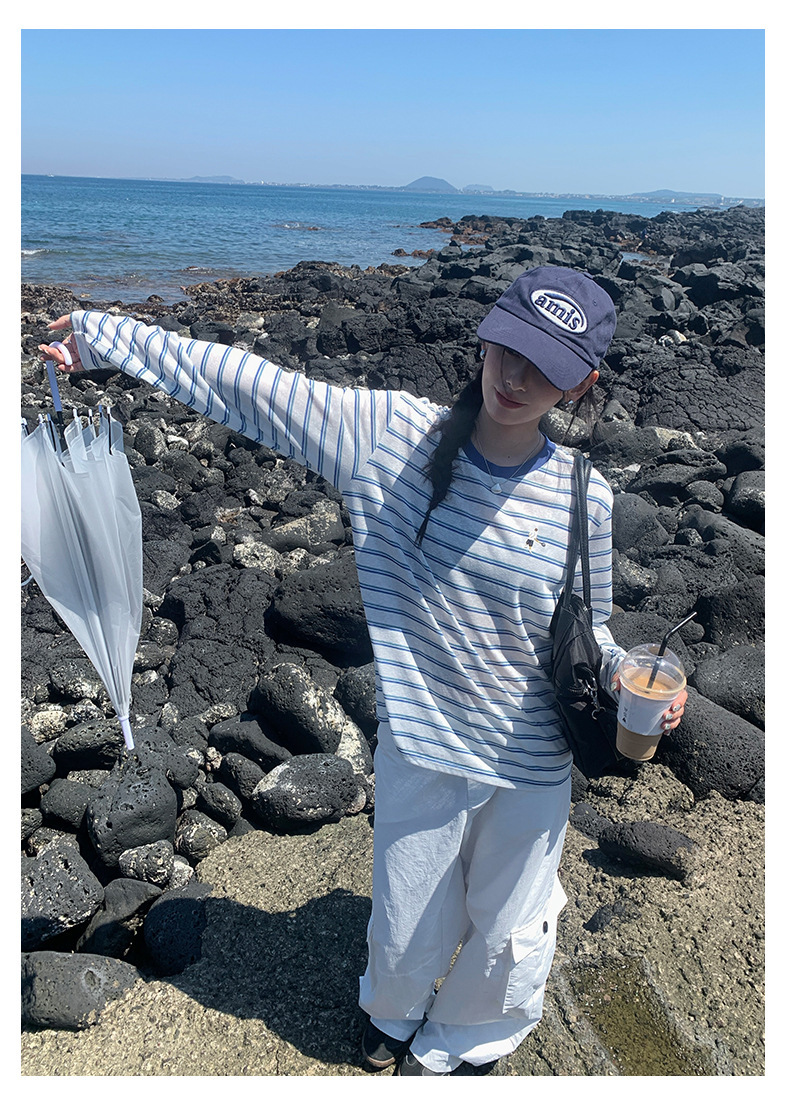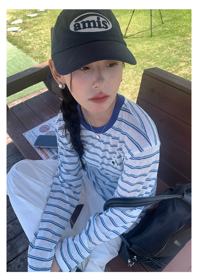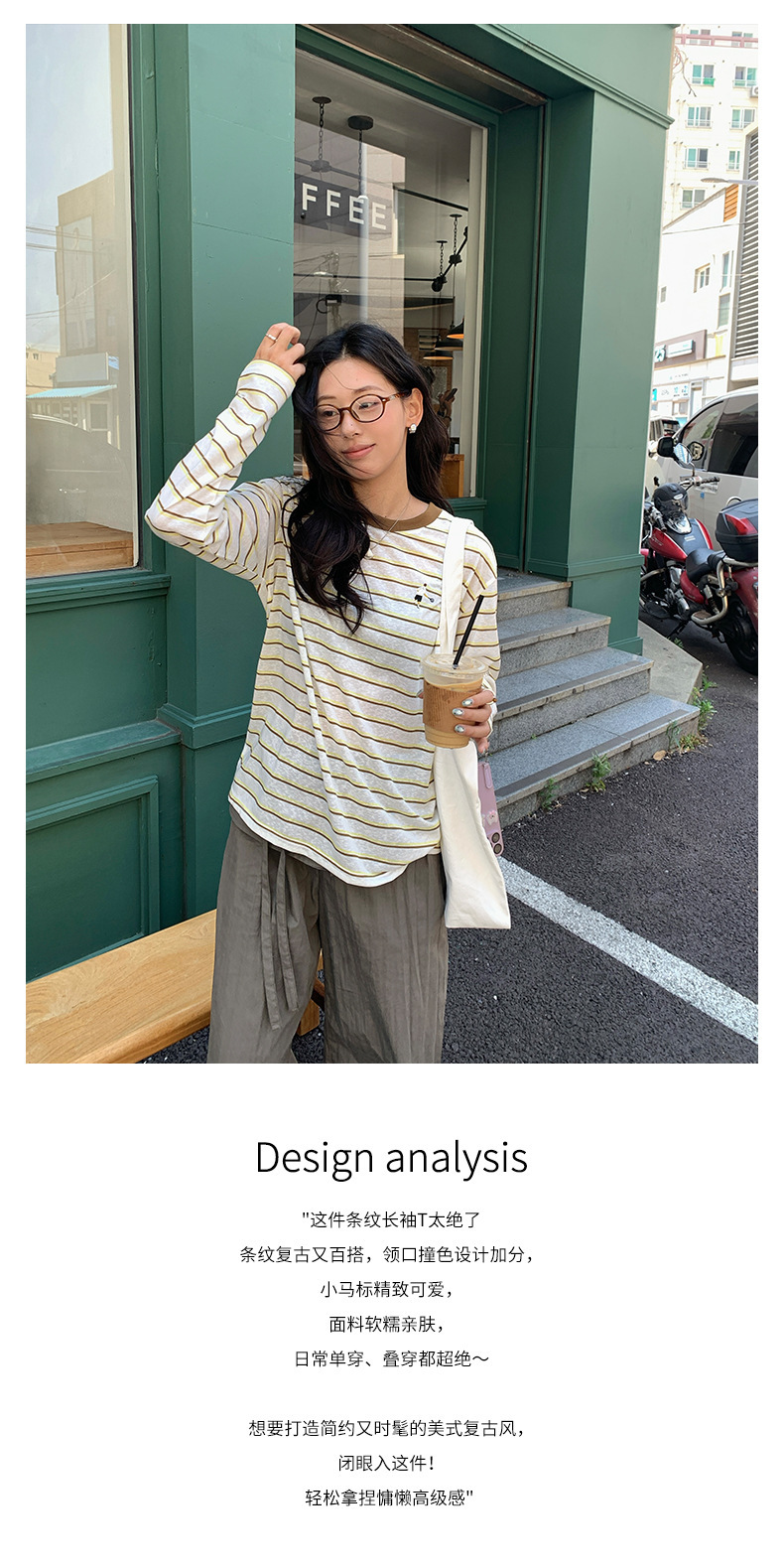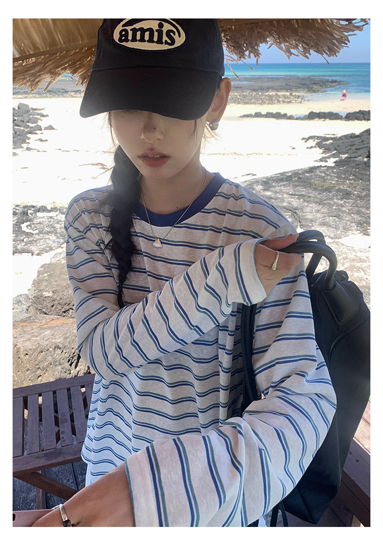 *o-ha-you*【FHZH1DC5030825】韓版秋裝撞色圓領條紋長袖T恤寬鬆薄防曬罩衫上衣-2色