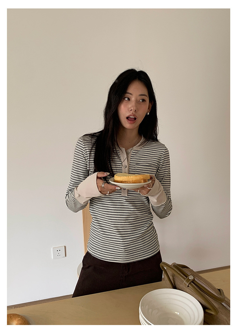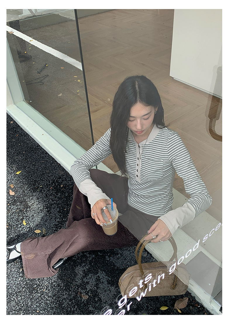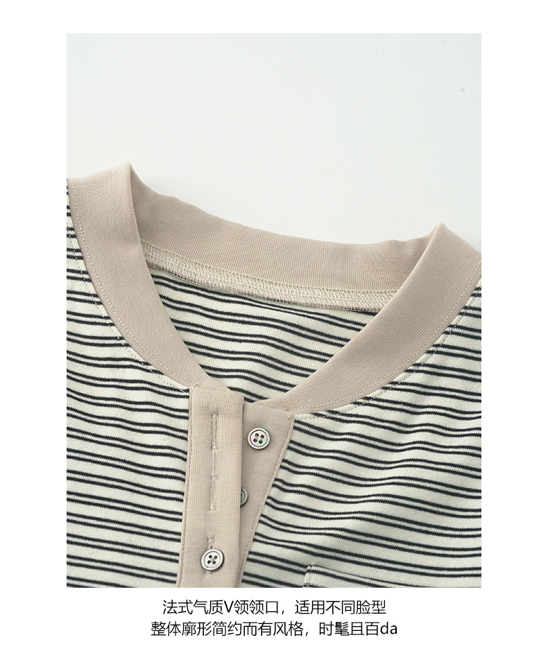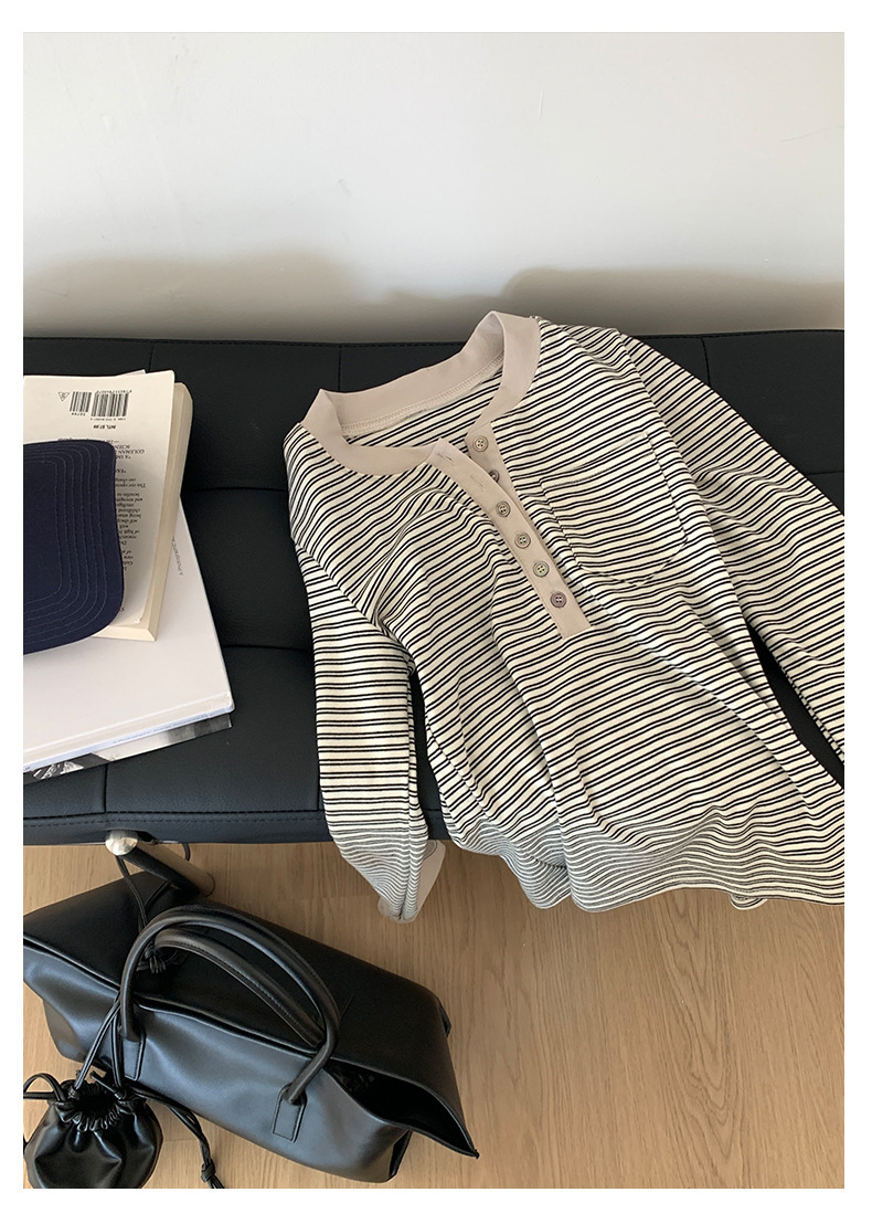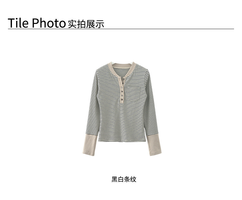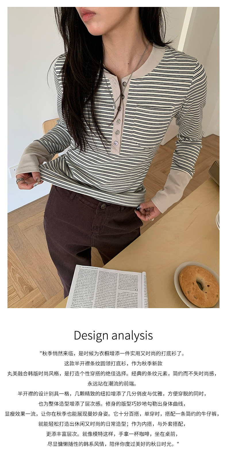 *o-ha-you*【FHZH1DC5030934】半開襟條紋圓領打底衫秋季新款韓版修身顯瘦長袖T恤