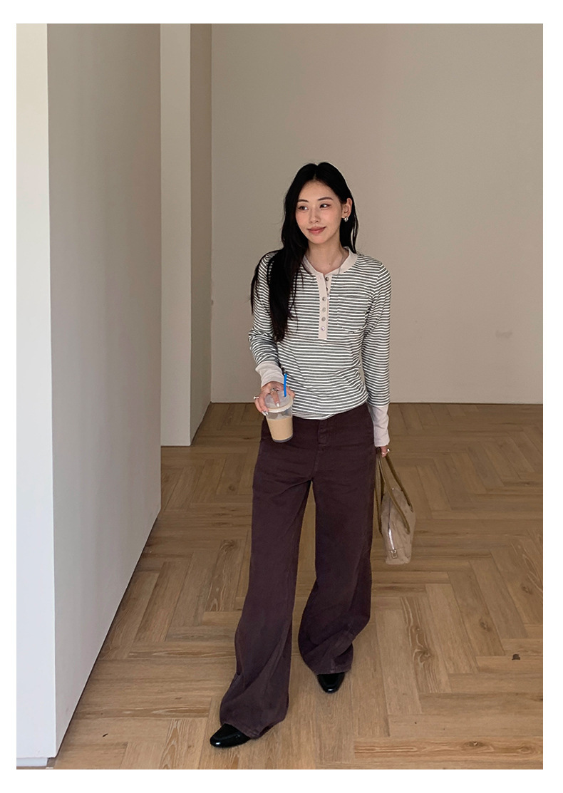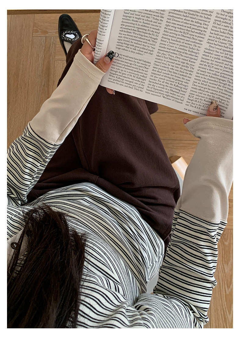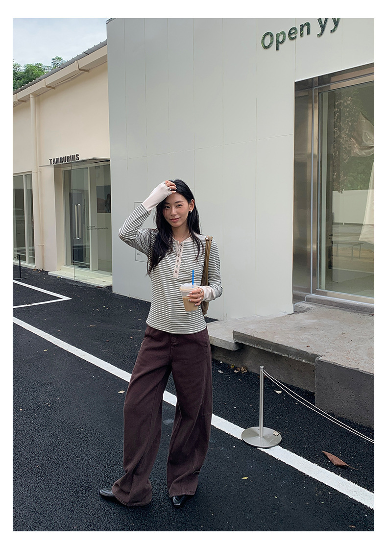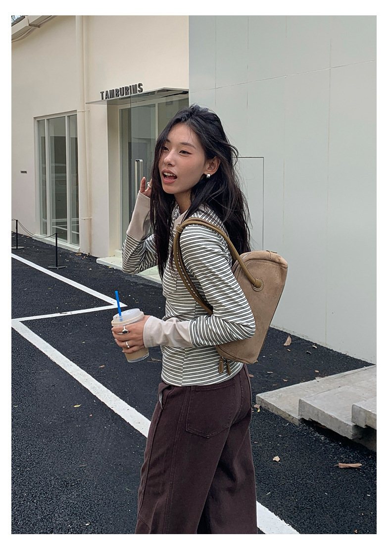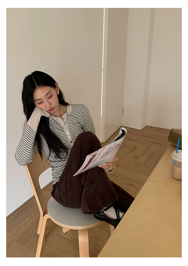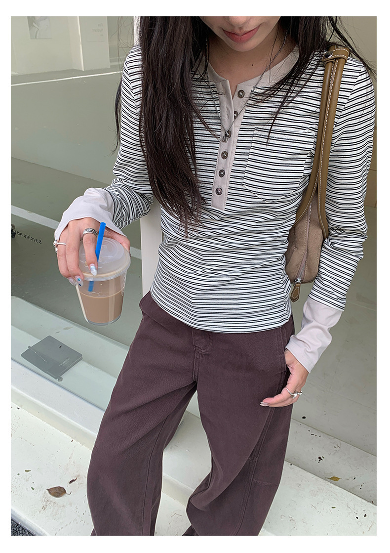 *o-ha-you*【FHZH1DC5030934】半開襟條紋圓領打底衫秋季新款韓版修身顯瘦長袖T恤