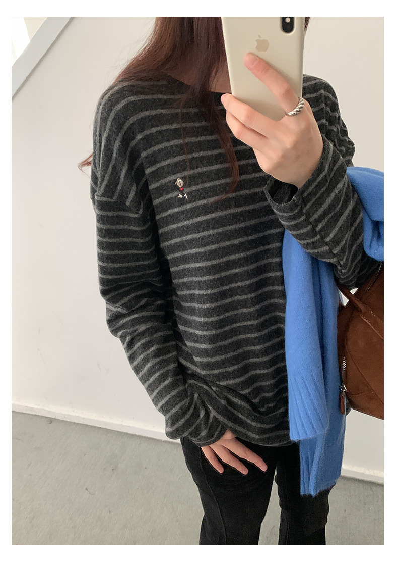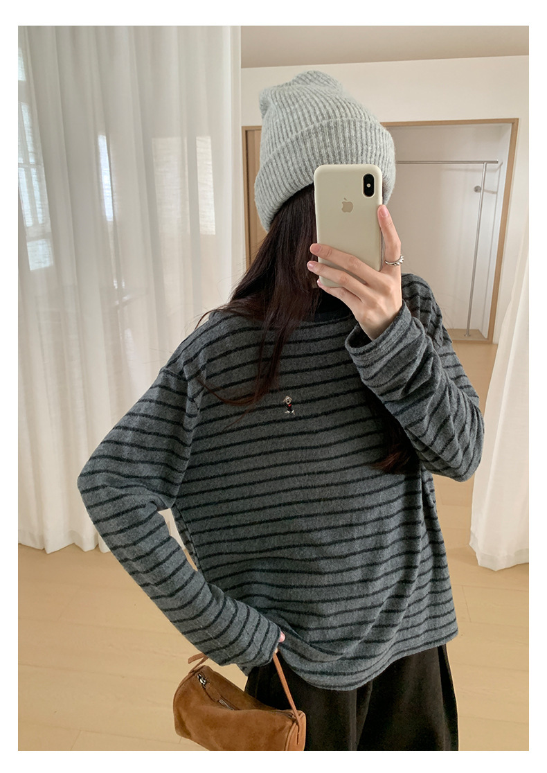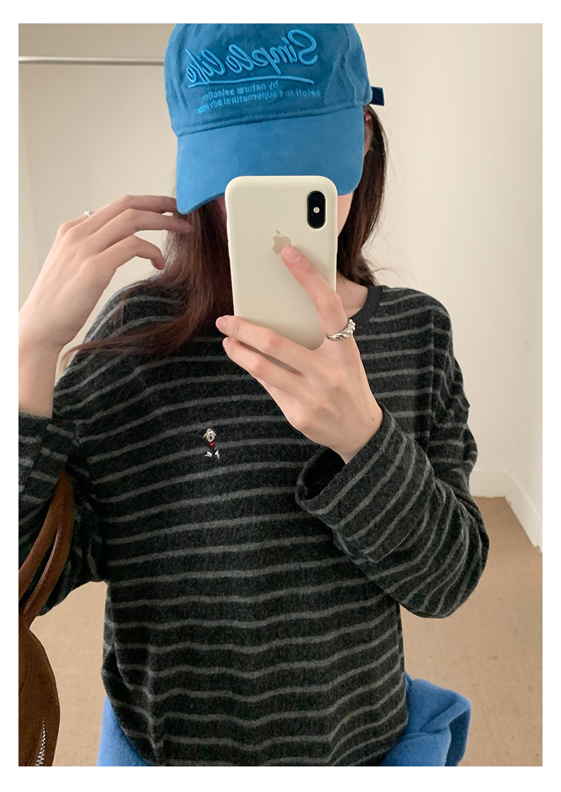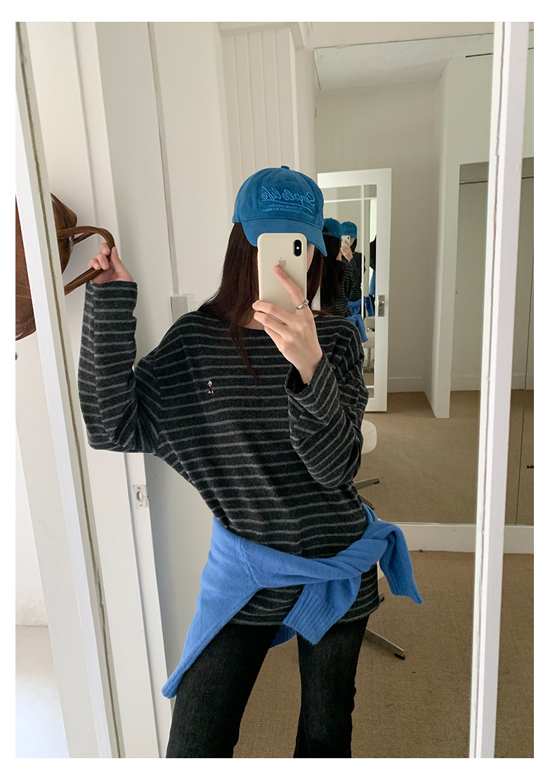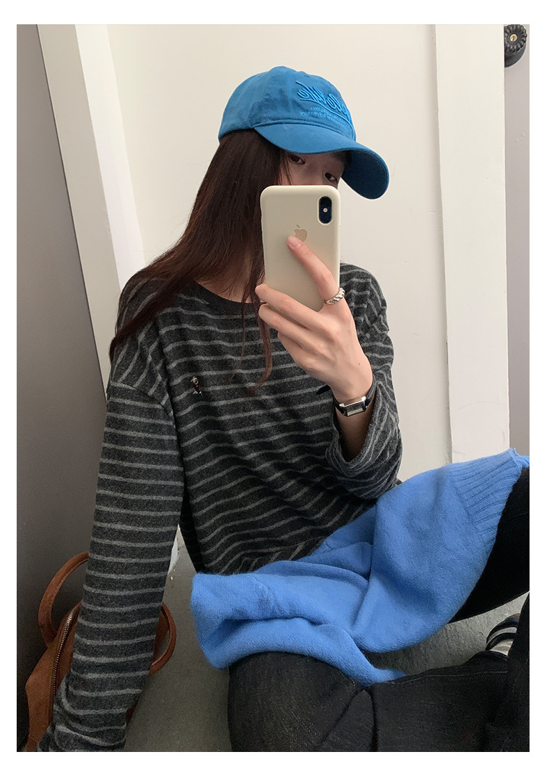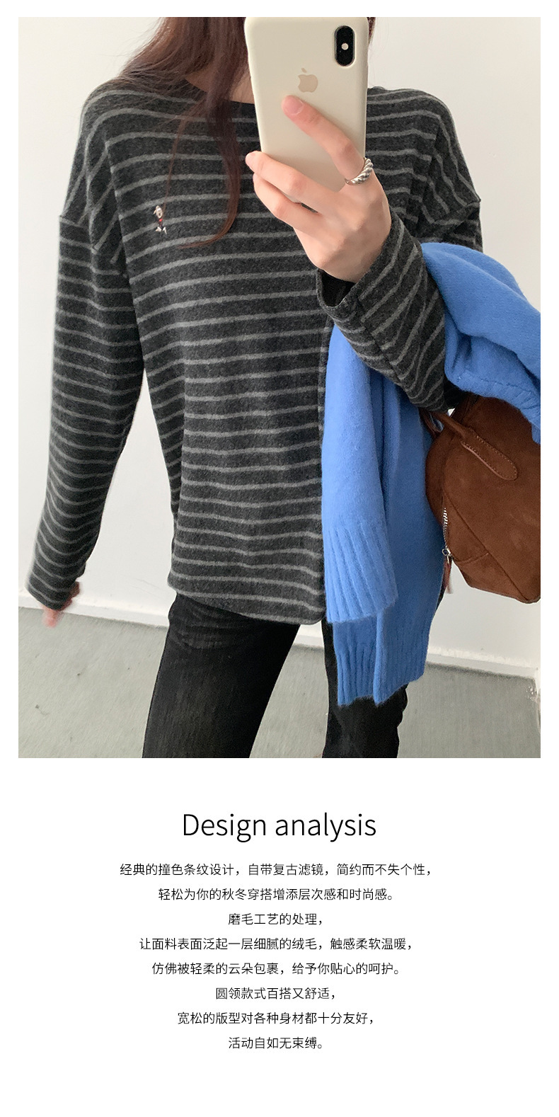 *o-ha-you*【FHZH1DC5041034】復古磨毛刺繡撞色條紋圓領T恤秋冬寬鬆休閒長袖上衣-2色