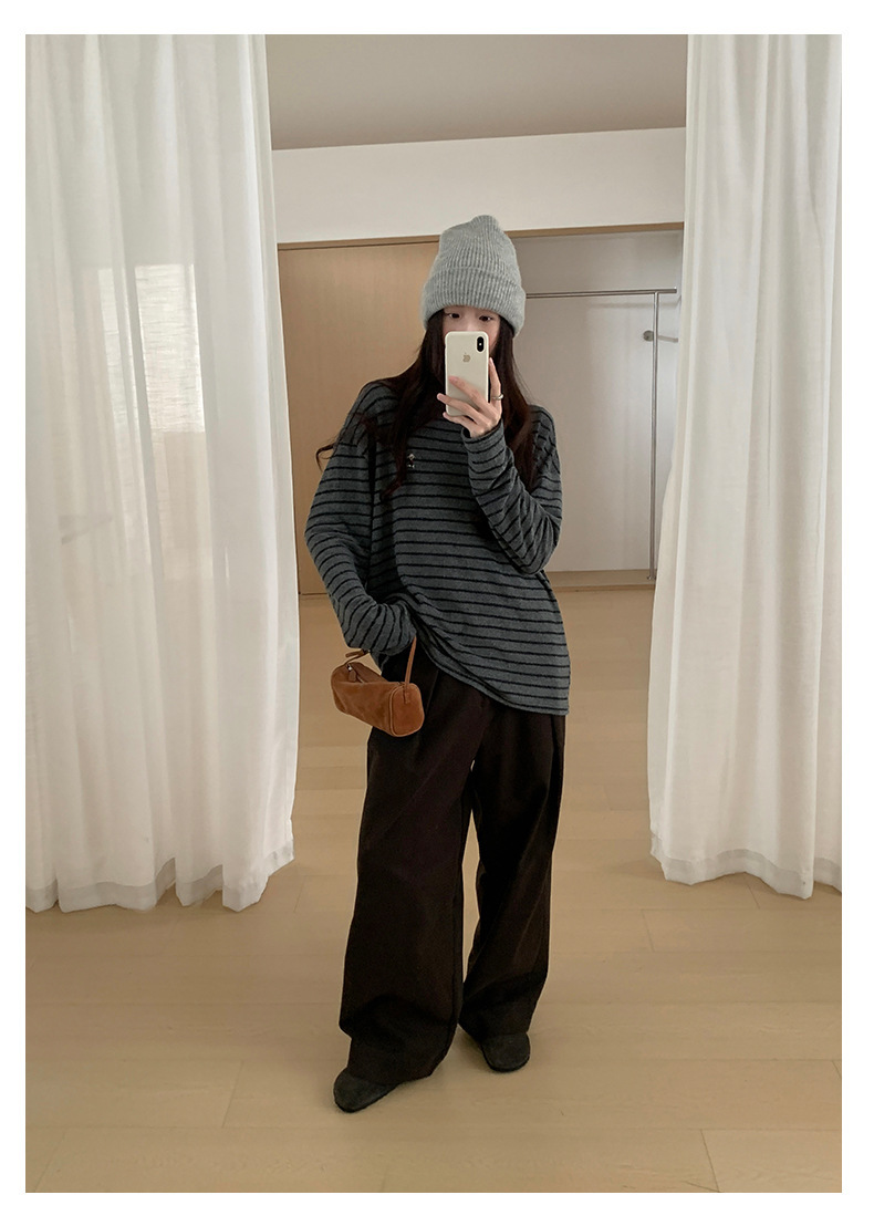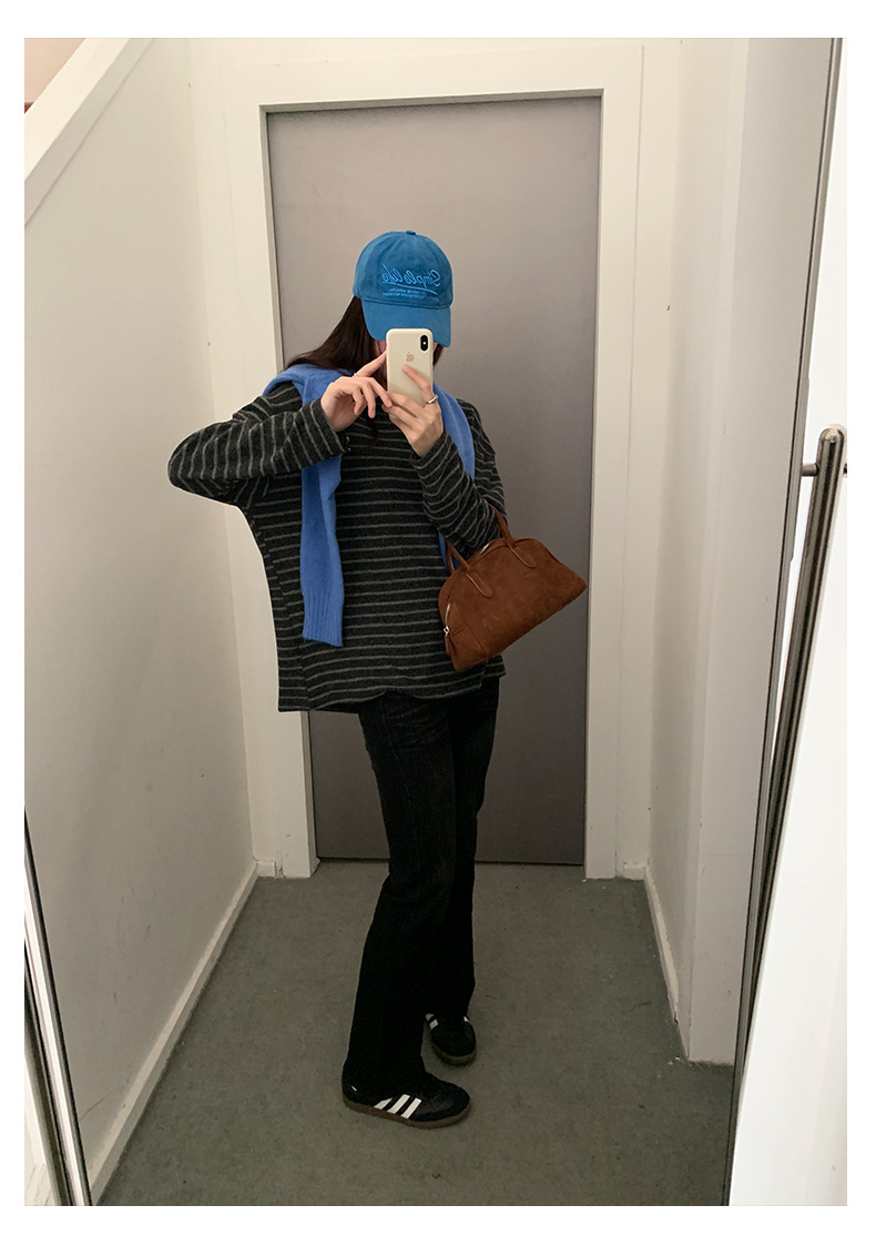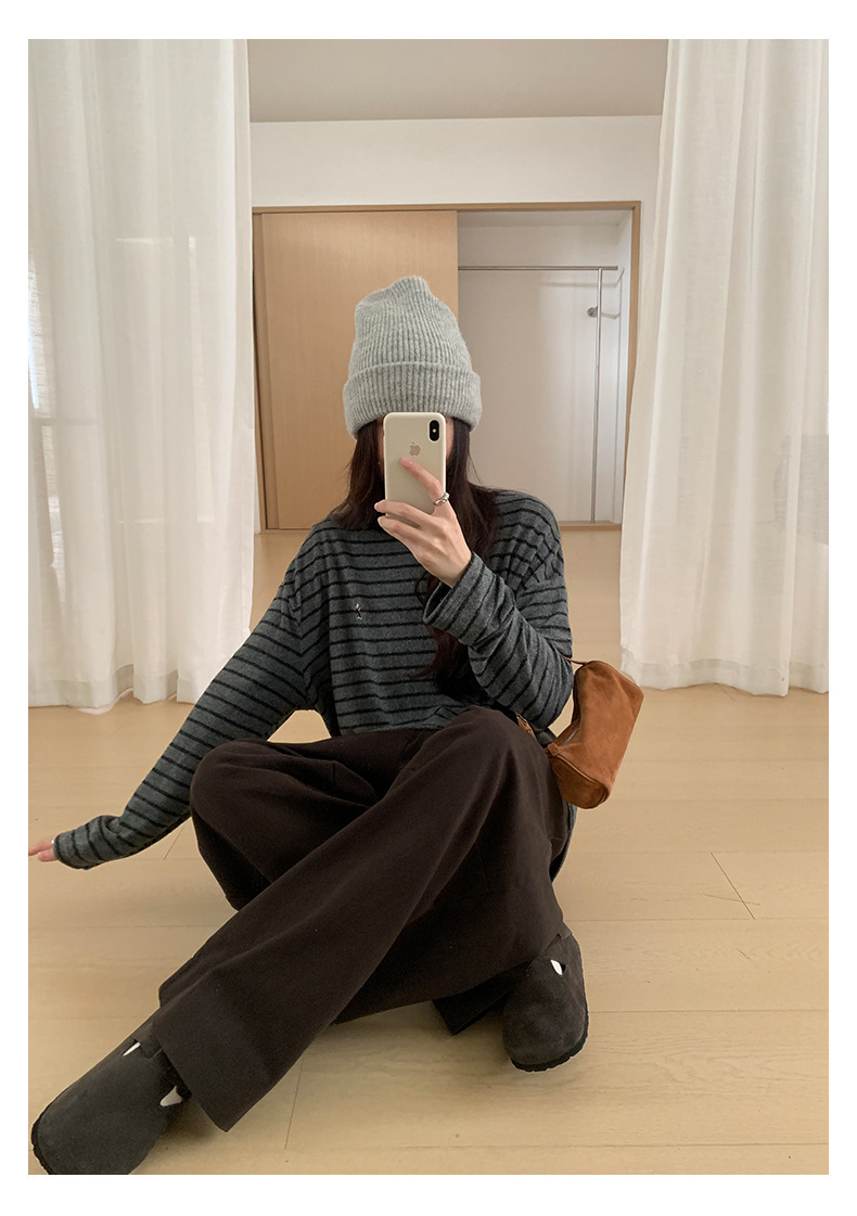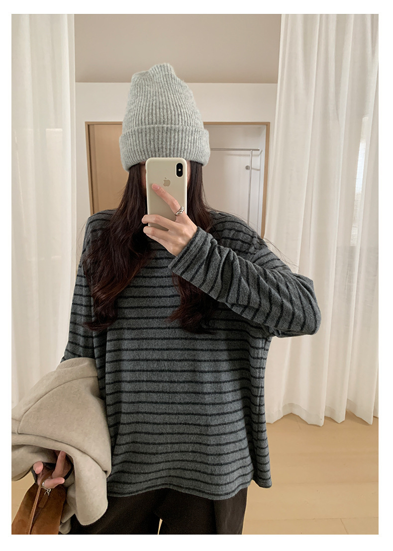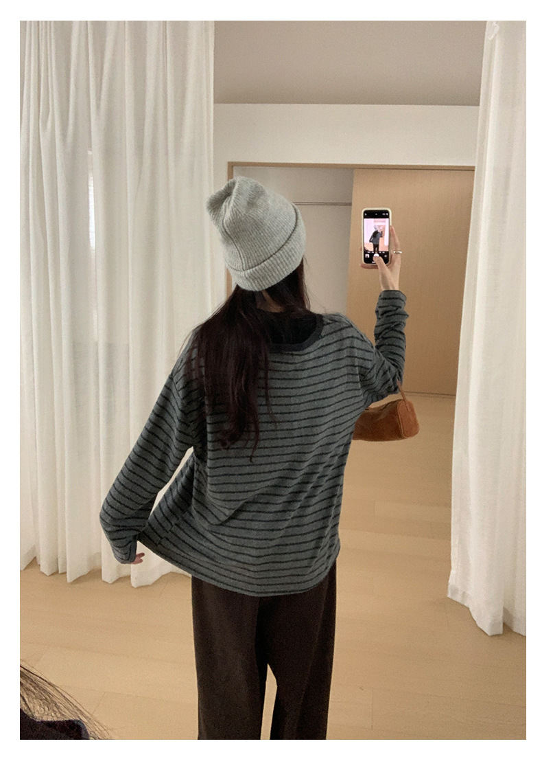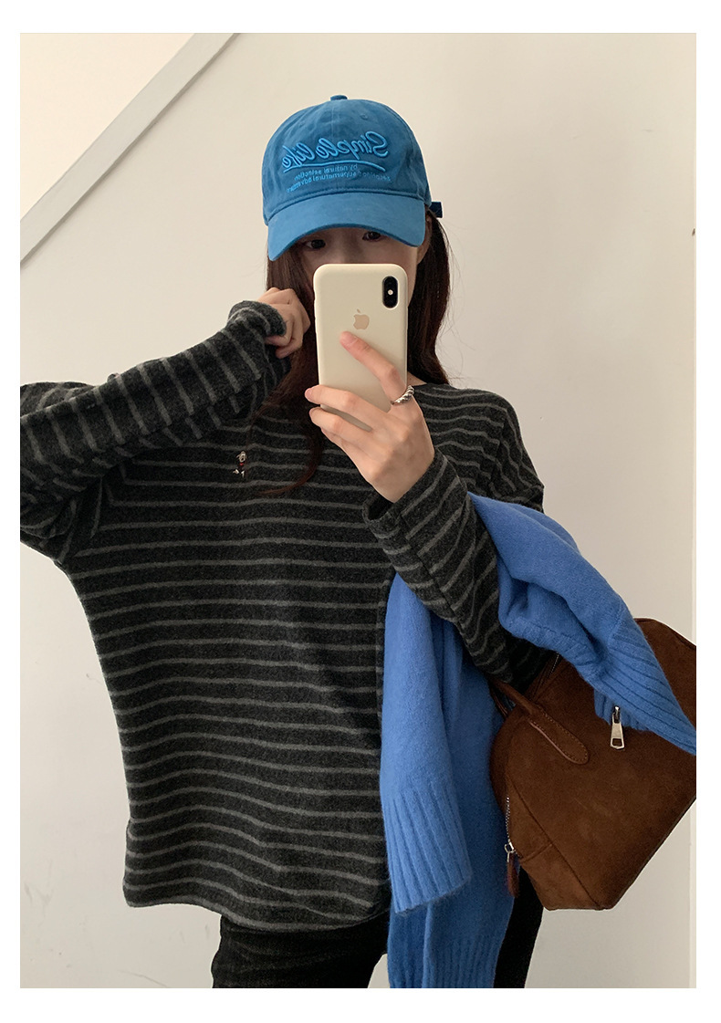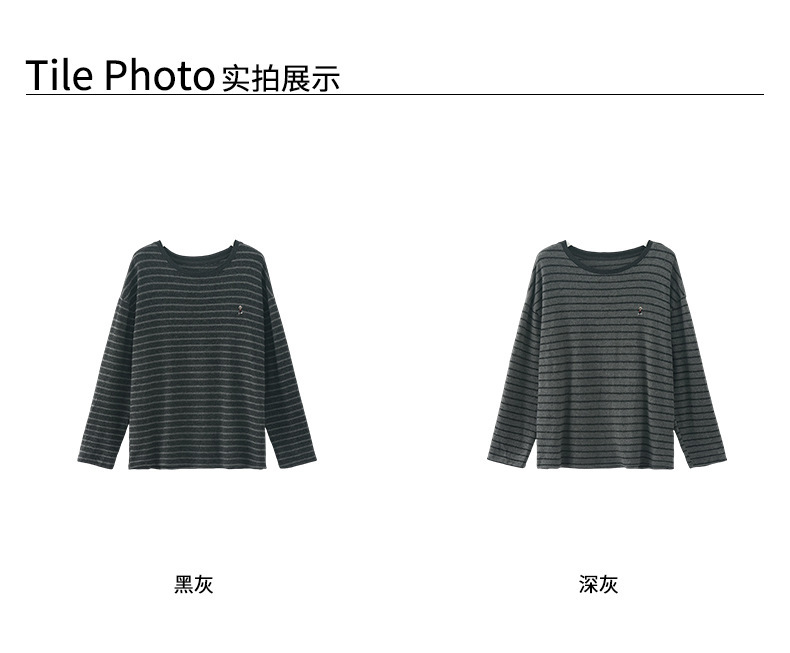 *o-ha-you*【FHZH1DC5041034】復古磨毛刺繡撞色條紋圓領T恤秋冬寬鬆休閒長袖上衣-2色