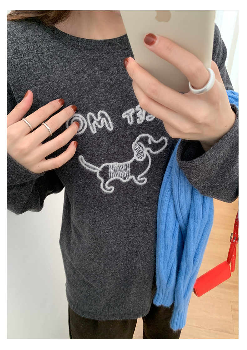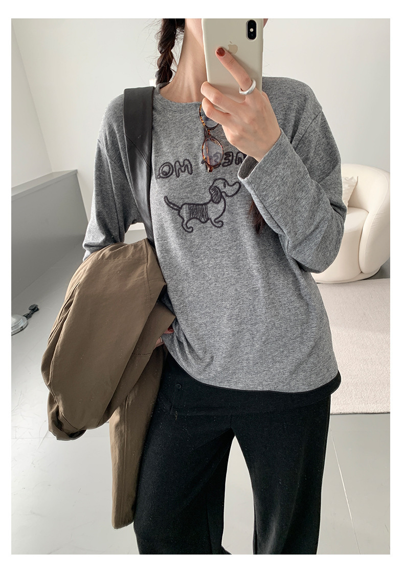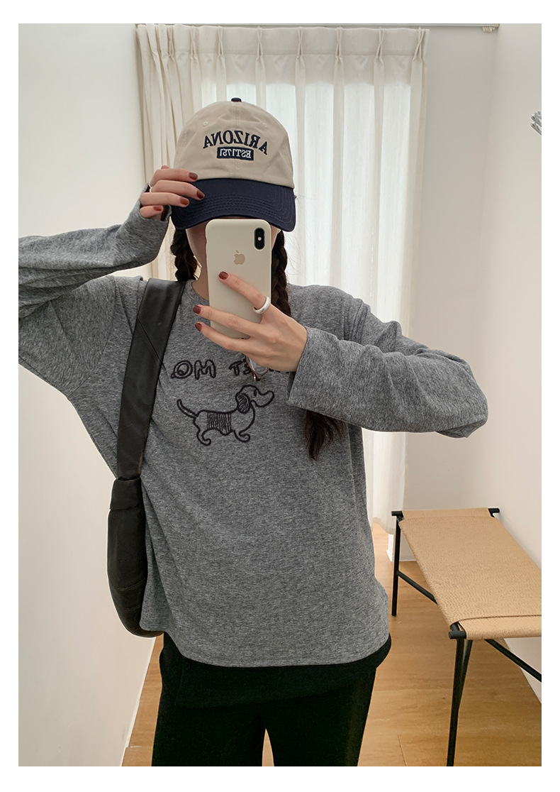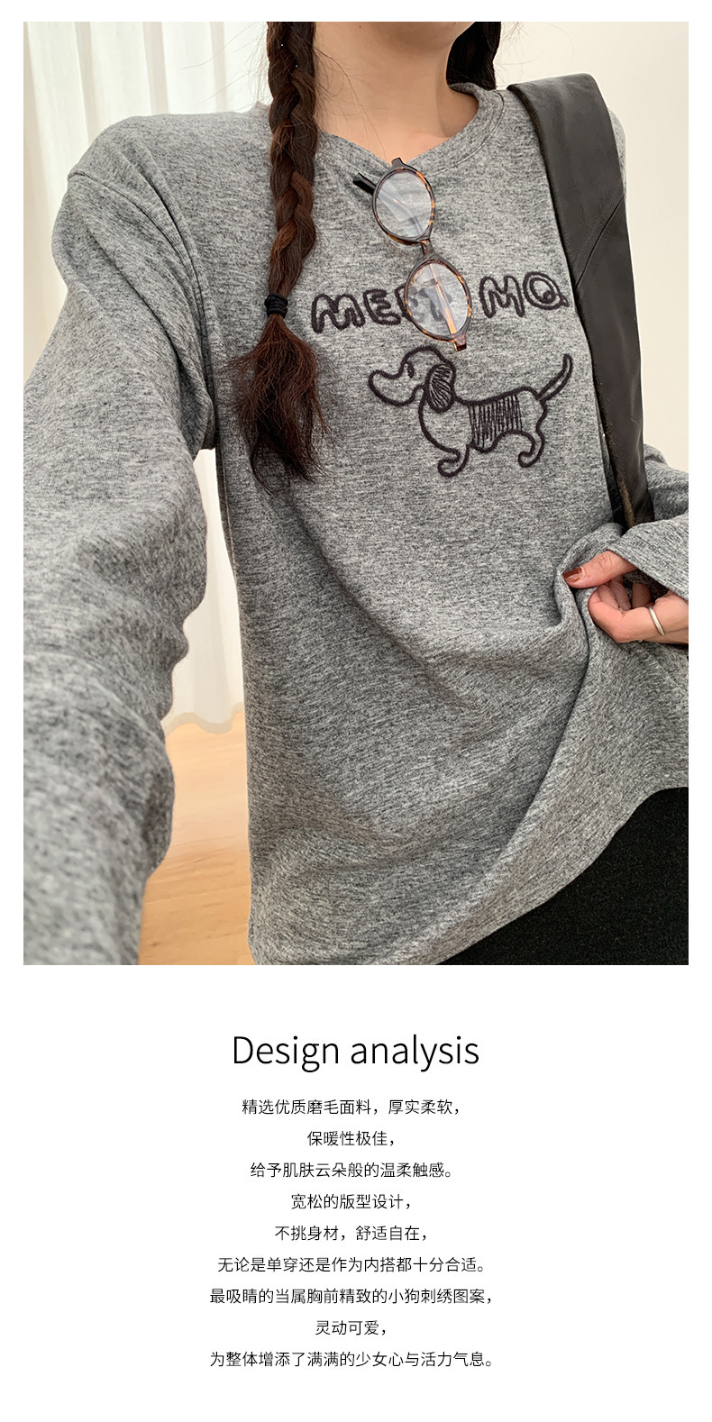 *o-ha-you*【FHZH1DC5041081】可愛小狗刺繡加厚磨毛長袖T恤女秋冬寬鬆套頭內搭上衣-2色