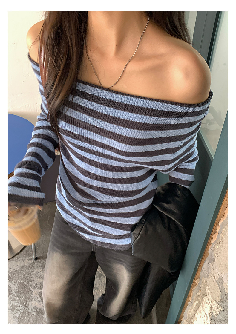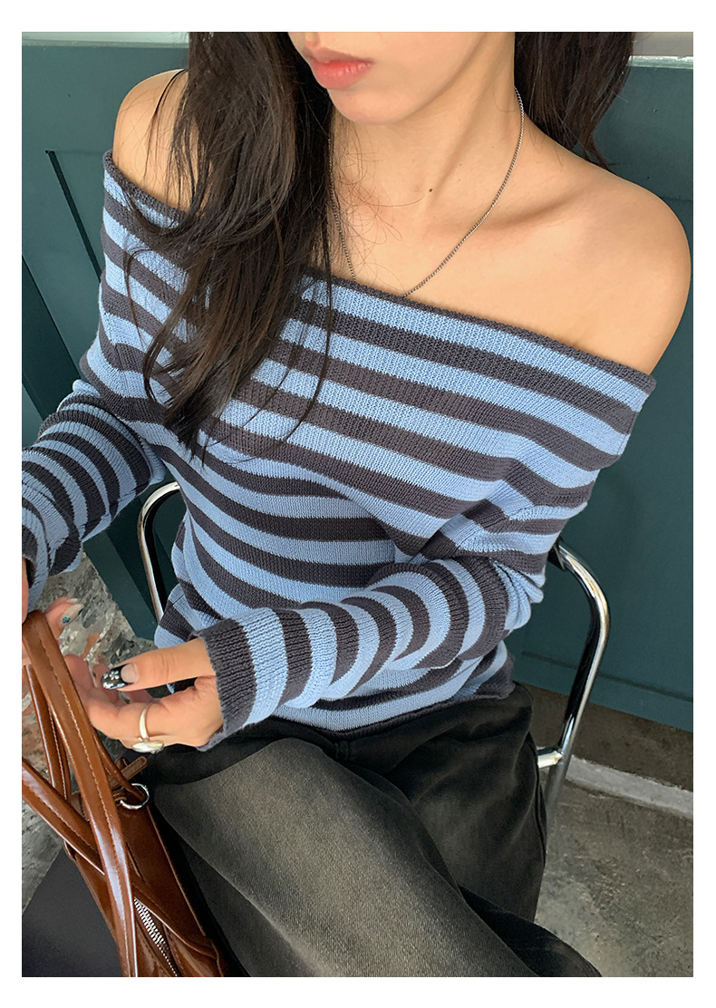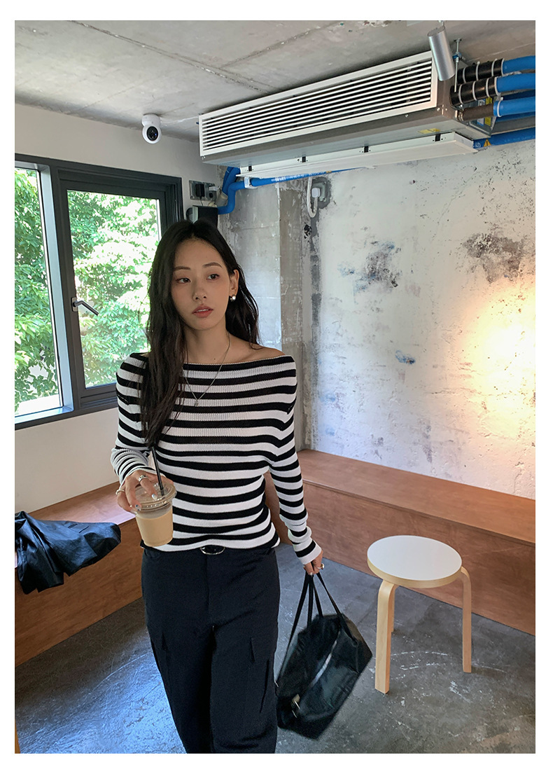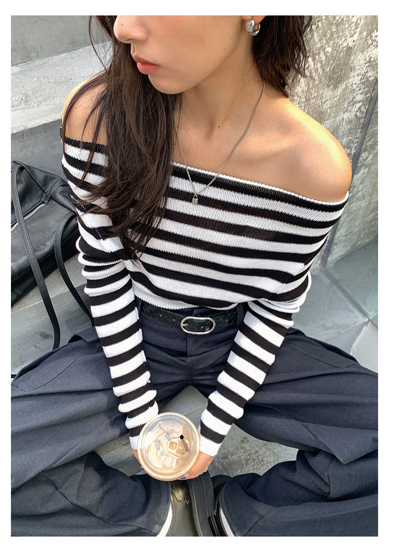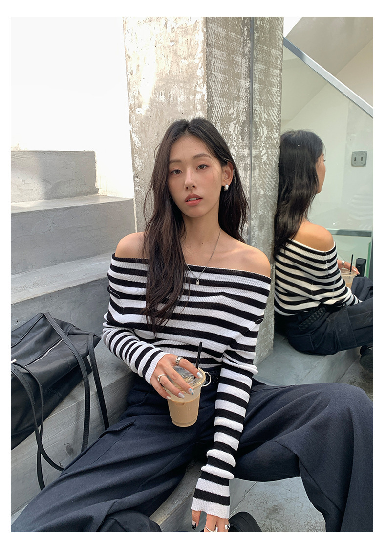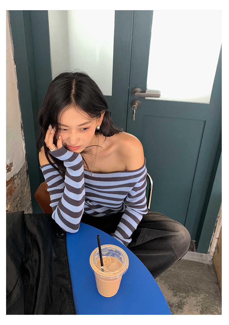 *o-ha-you*【FHZH1EE5030063】韓系簡約氣質撞色條紋一字領露肩修身針織休閒上衣-2色