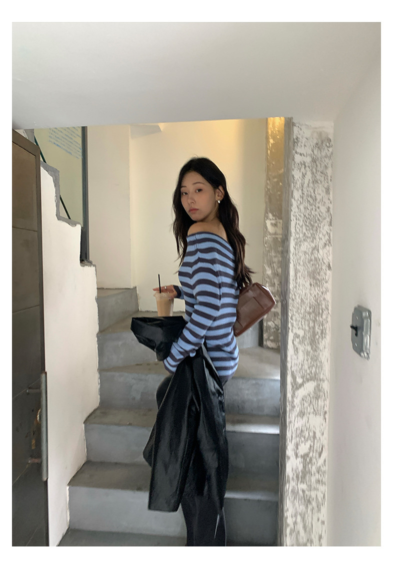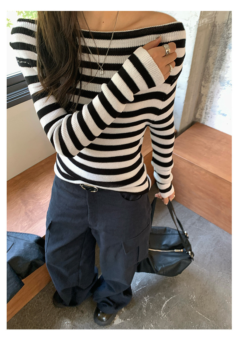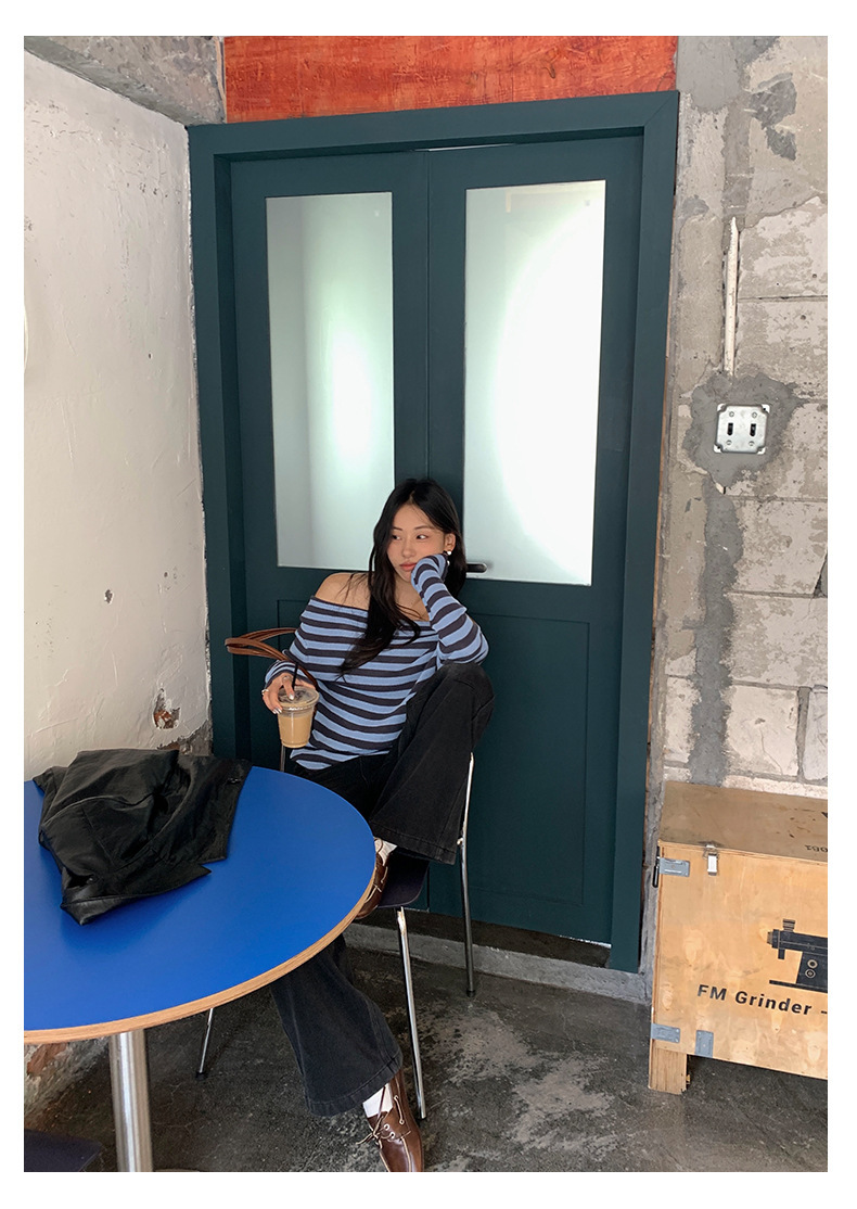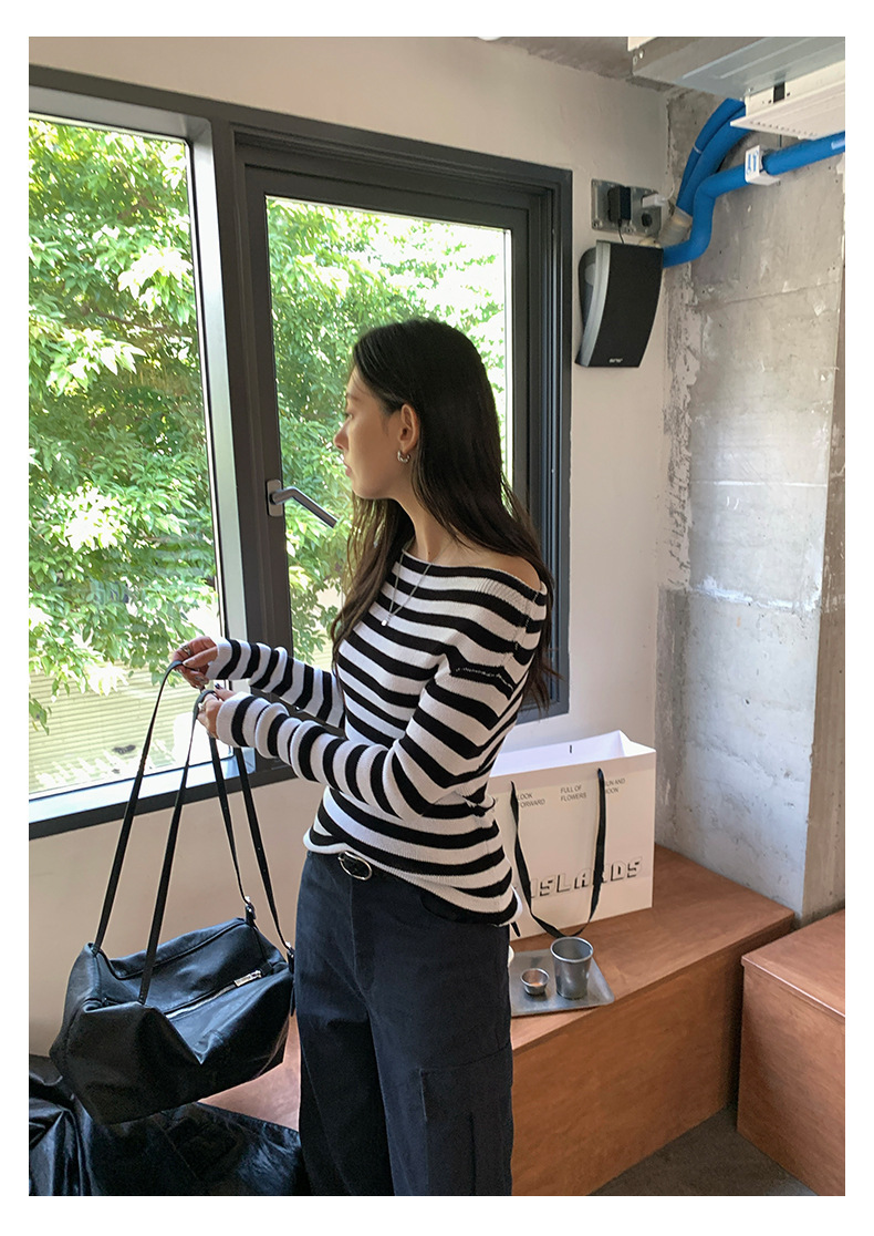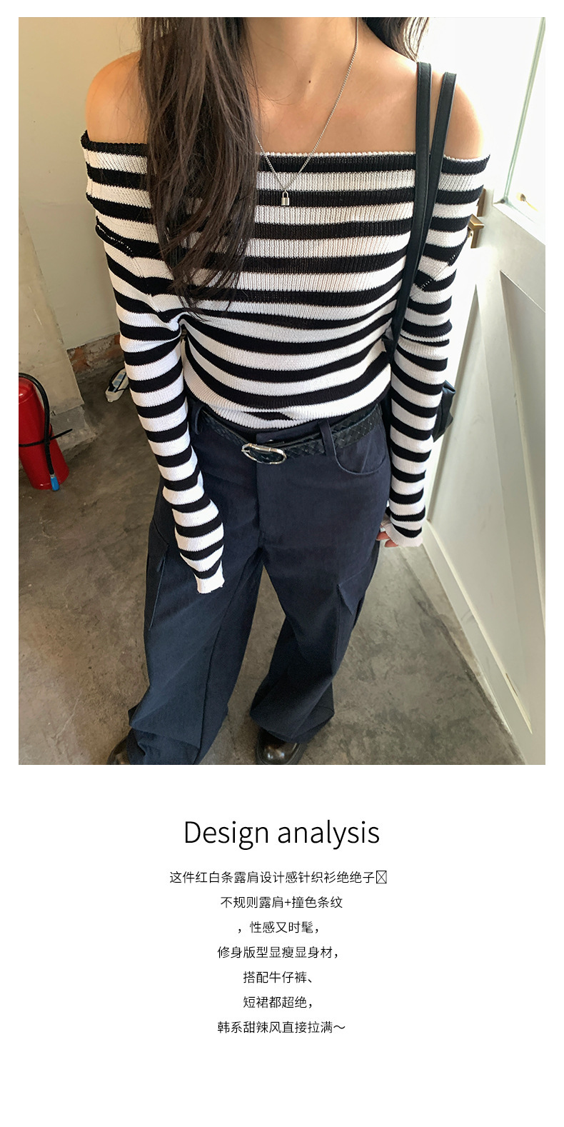 *o-ha-you*【FHZH1EE5030063】韓系簡約氣質撞色條紋一字領露肩修身針織休閒上衣-2色