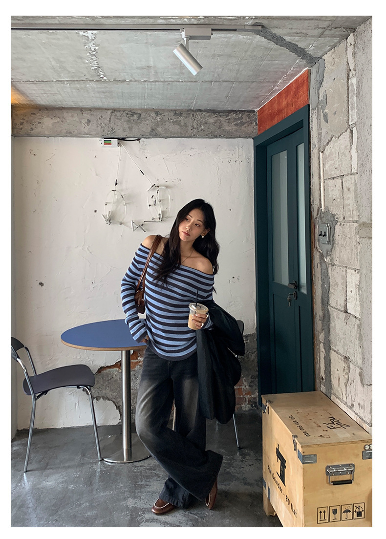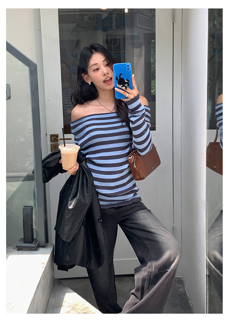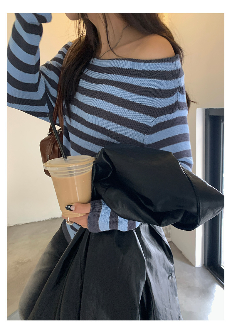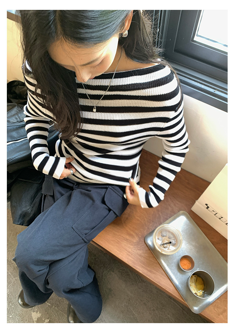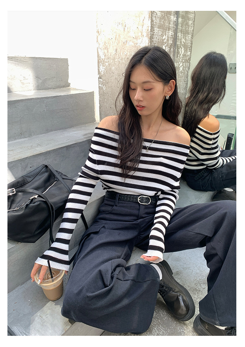 *o-ha-you*【FHZH1EE5030063】韓系簡約氣質撞色條紋一字領露肩修身針織休閒上衣-2色