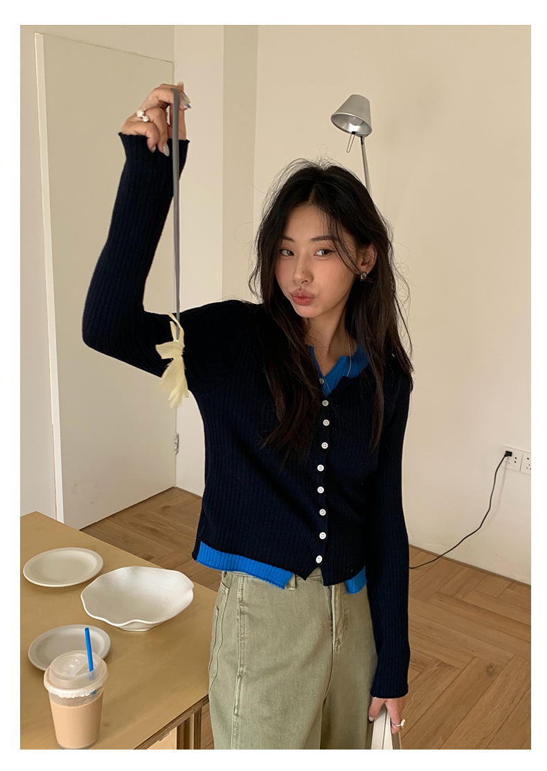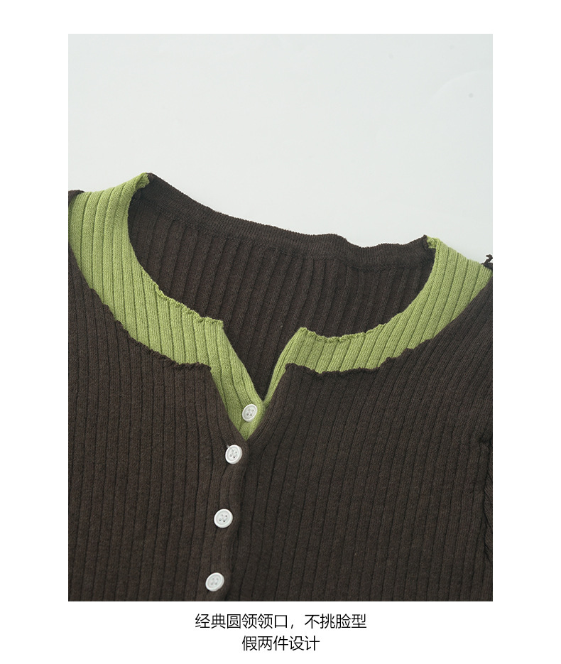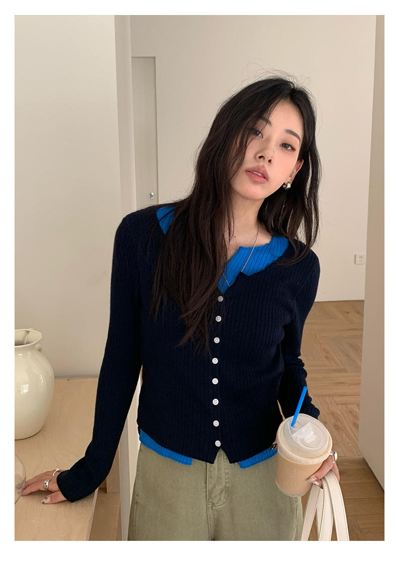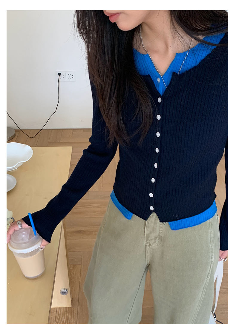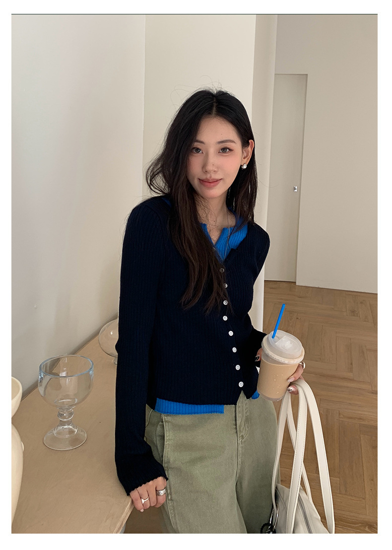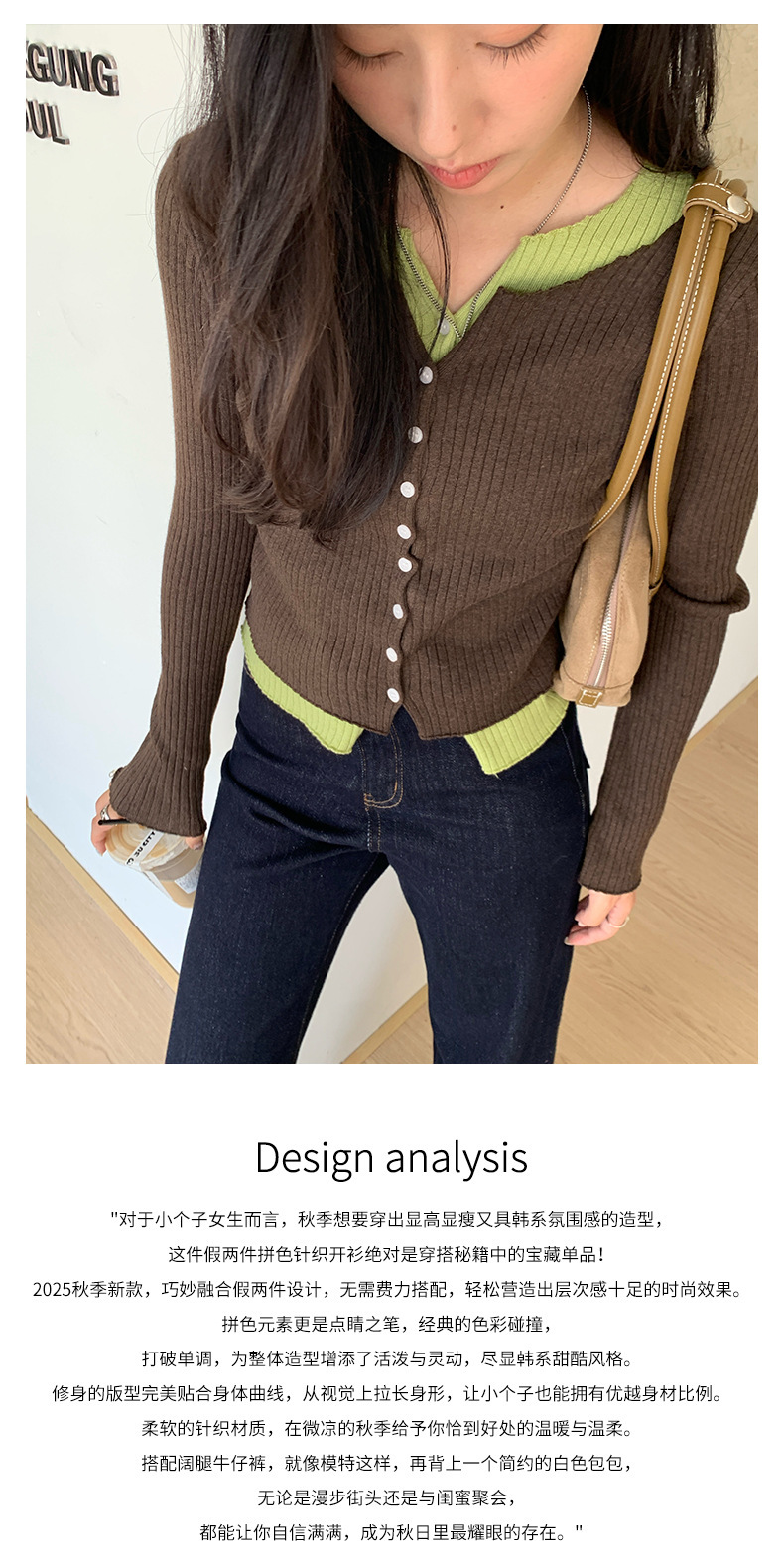 *o-ha-you*【FHZH1EE5030074】小個子假兩件拼色針織開襟衫2025秋季韓系修身顯瘦毛衣-2色