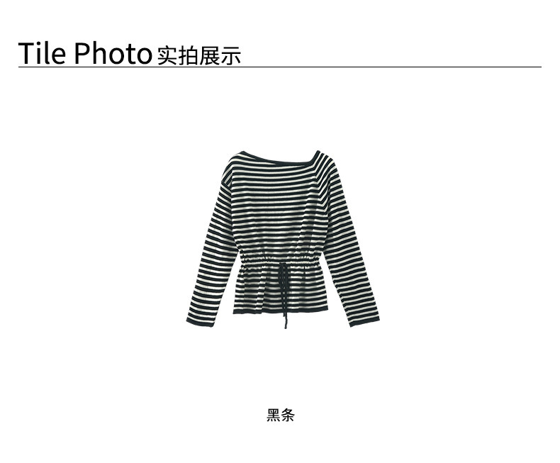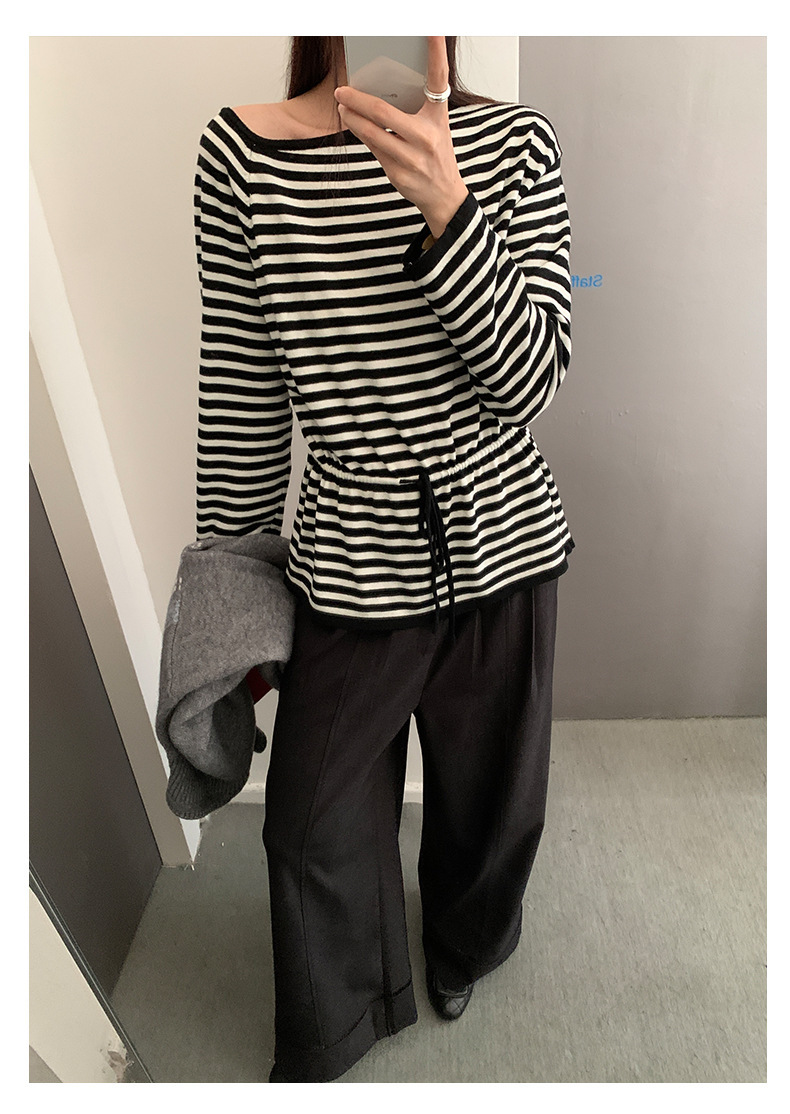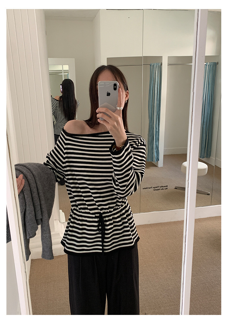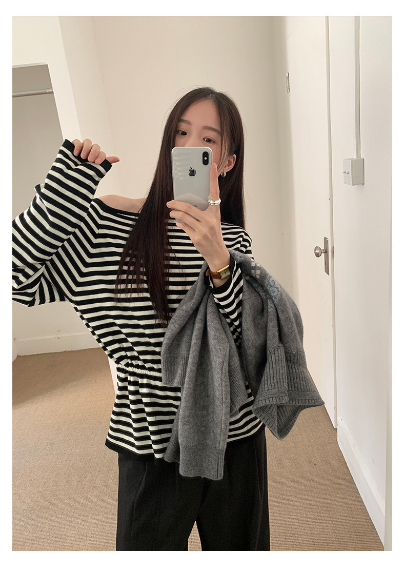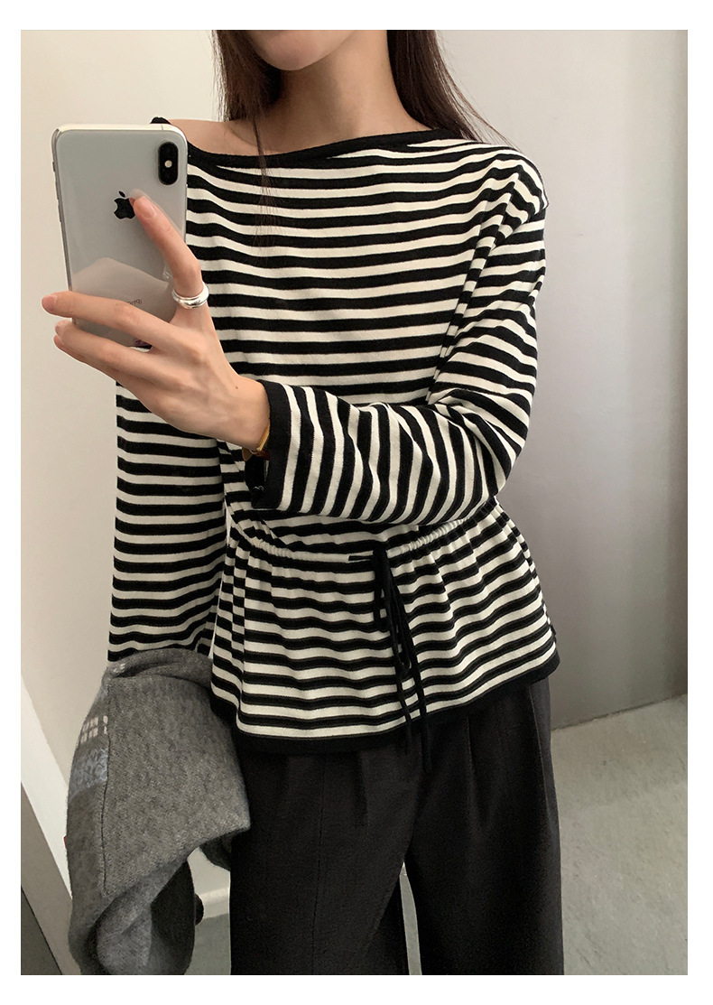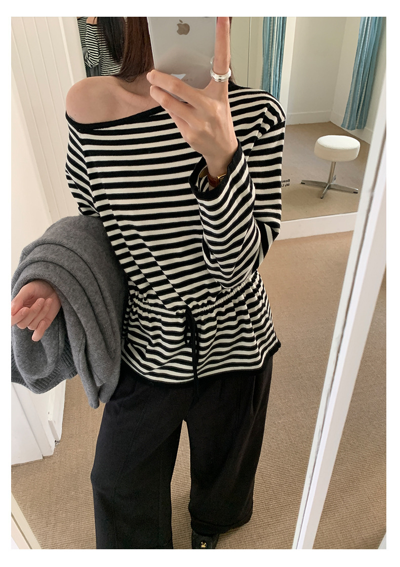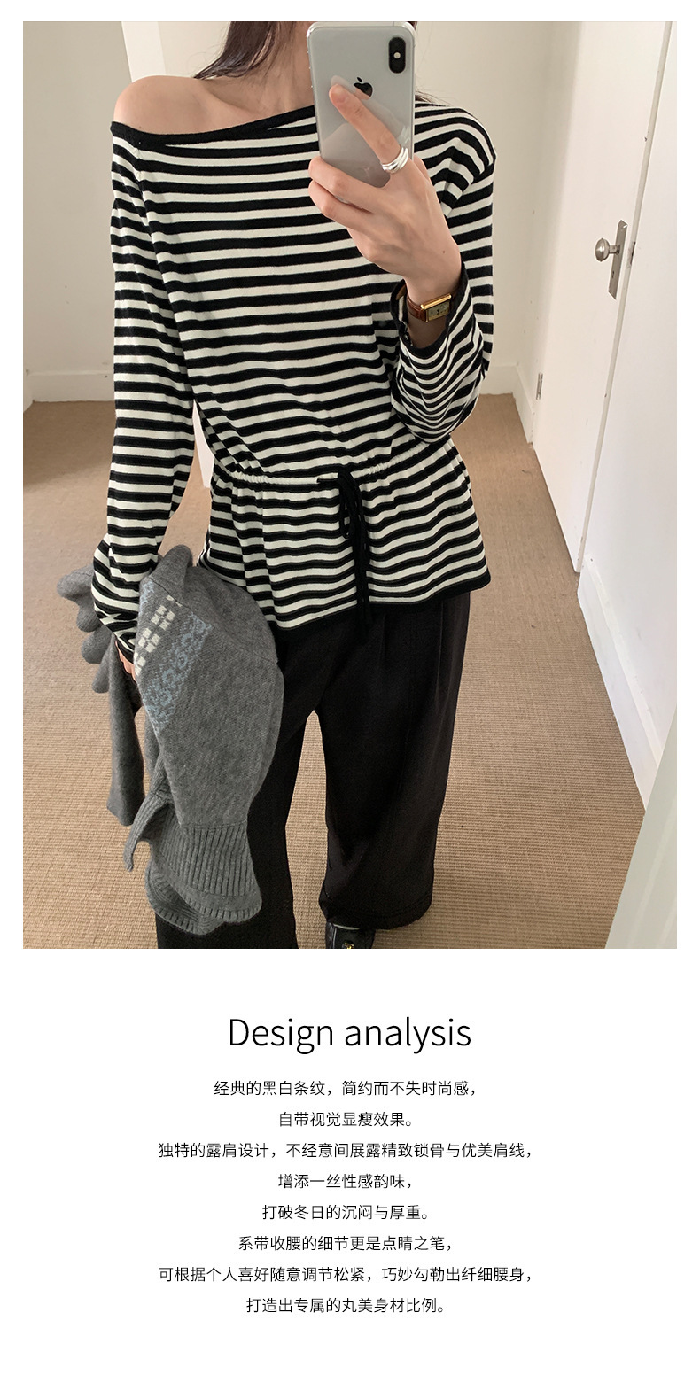 *o-ha-you*【FHZH1EE5041003】慵懶風繫帶收腰露肩條紋針織衫女2025冬顯瘦打底衫上衣