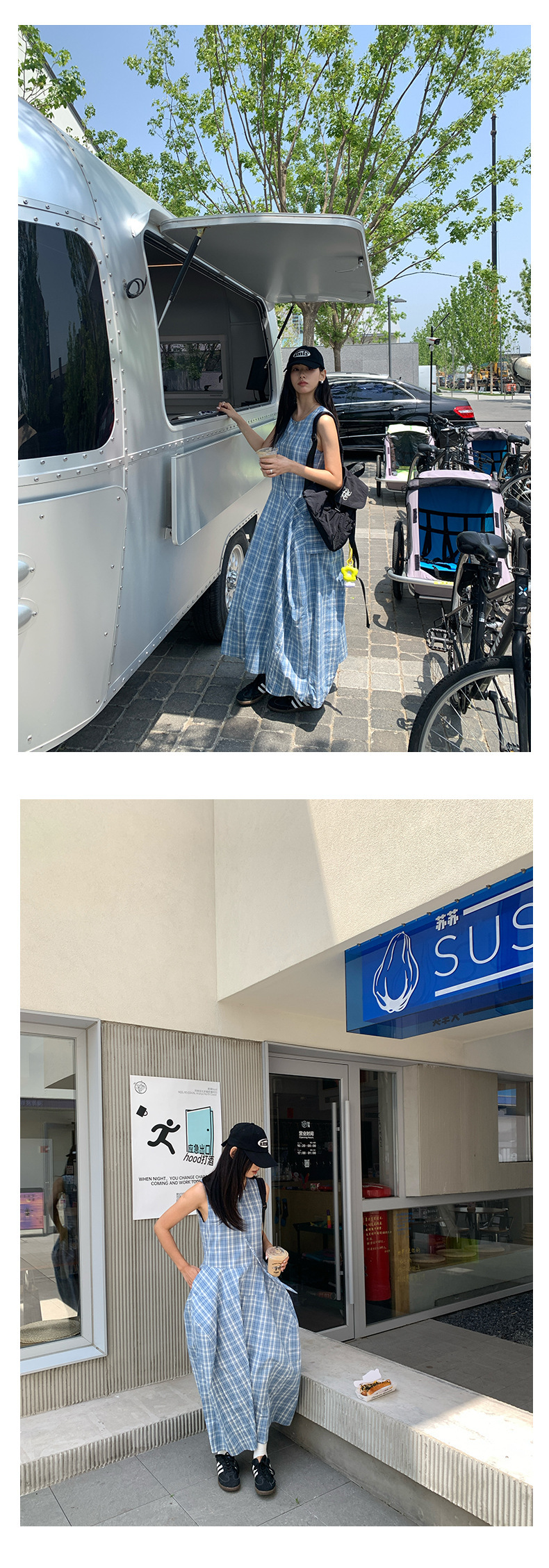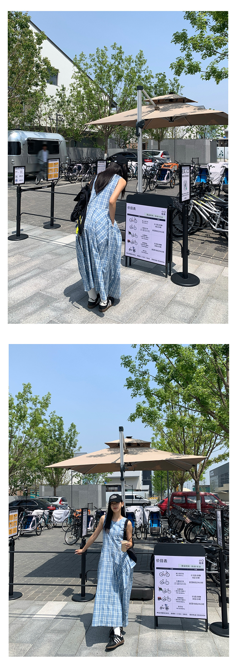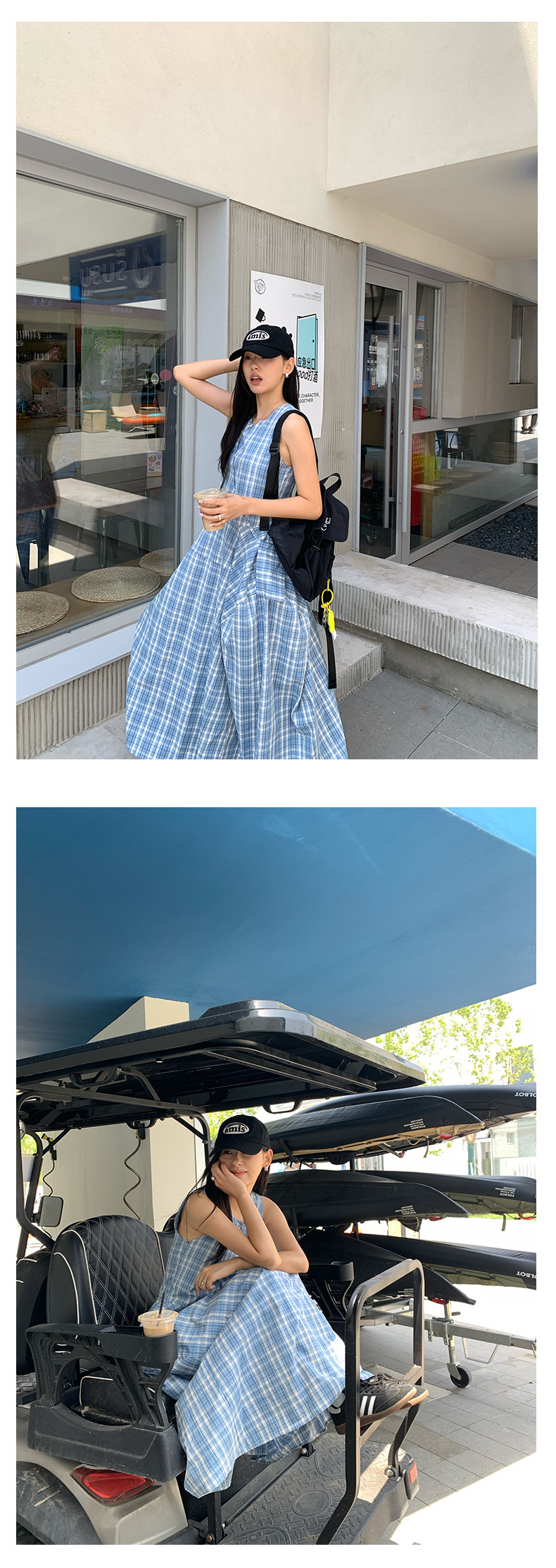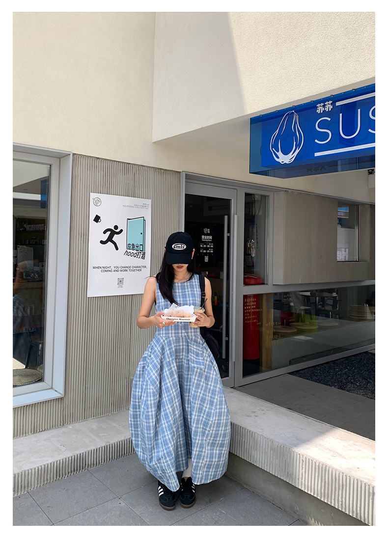 *o-ha-you*【FHZH1FA5020599】韓系田園風復古藍格無袖連衣裙甜美減齡花苞收腰長裙洋裝-如有需要請先諮詢