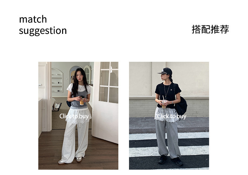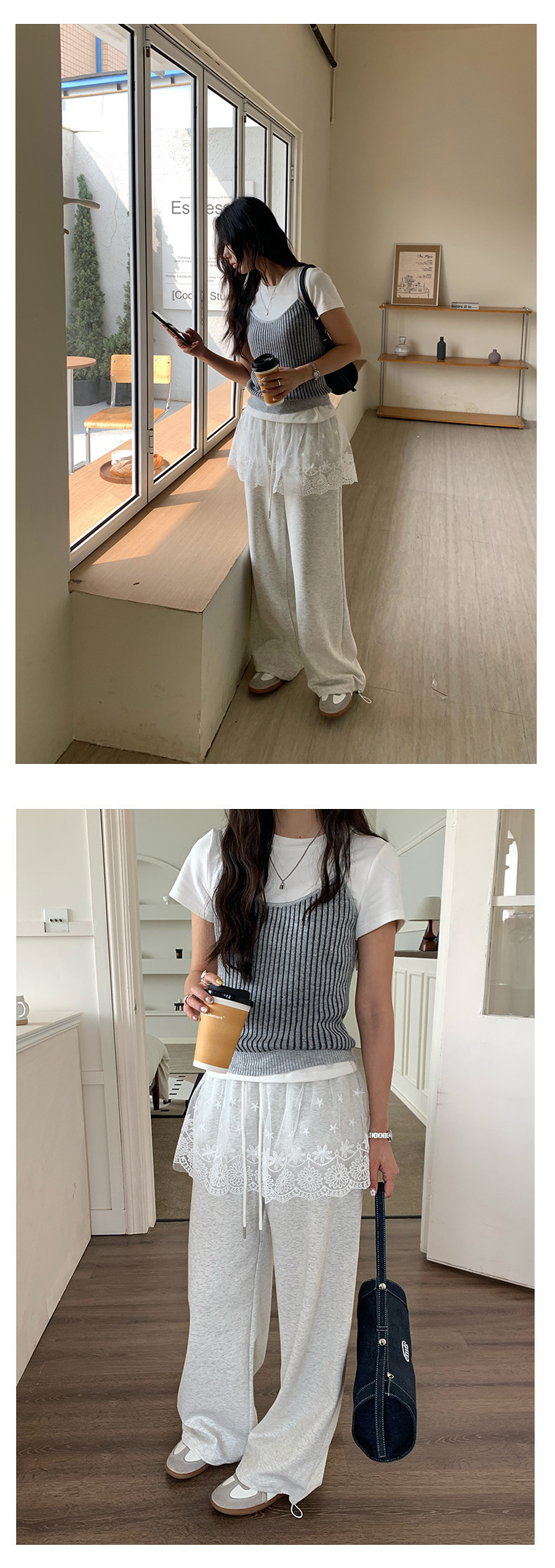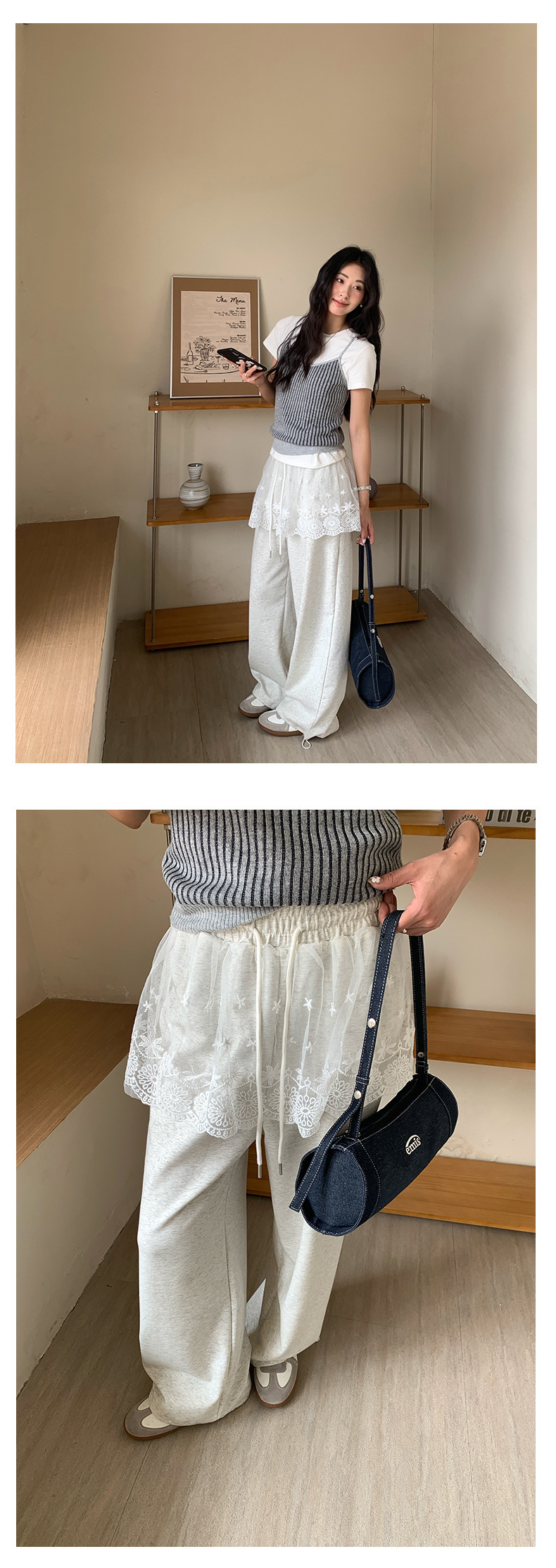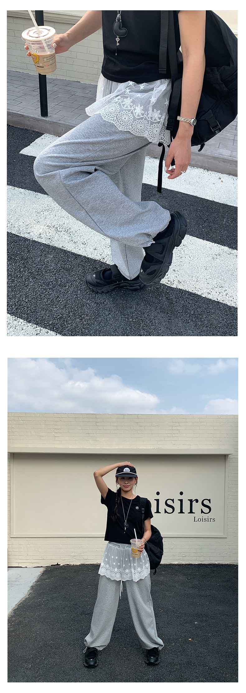 *o-ha-you*【FHZH1GF5010210】蕾絲網紗拼接抽繩闊腿休閒女褲2025春款舒適慵懶風衛褲-2色-如有需要請先諮詢