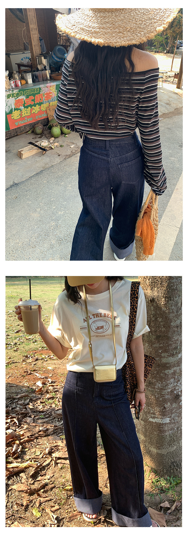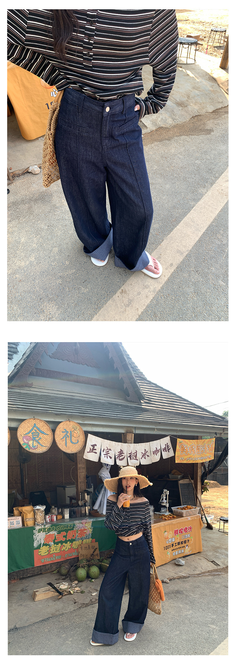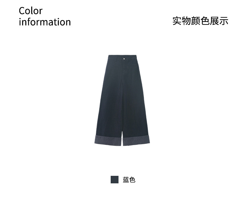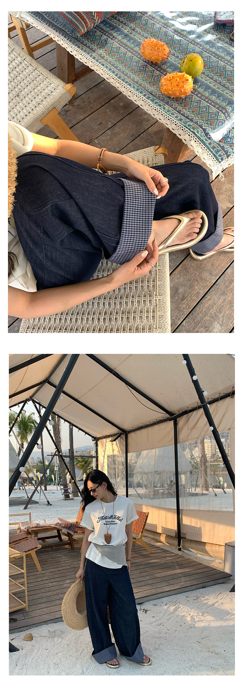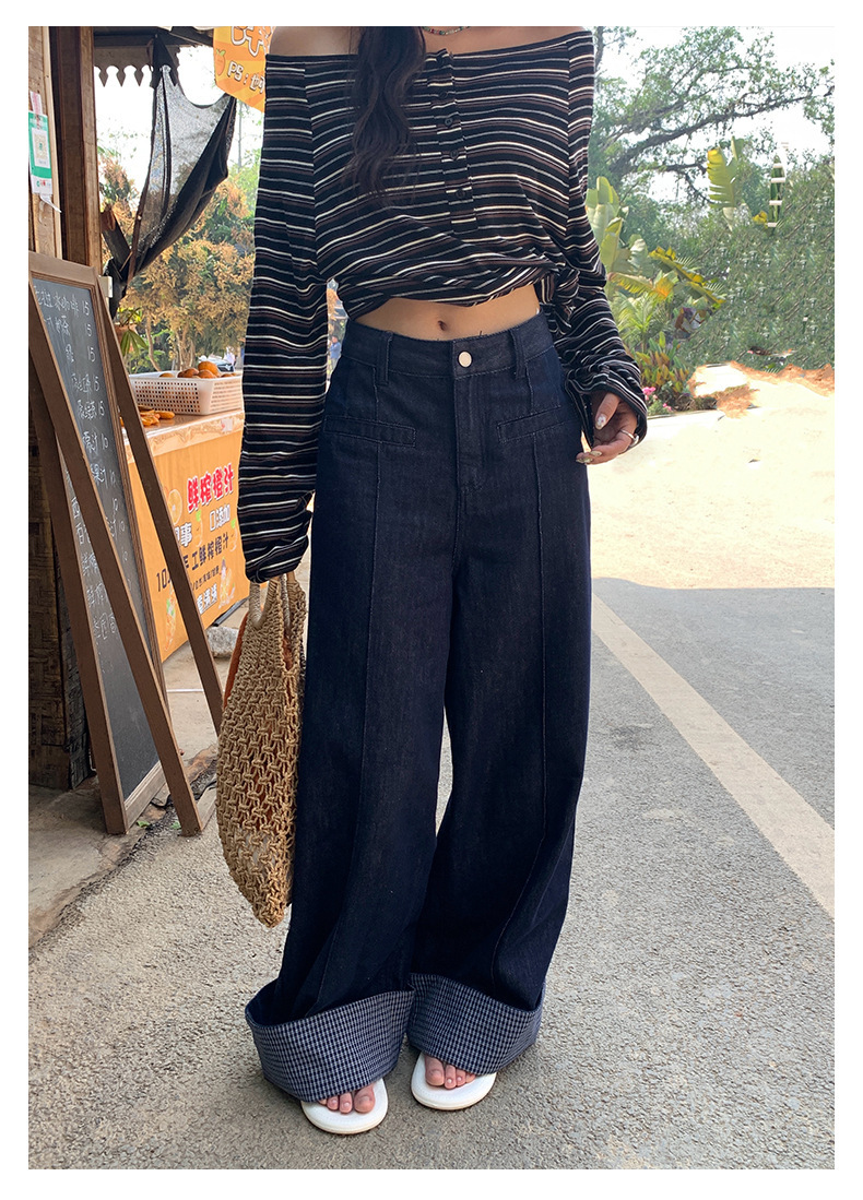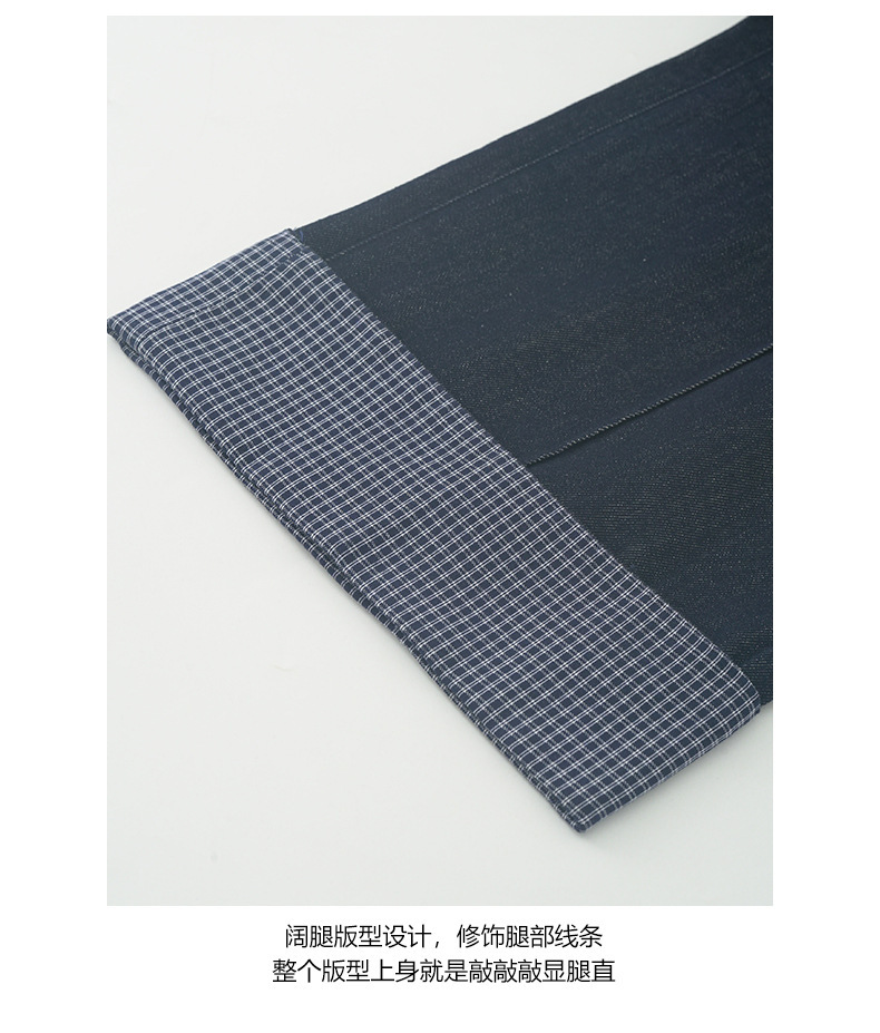 *o-ha-you*【FHZH1HA5020095】格紋褲腳拼接高腰闊腿牛仔褲2025夏款顯瘦時尚款
