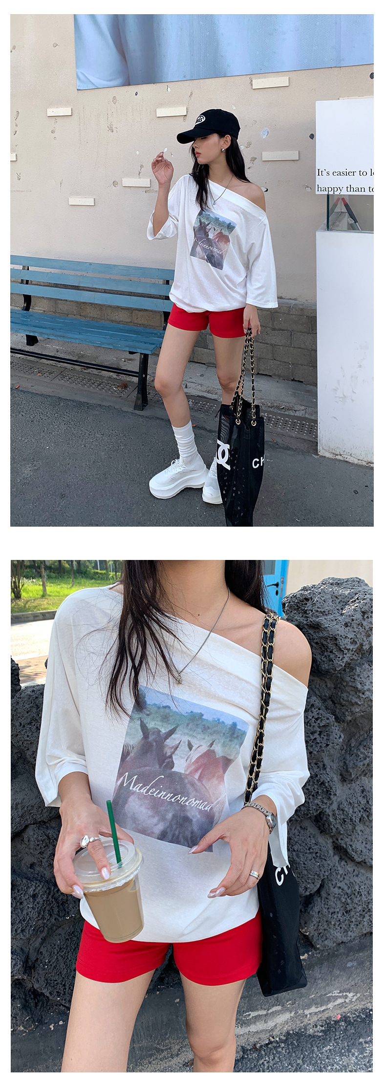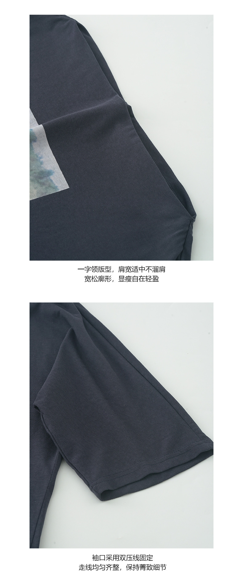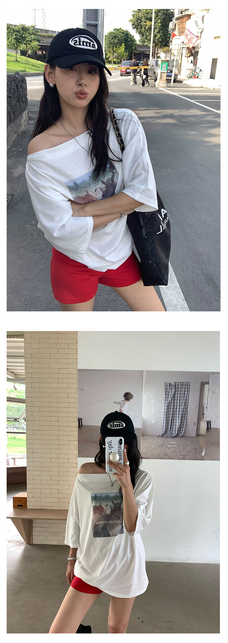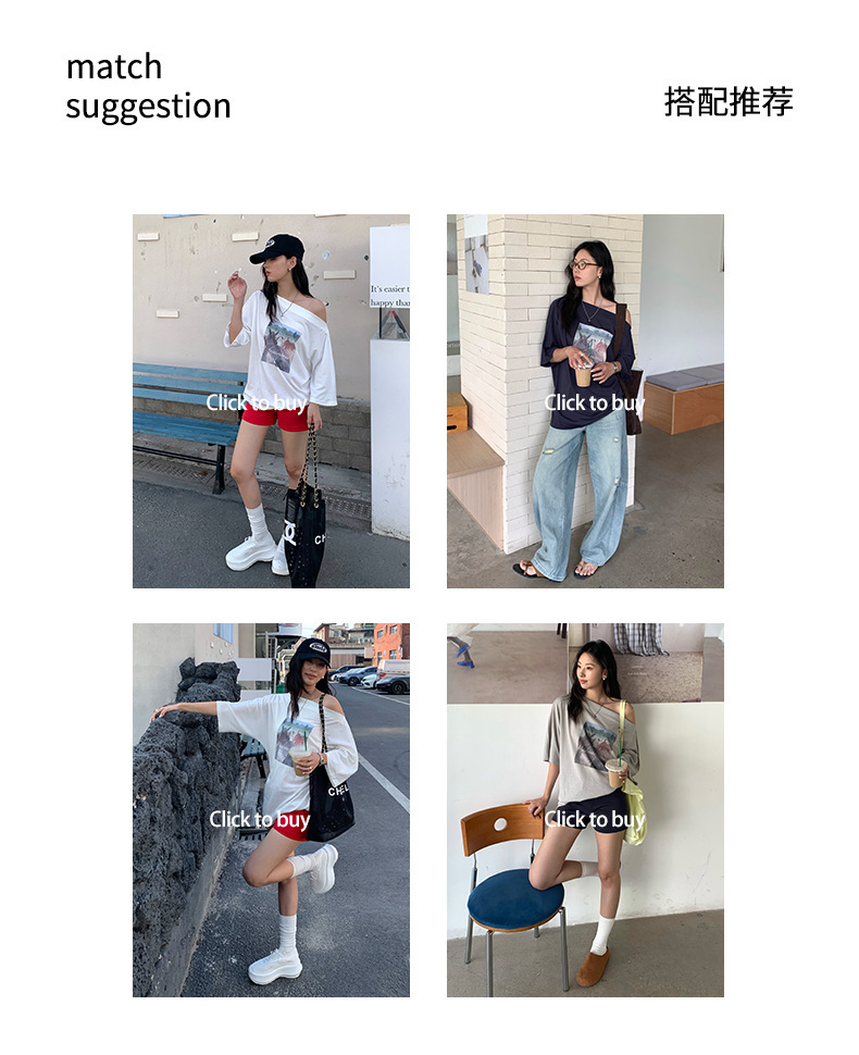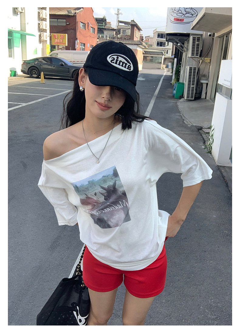 *o-ha-you*【FHZH2DA5020587】韓版夏季新款復古做舊風景印花百搭露肩斜肩短袖T恤-2色-如有需要請先諮詢