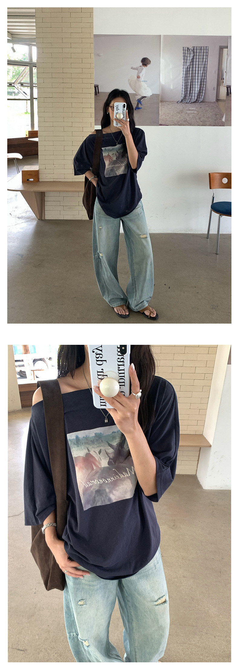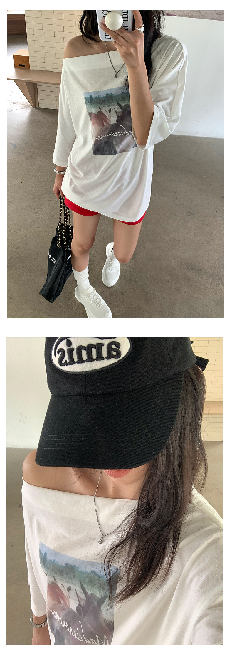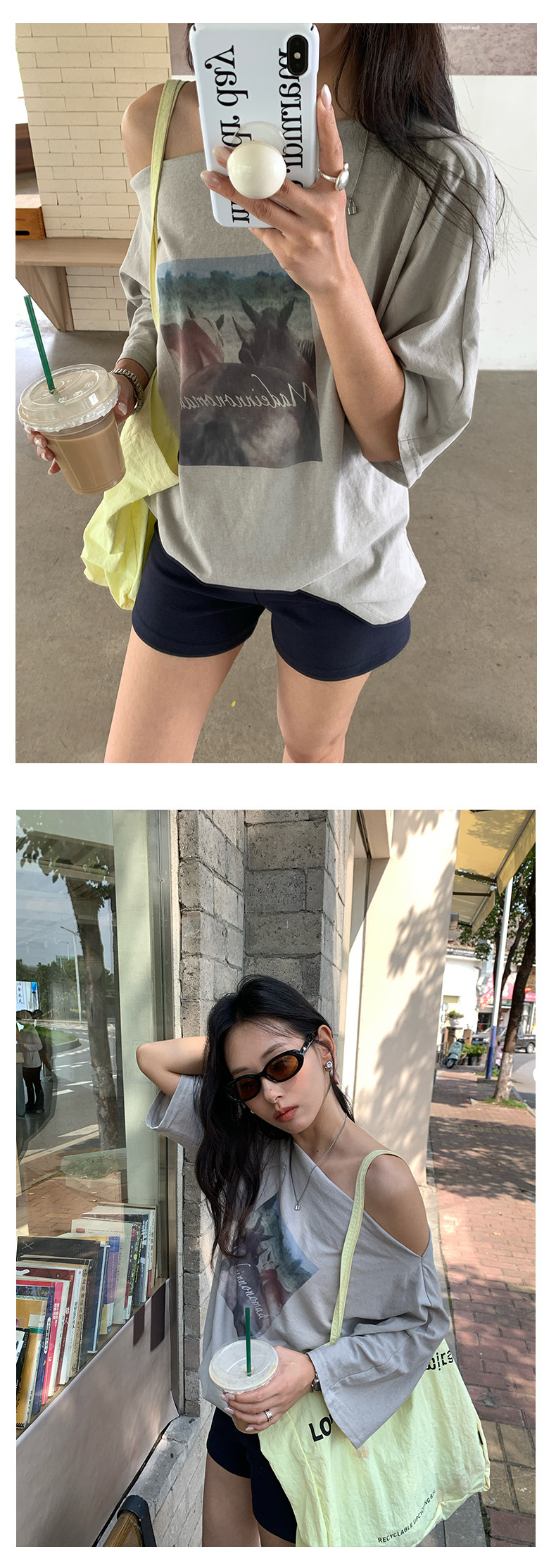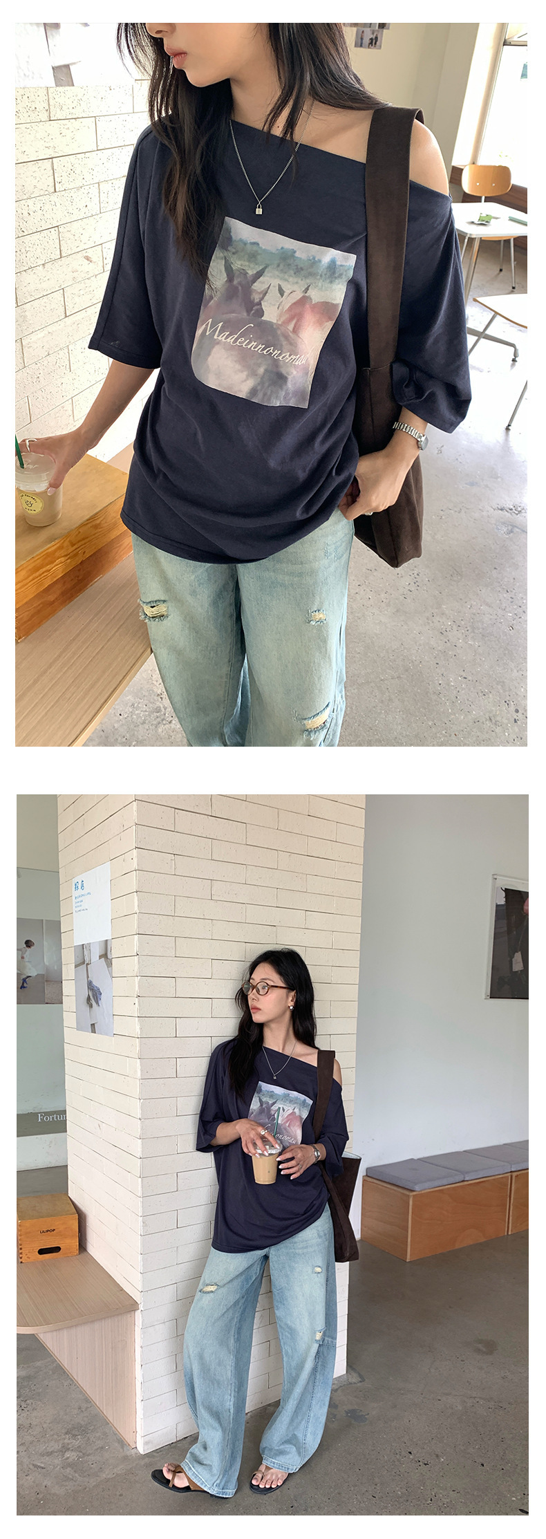 *o-ha-you*【FHZH2DA5020587】韓版夏季新款復古做舊風景印花百搭露肩斜肩短袖T恤-2色-如有需要請先諮詢