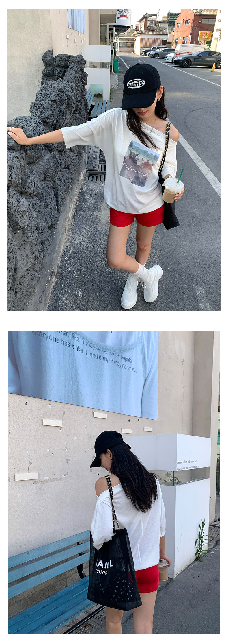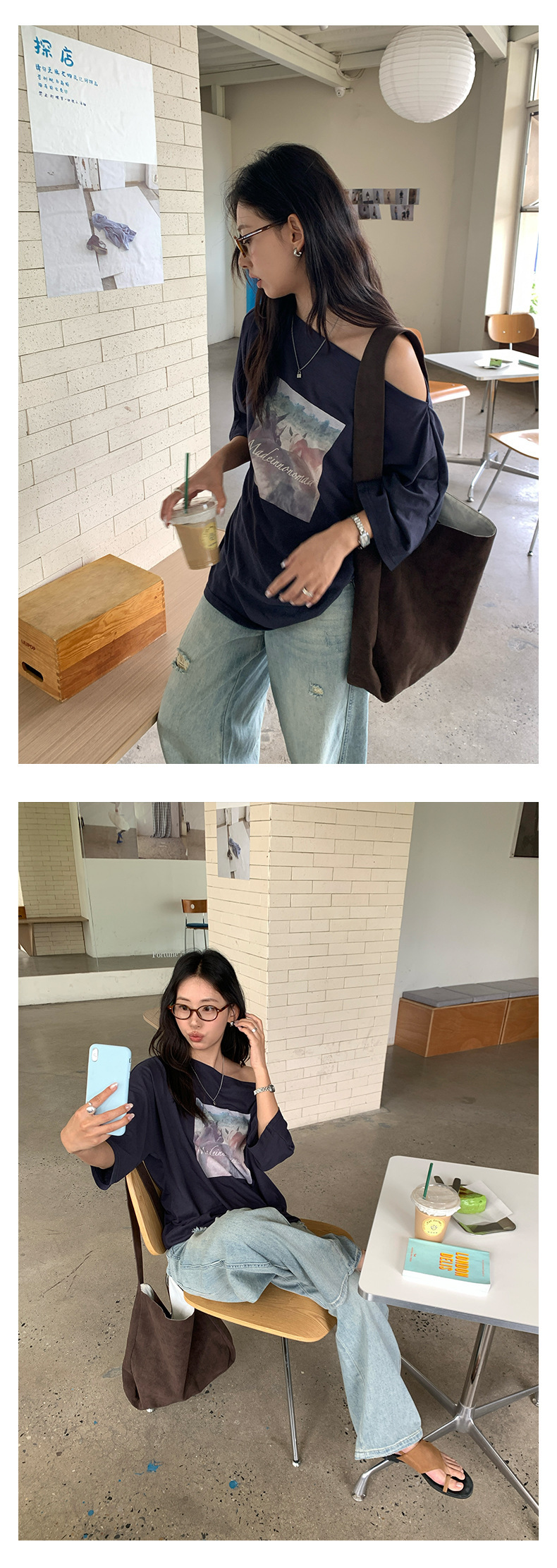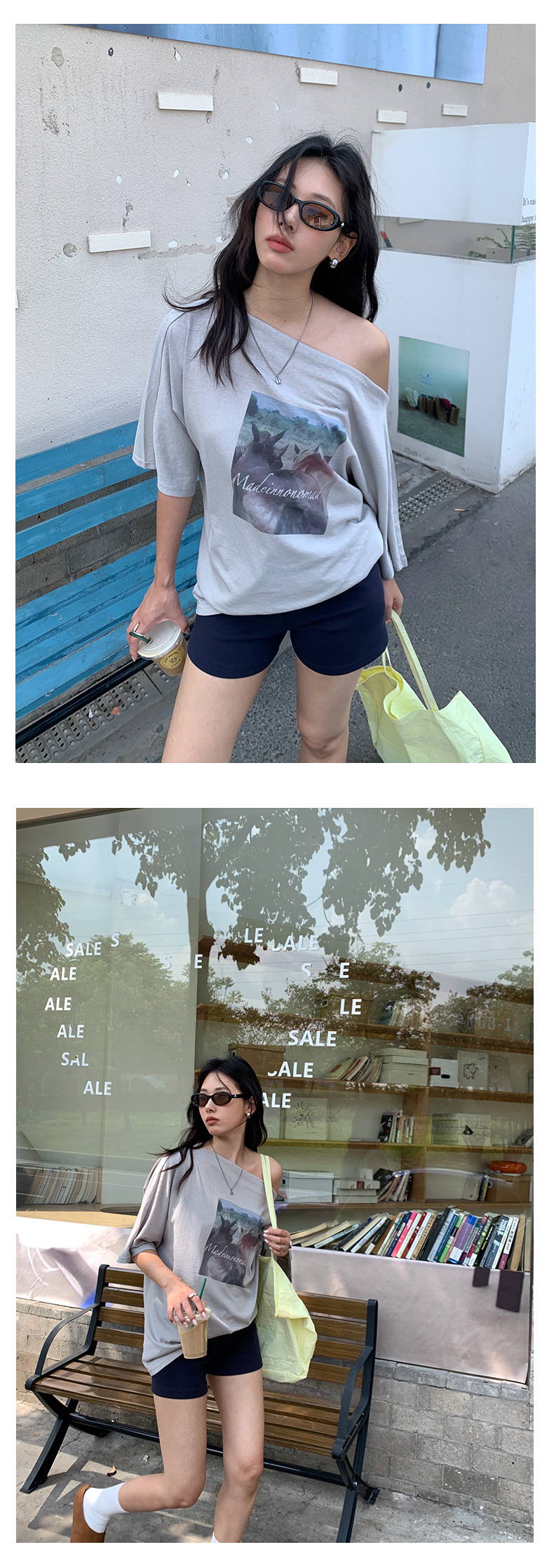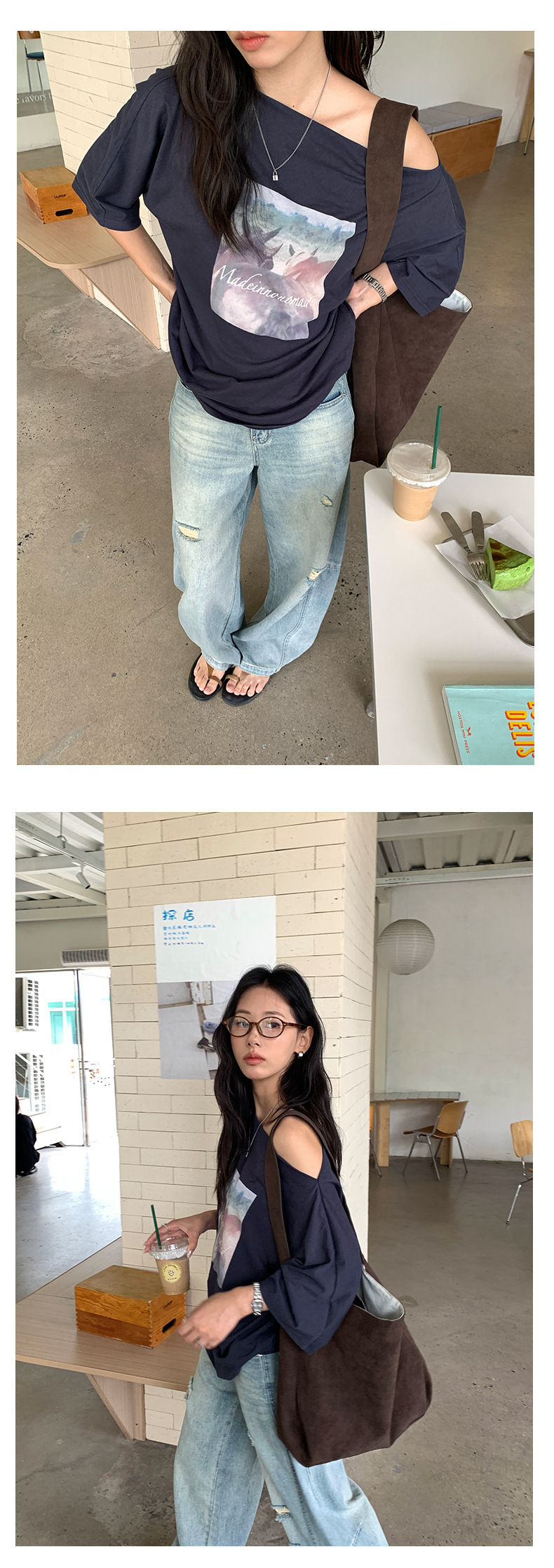 *o-ha-you*【FHZH2DA5020587】韓版夏季新款復古做舊風景印花百搭露肩斜肩短袖T恤-2色-如有需要請先諮詢