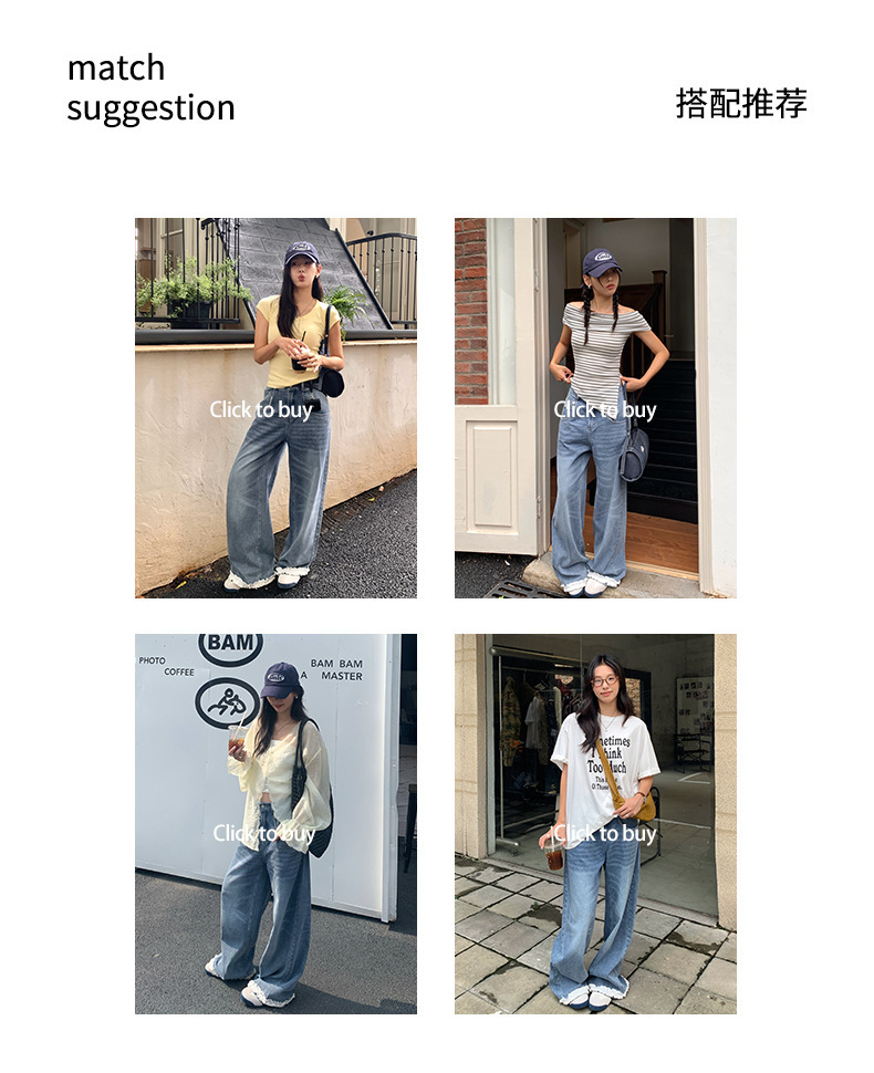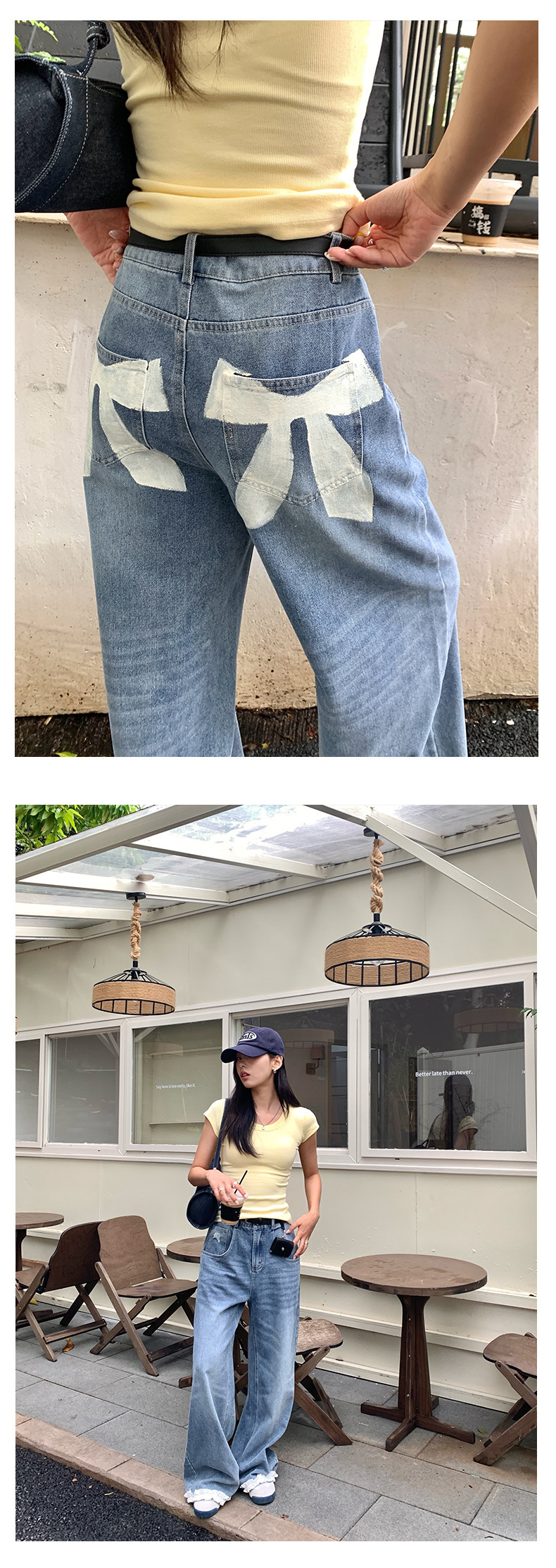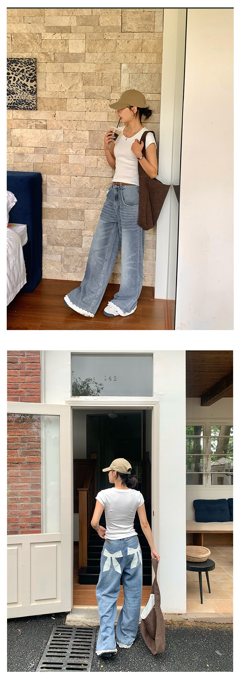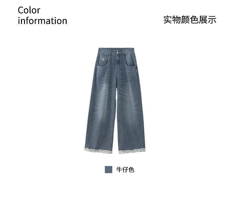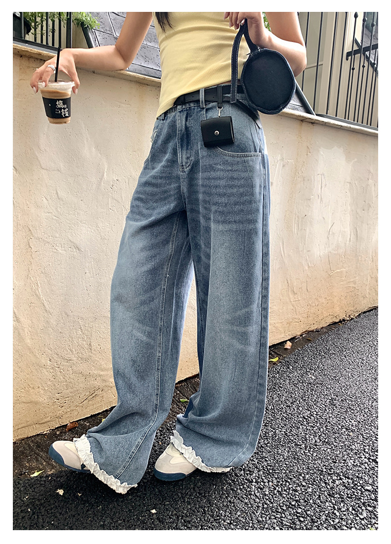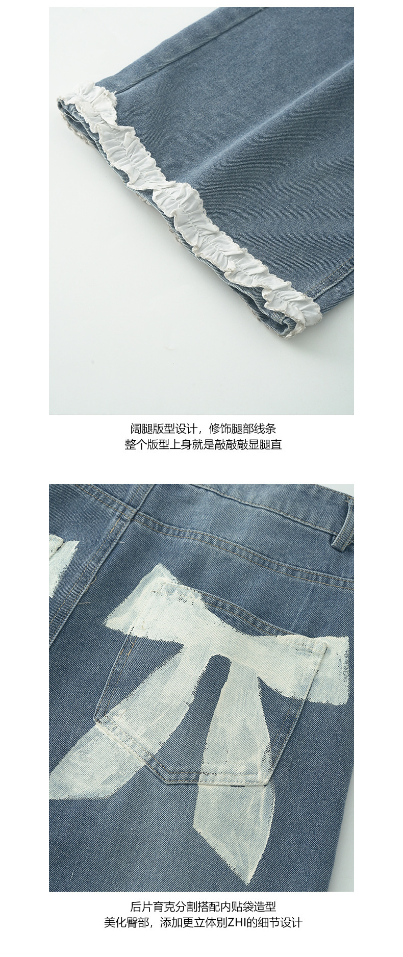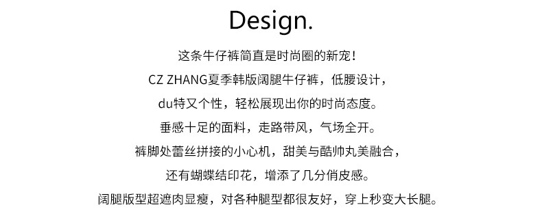 *o-ha-you*【FHZH2HA5020499】韓版夏季新款蝴蝶印花低腰垂感闊腿褲蕾絲拼接牛仔褲-如有需要請先諮詢