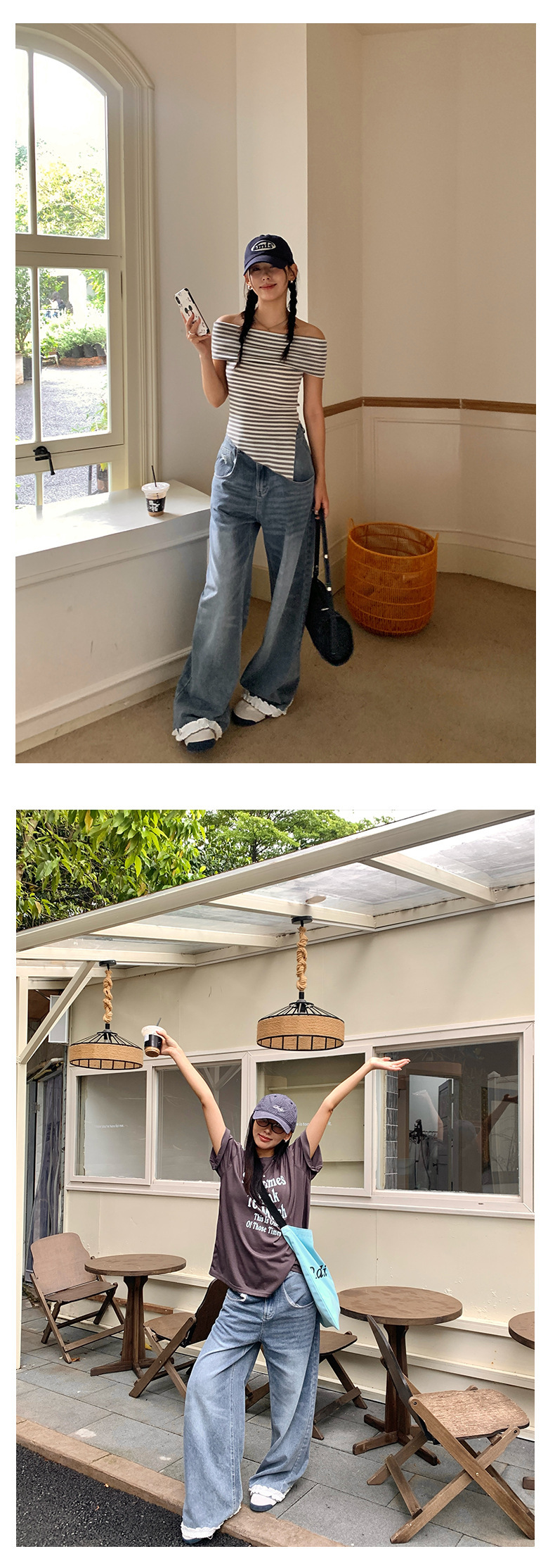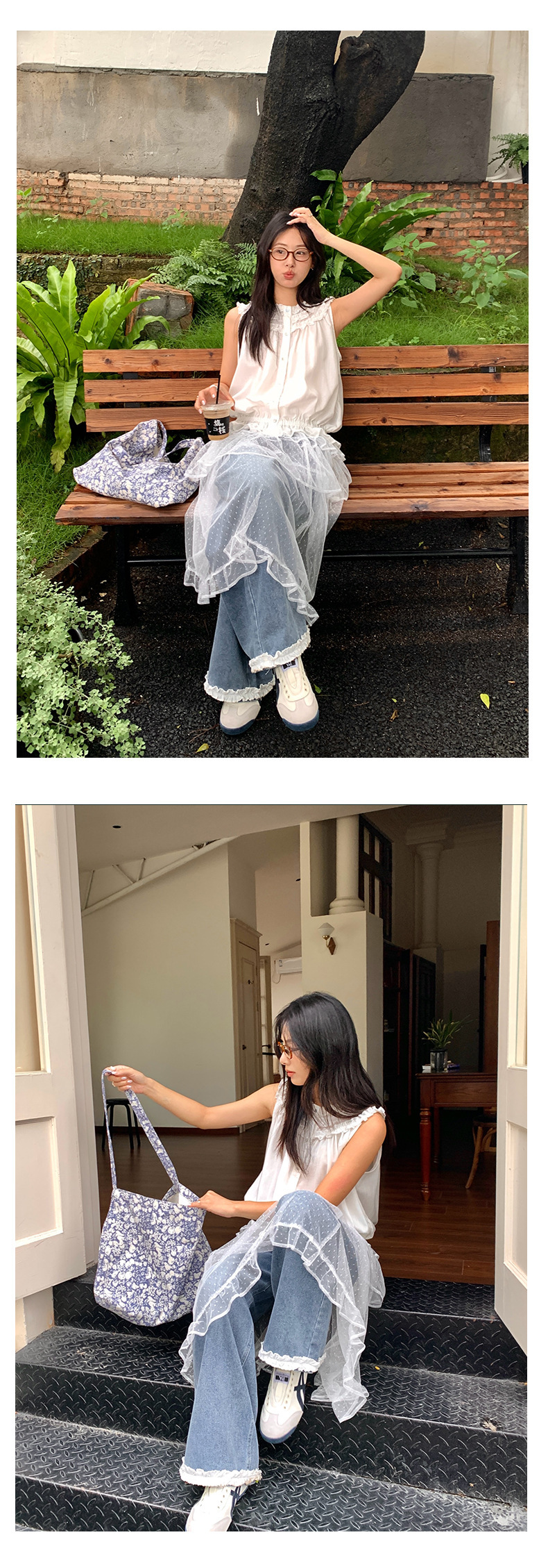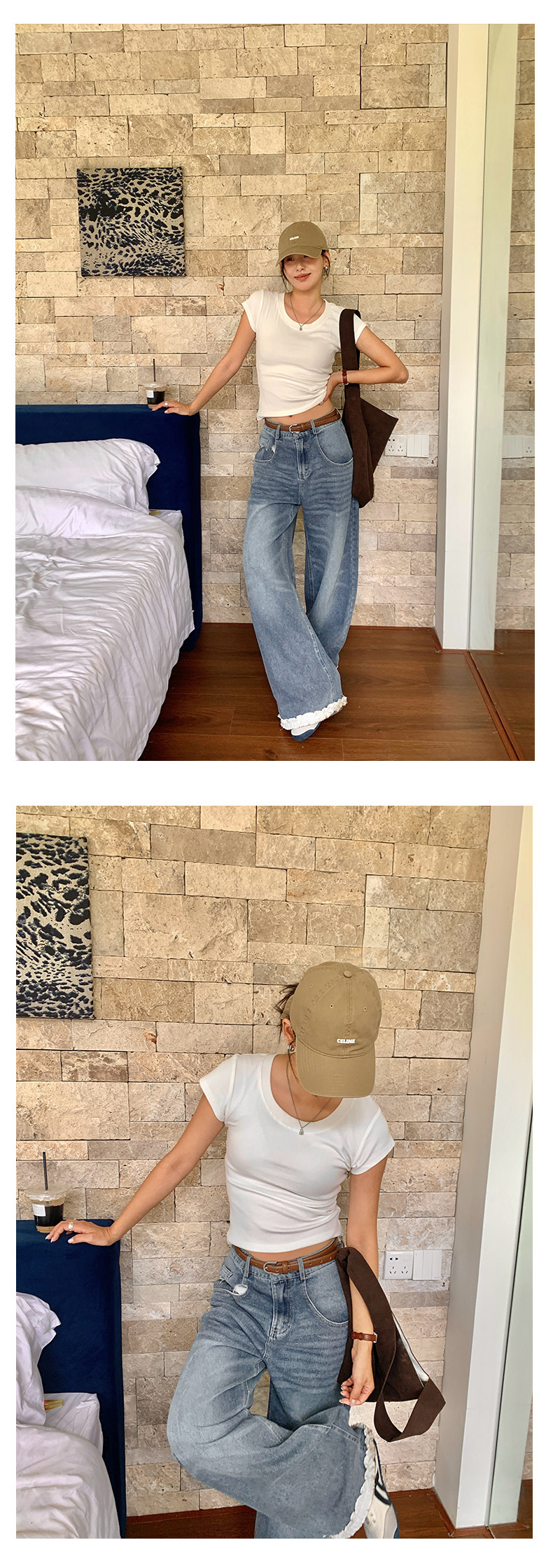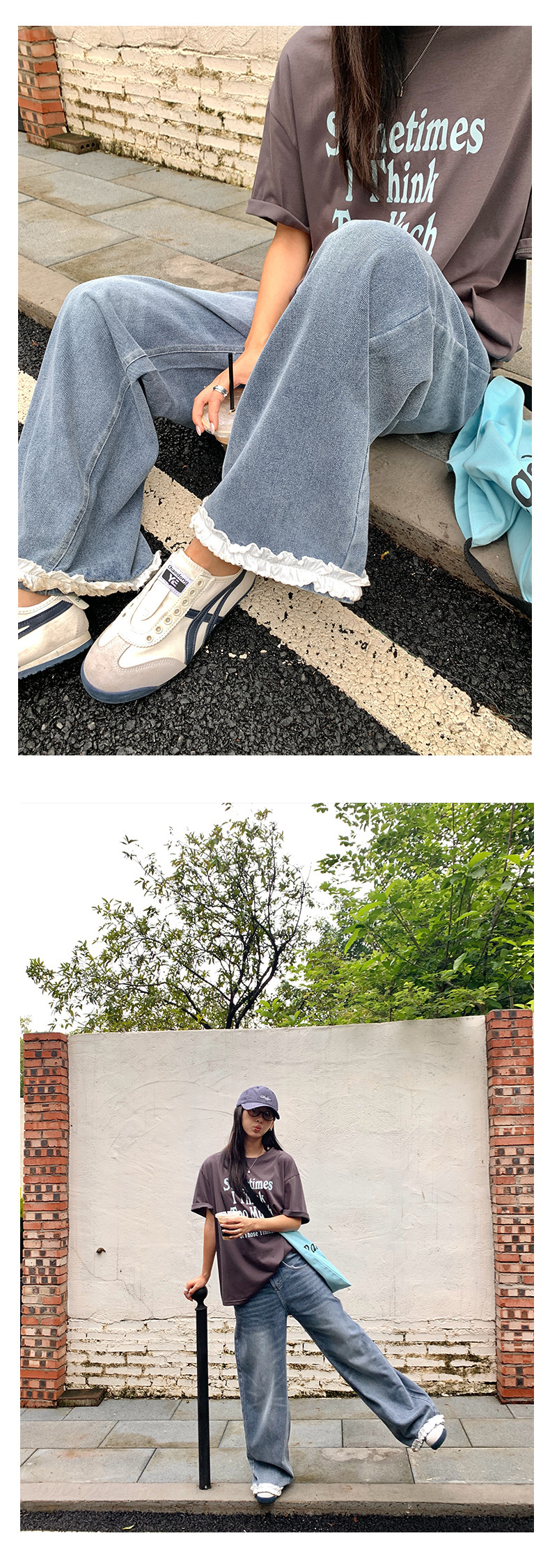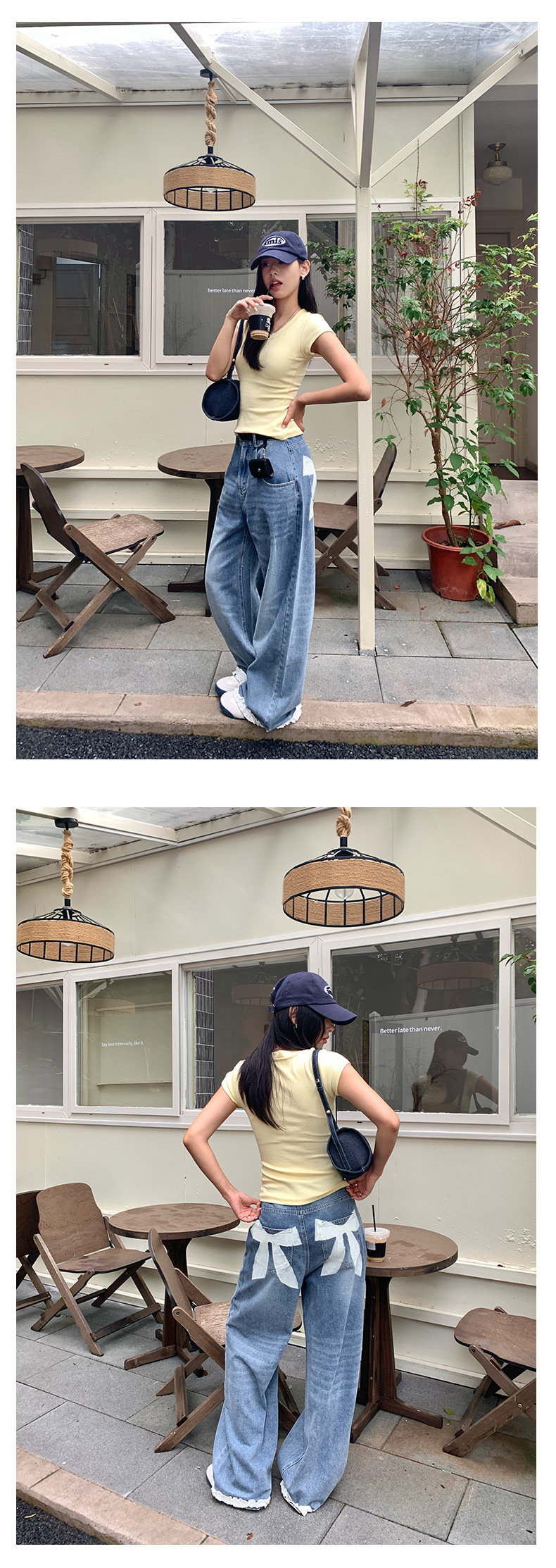 *o-ha-you*【FHZH2HA5020499】韓版夏季新款蝴蝶印花低腰垂感闊腿褲蕾絲拼接牛仔褲-如有需要請先諮詢