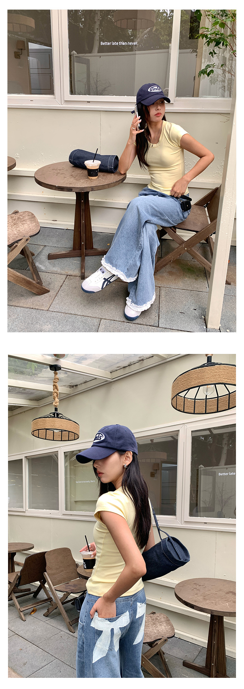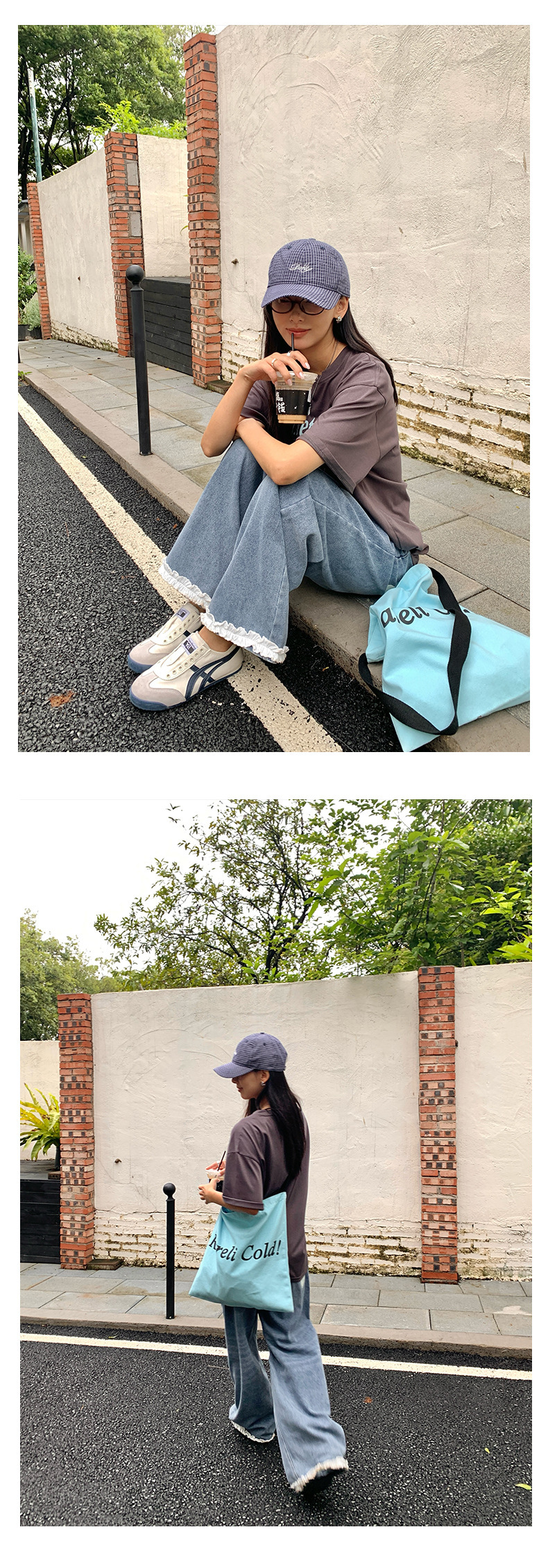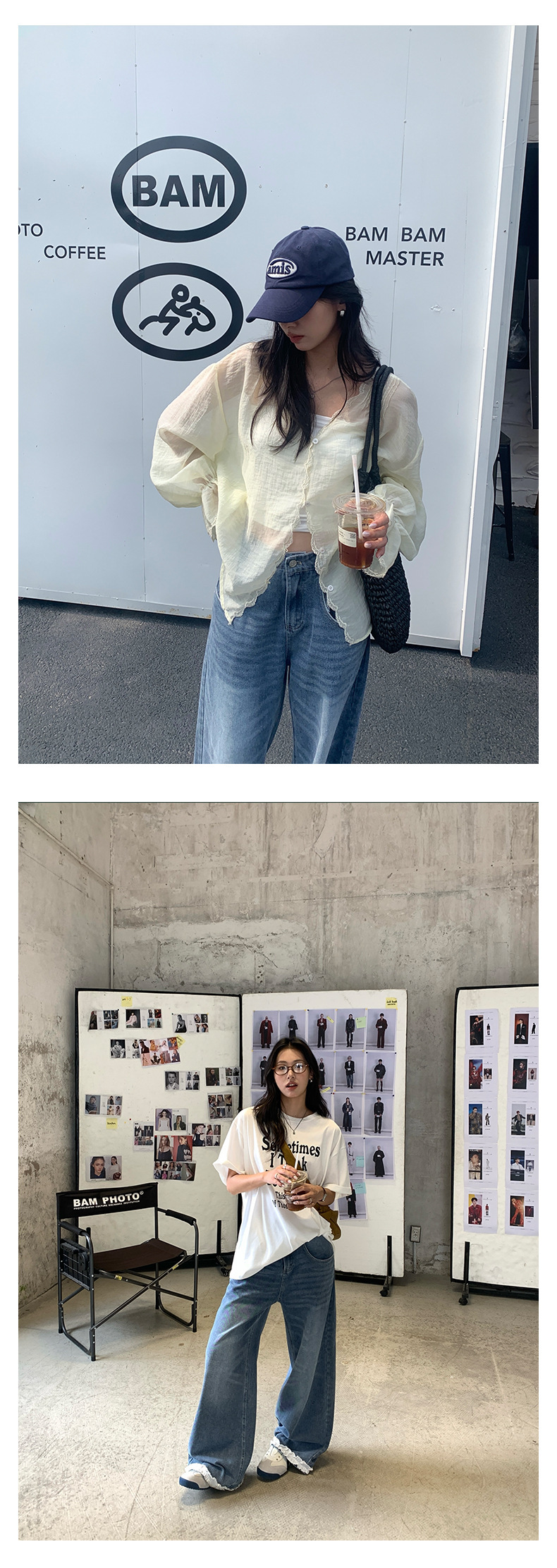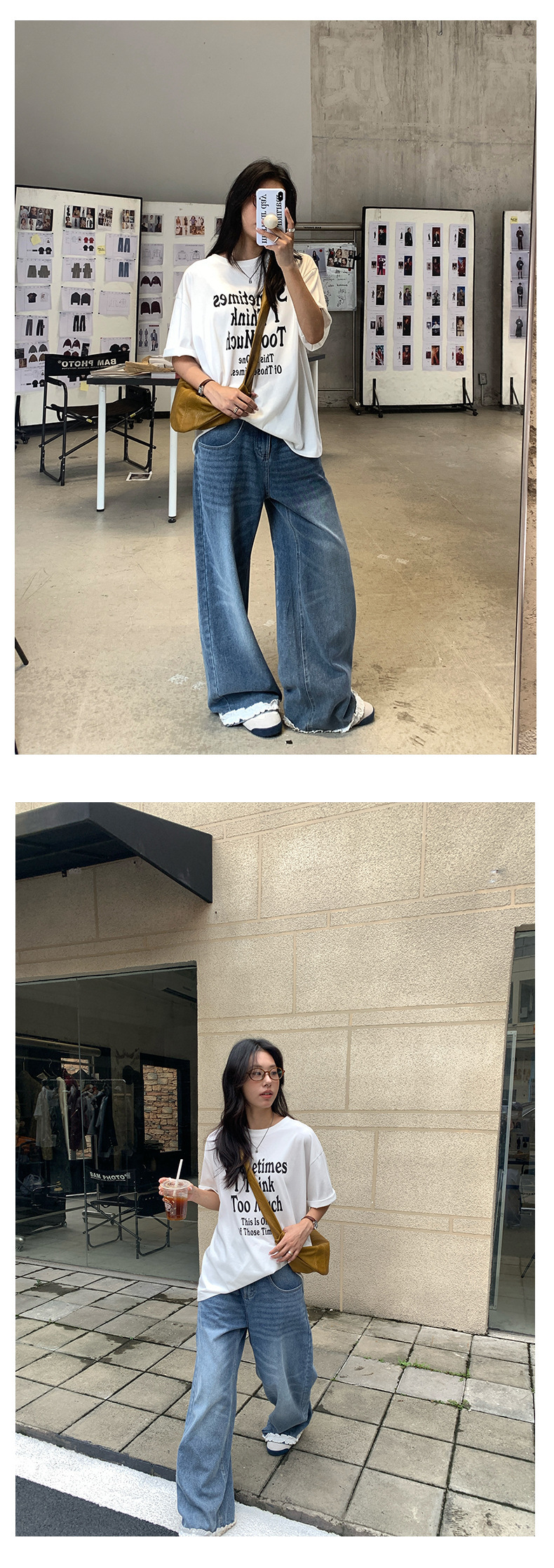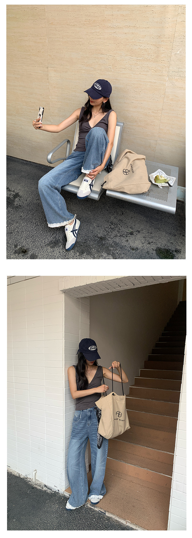 *o-ha-you*【FHZH2HA5020499】韓版夏季新款蝴蝶印花低腰垂感闊腿褲蕾絲拼接牛仔褲-如有需要請先諮詢
