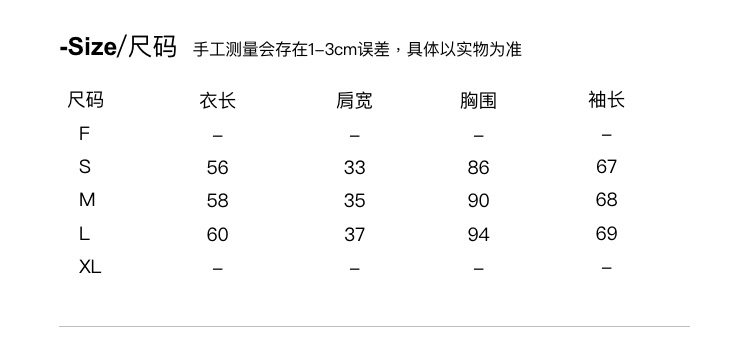 衣長/肩寬/袖長為平量,其他為一圈(單位:公分)