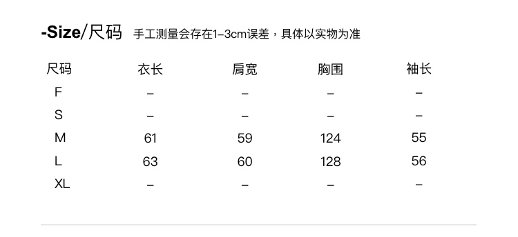 衣長/肩寬/袖長為平量,其他為一圈(單位:公分)