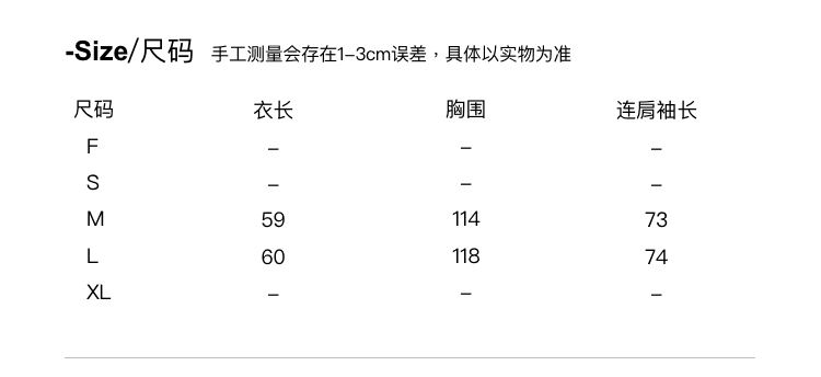 衣長/肩寬/袖長為平量,其他為一圈(單位:公分)