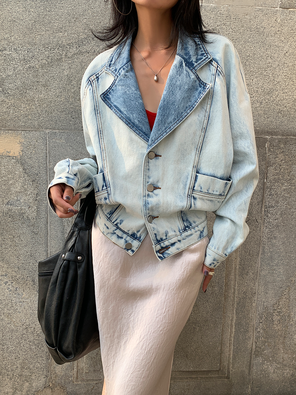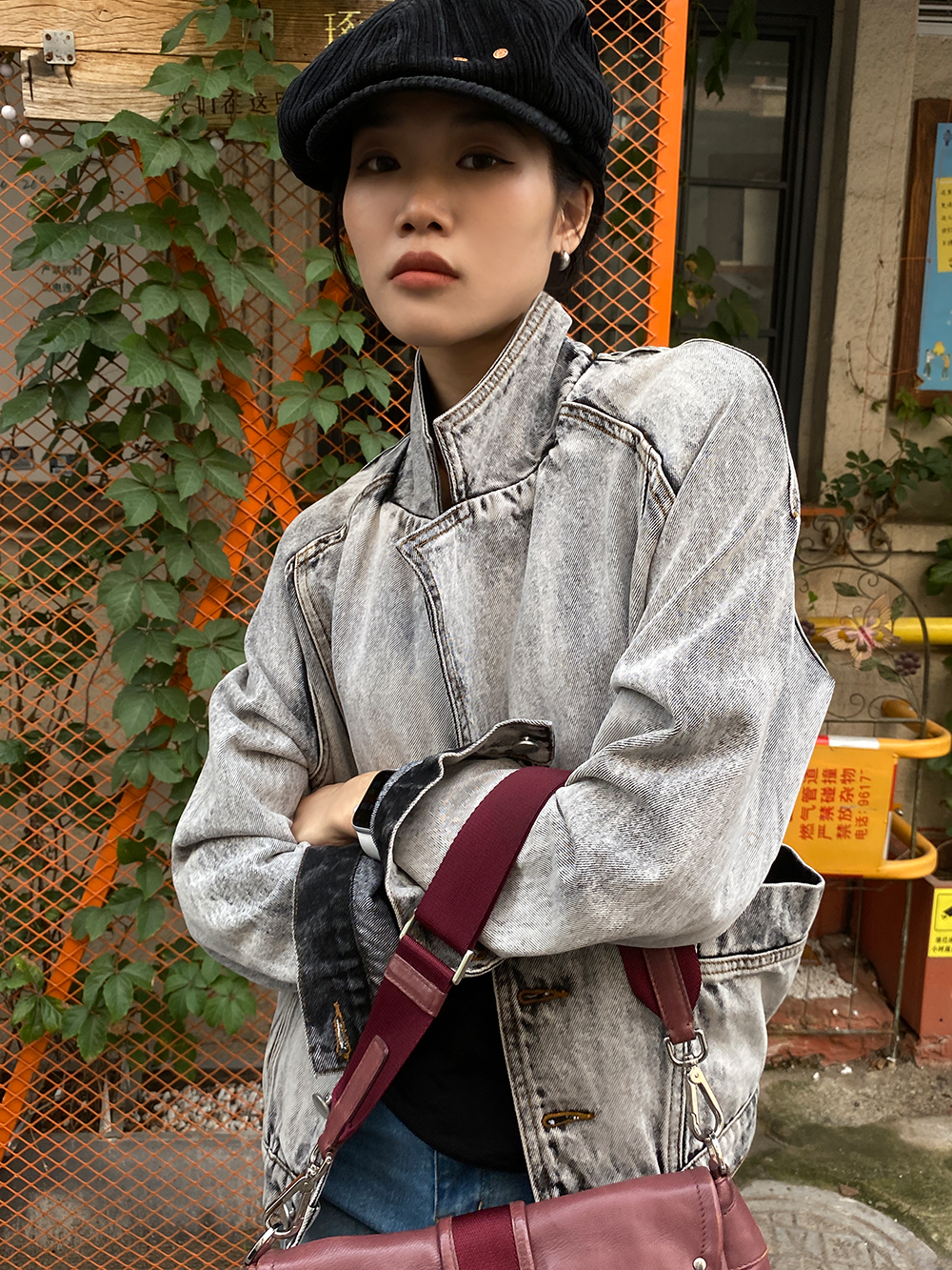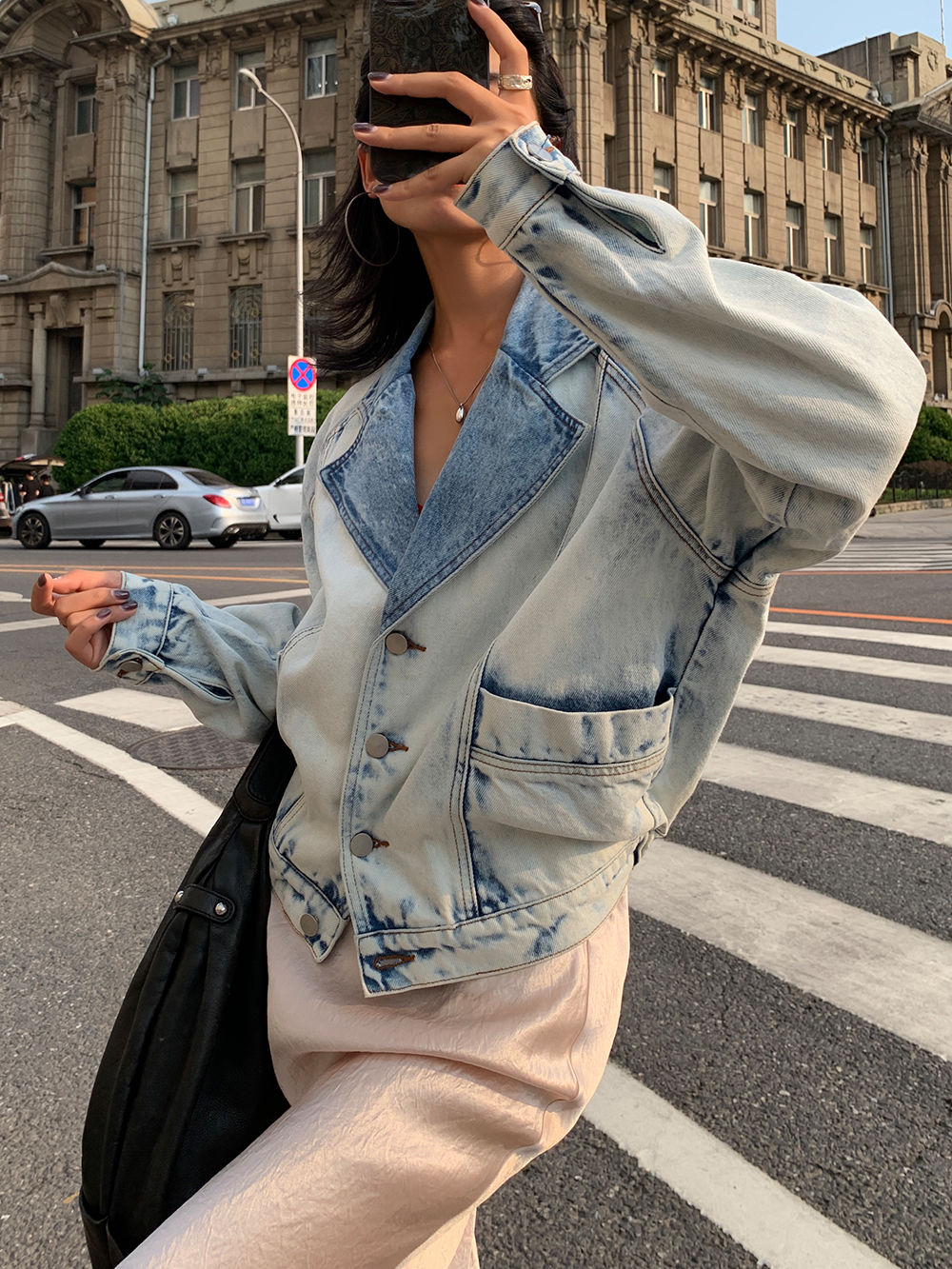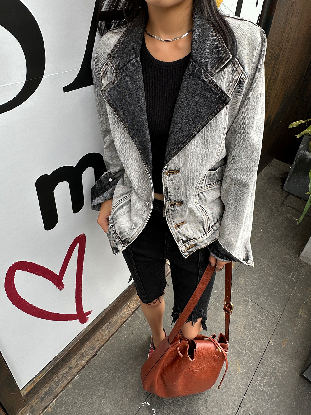 *o-ha-you*【FLCT1636】復古水洗做舊牛仔外套秋季新款拼色西裝領寬鬆休閒長袖機車夾克-2色